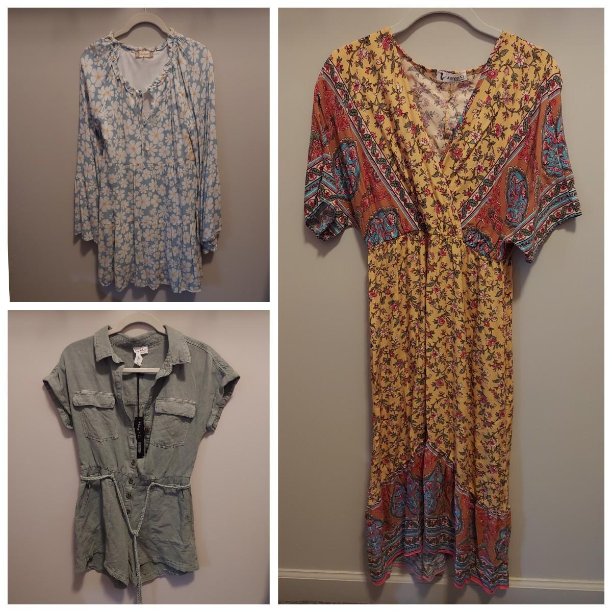 Lot includes 25+ dresses and tunic tops in mostly size small. Some pieces are new with tags. Contains several Anthropologie house brands plus Nicole Miller, Altar'd State, Umgee and more. Please see photos for details. Shipping available