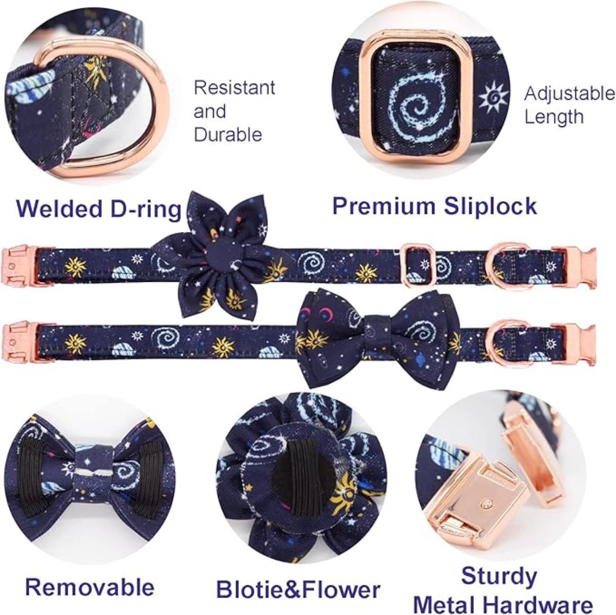 Navy Blue Sun Space Star Printed Small Dog Collar w/Matching Leash, Bowtie & Flower Rose Gold Hardware