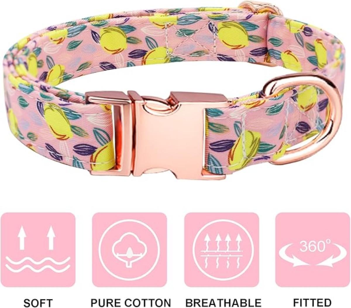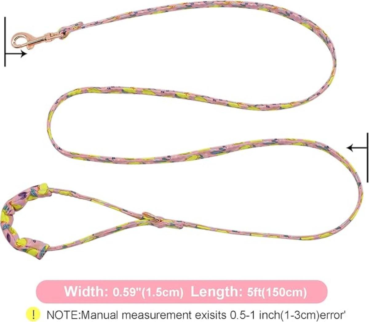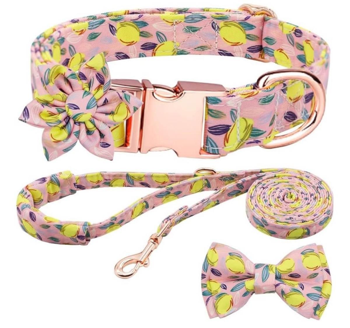 Size Small Pink & Yellow Lemon Printed Small Dog Collar w/Matching Leash, Bowtie & Flower Rose Gold Hardware