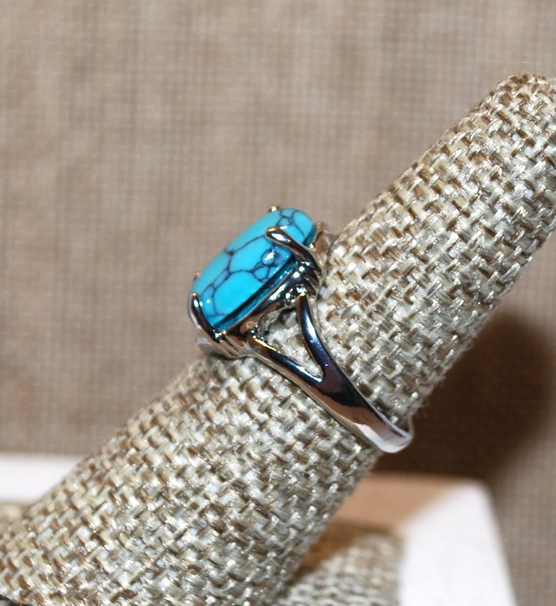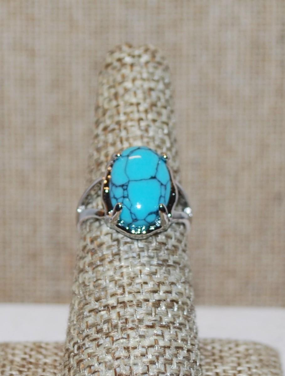 Size6½ Crackled Oval Turquoise Stone Ring on a Silver Tone Band (3.3g)