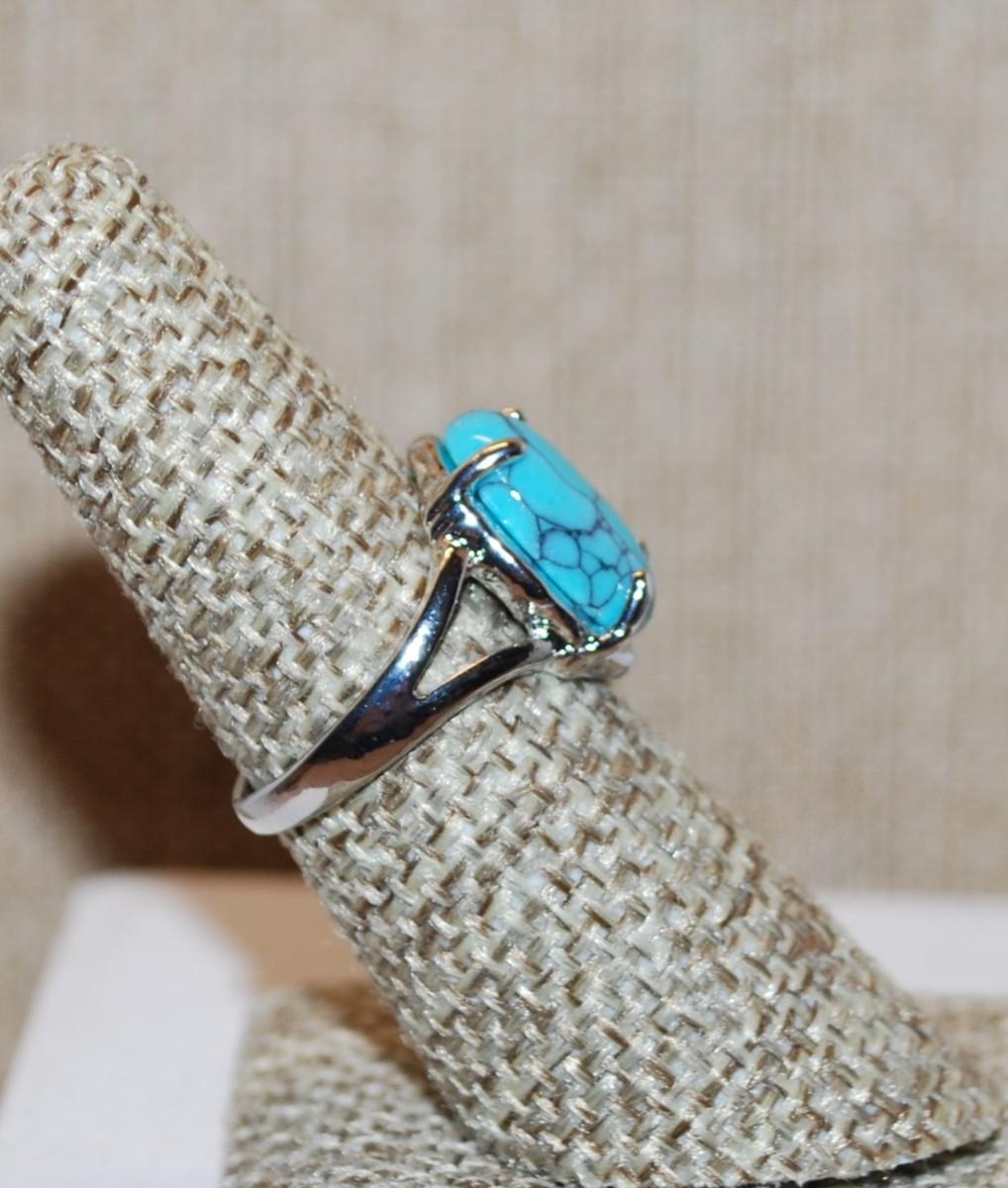 Size 6½ Crackled Oval Turquoise Stone Ring on a Silver Tone Band (3.3g)
