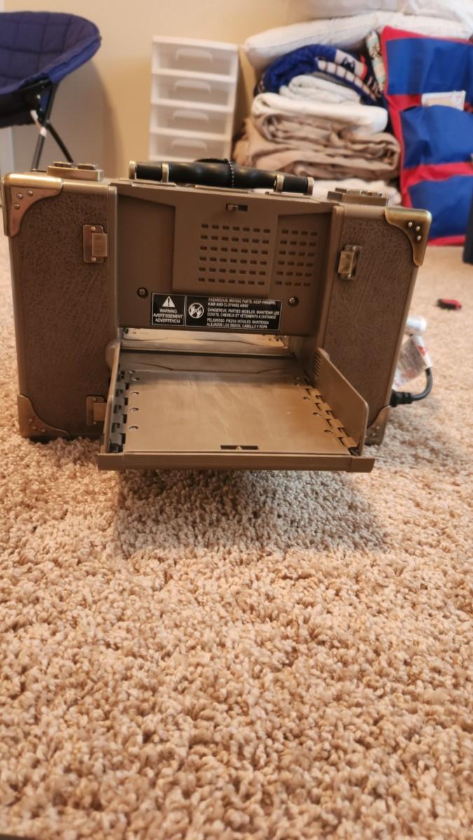 The Vagabond Machine measures approximately 12 1/2" x 4 5/8" x 9" (closed) and 15 1/4" x 12 1/2" x 10 1/4" (with handle up and doors open)