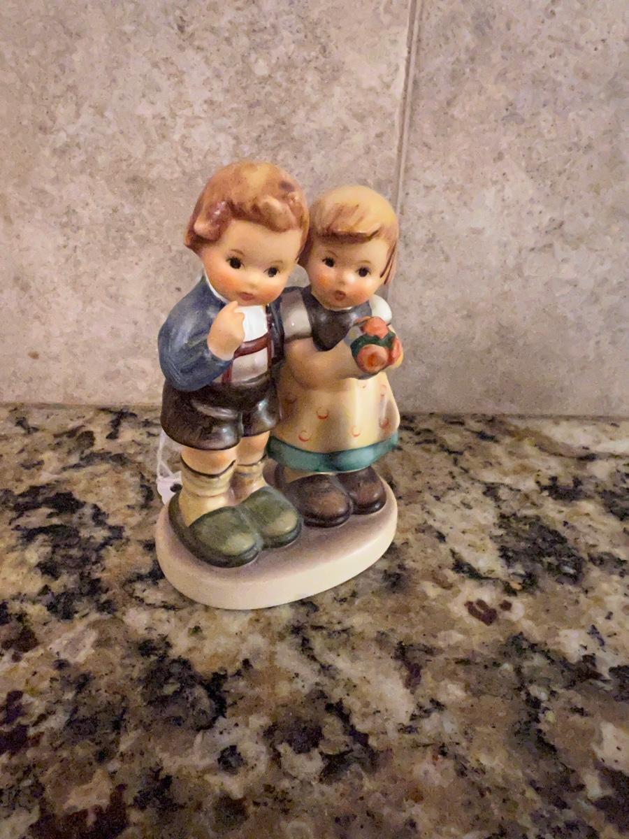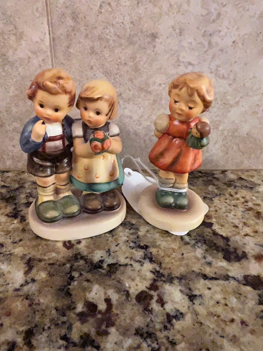 TWO MJ HUMMEL COLLECTABLES BOY AND GIRL CARRYING FLOWERS AND GIRL CARRYING A DOLL
