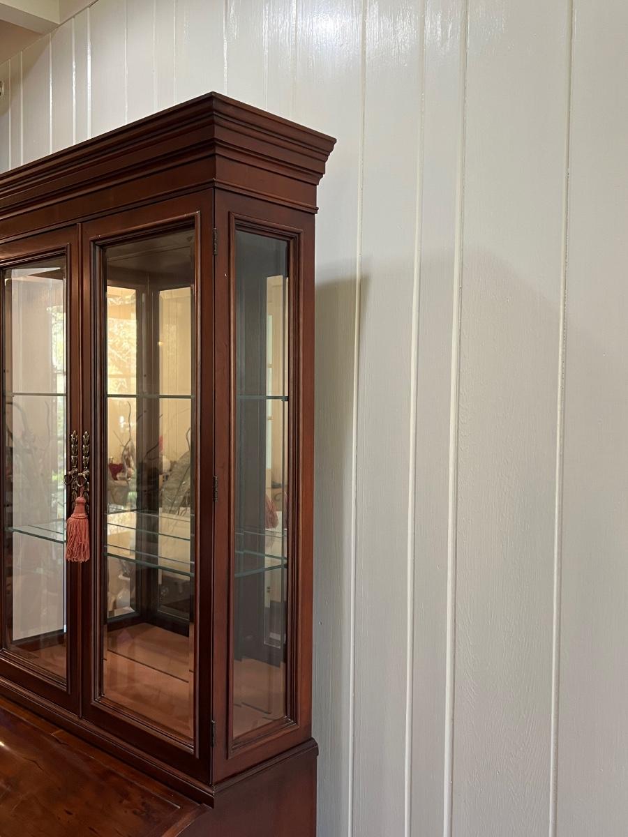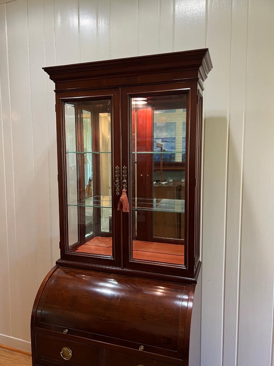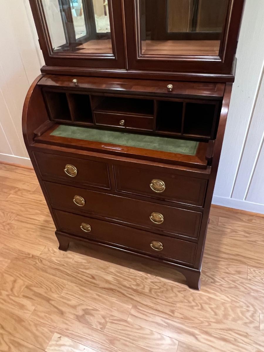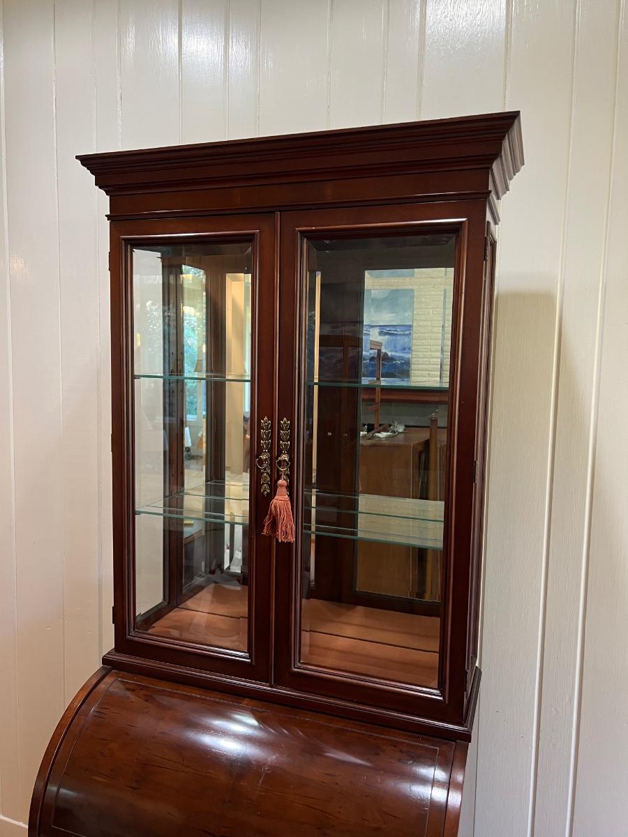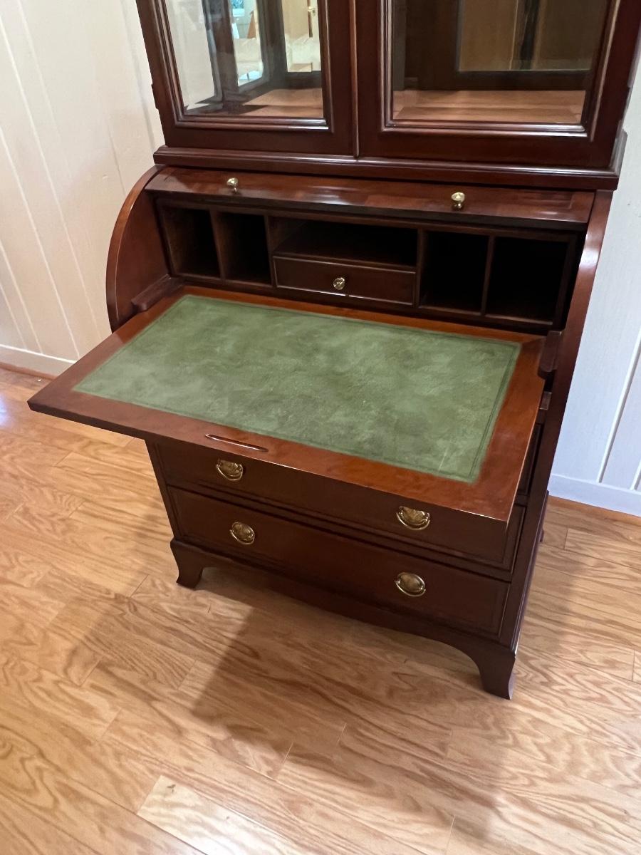 Two pieces ~ Has beveled glass doors & side panels ~ Green Leather Writing Surface ~ 78” H x 30” W x 19” D