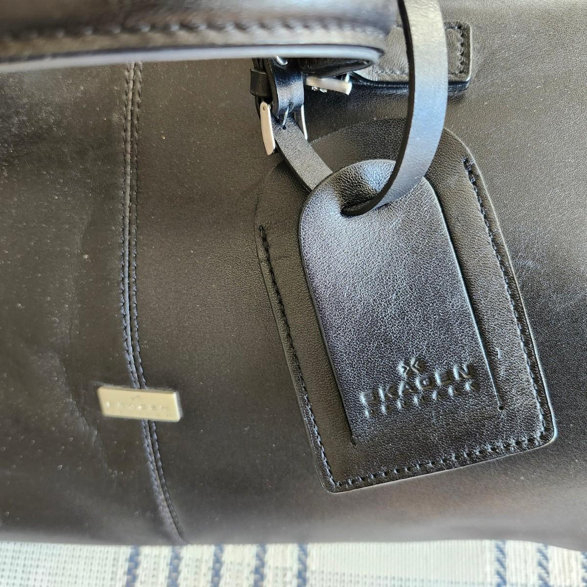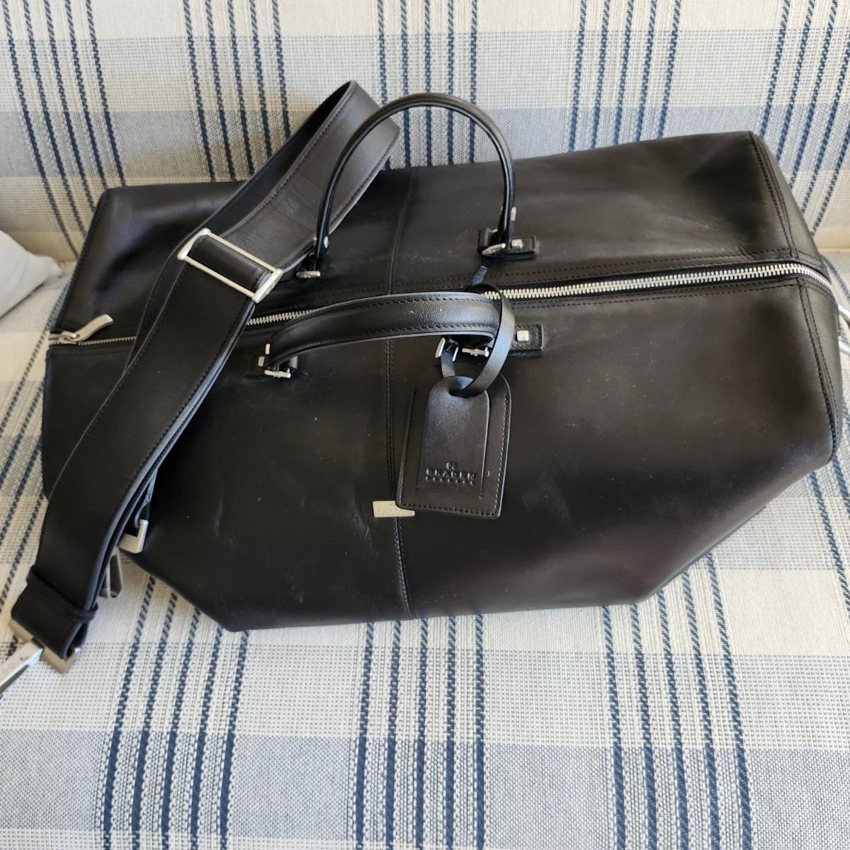 Leather Duffel Overnight bag, with 2 interior pockets, 2 external pockets on the ends. Shoulder strap. Zips open to grey lined interior. For Gym or travel. 21 inches by 10 inches by 10 inches. Lightweight. NEW