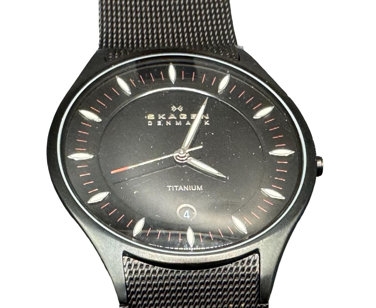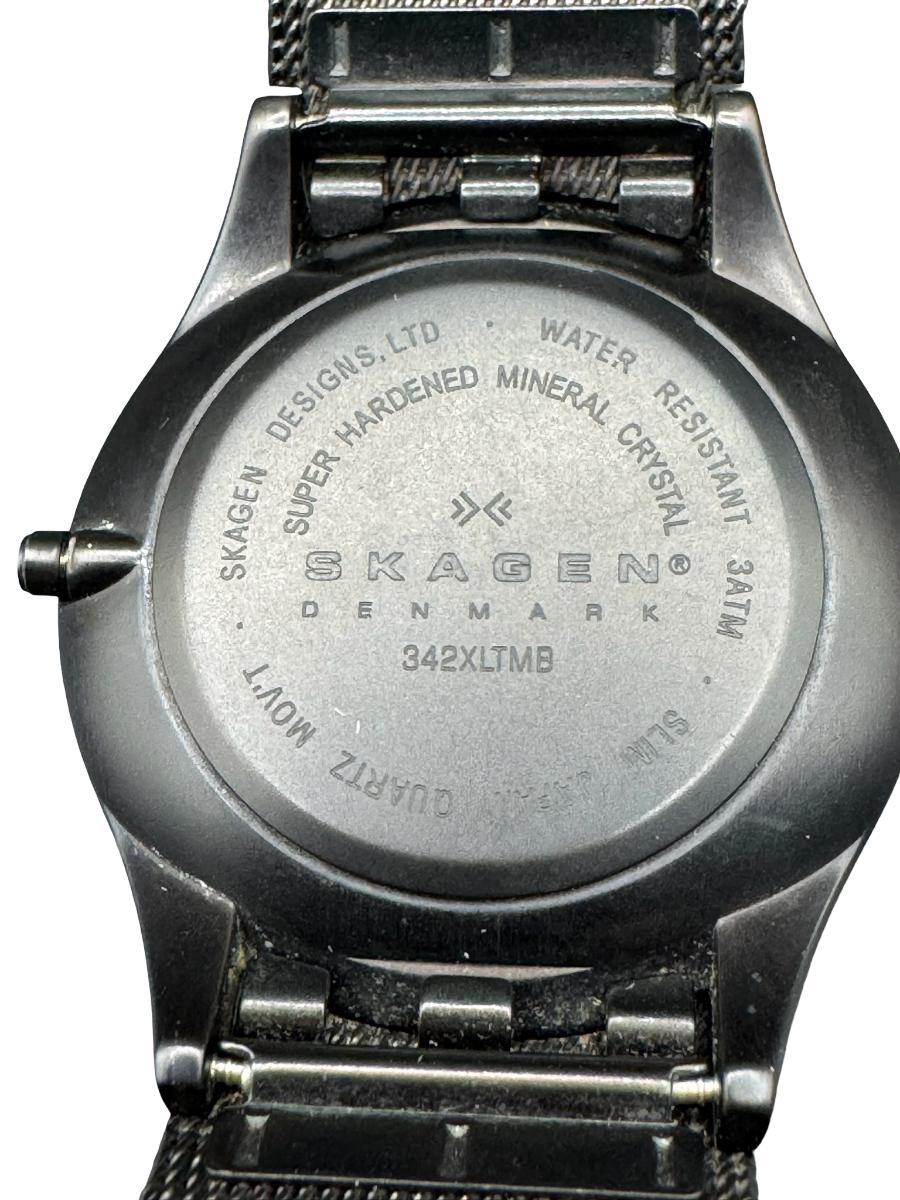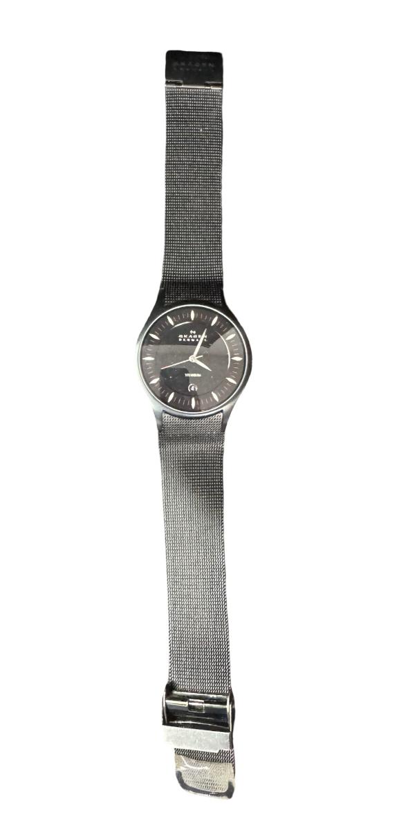 Made by Skagen of Denmark. Model 342XLTMB. This watch has a black face with date and white hour markings, and a metal mesh band. It has Japan quartz movement, and is water resistant to 3ATM. Gently used. There is age related wear to the clasp. Not tested. Pre-auction estimate: $75-$150. [JL]