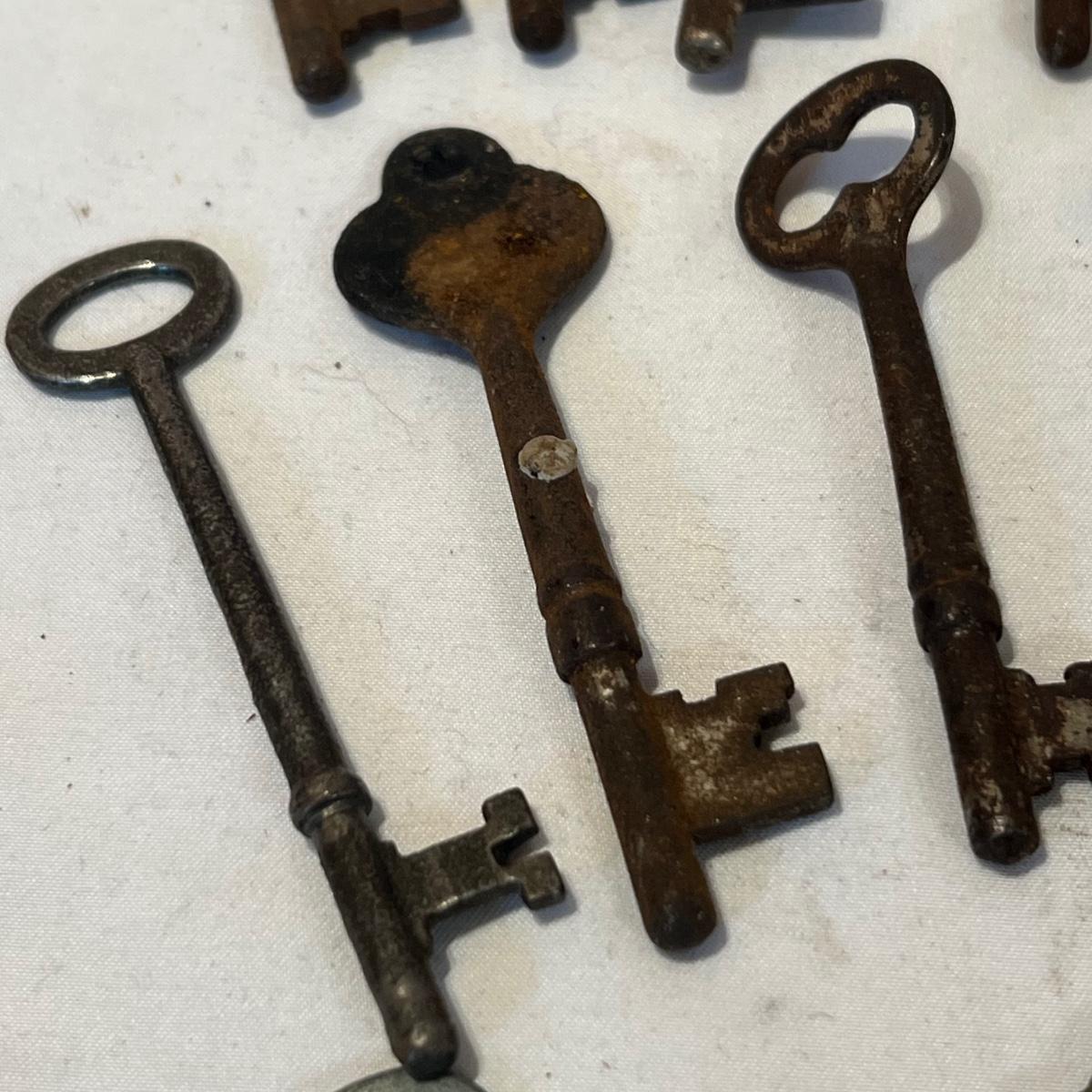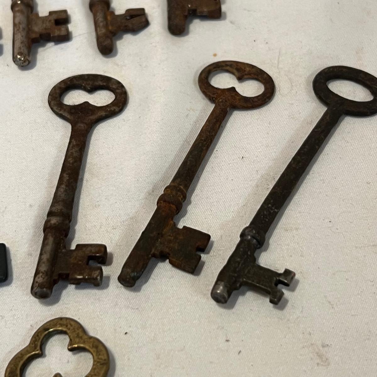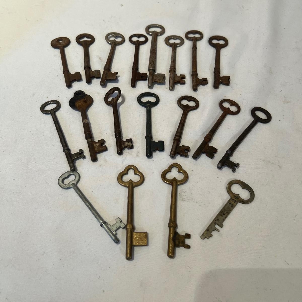 Lot includes 19 skeleton keys including a couple that appear to be brass. See photos for full inventory.