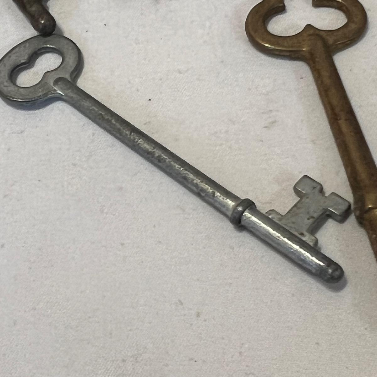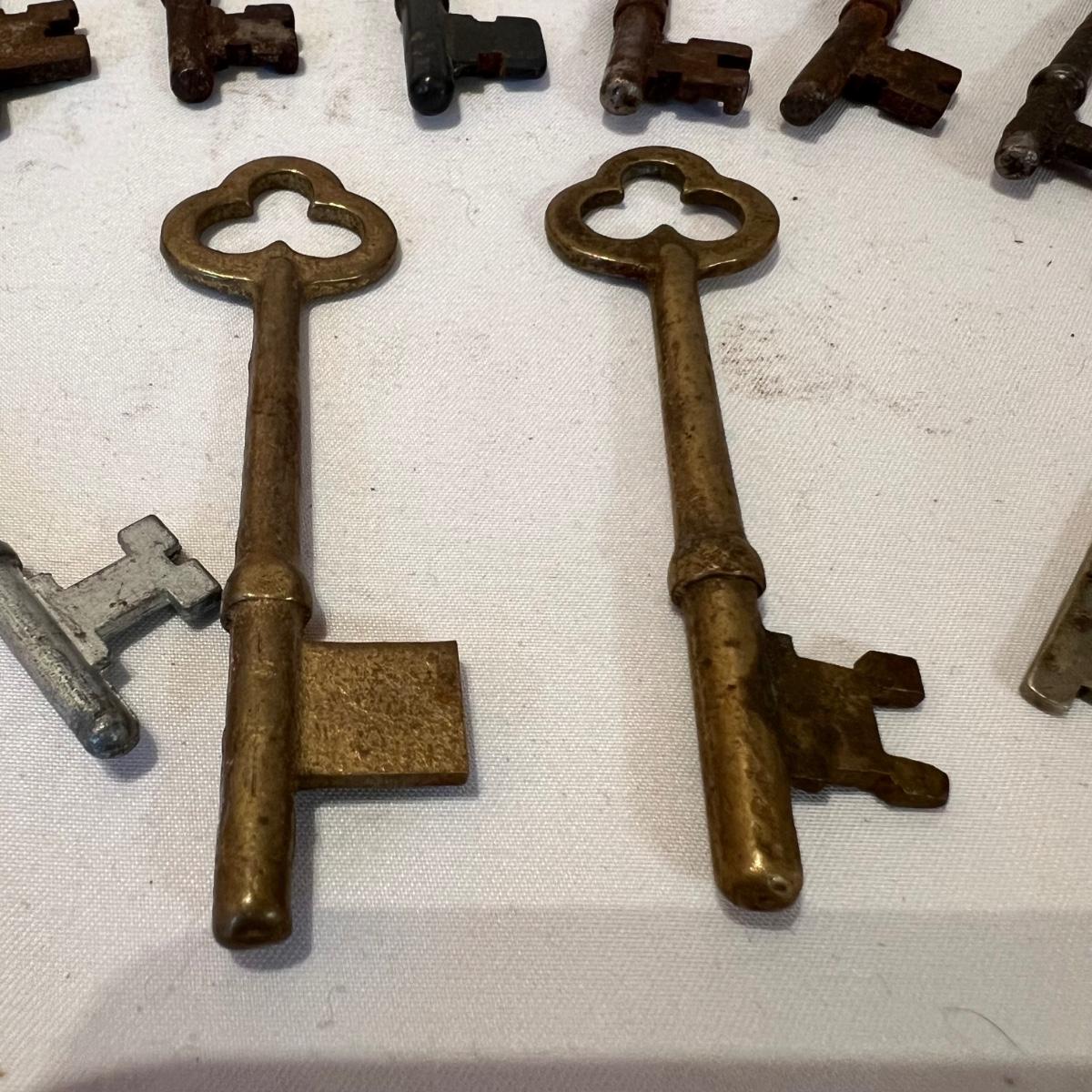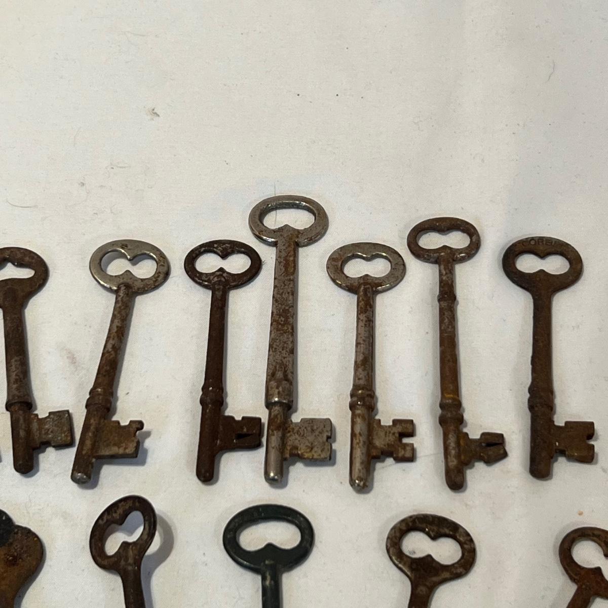 Lot includes 19 skeleton keys including a couple that appear to be brass. See photos for full inventory.