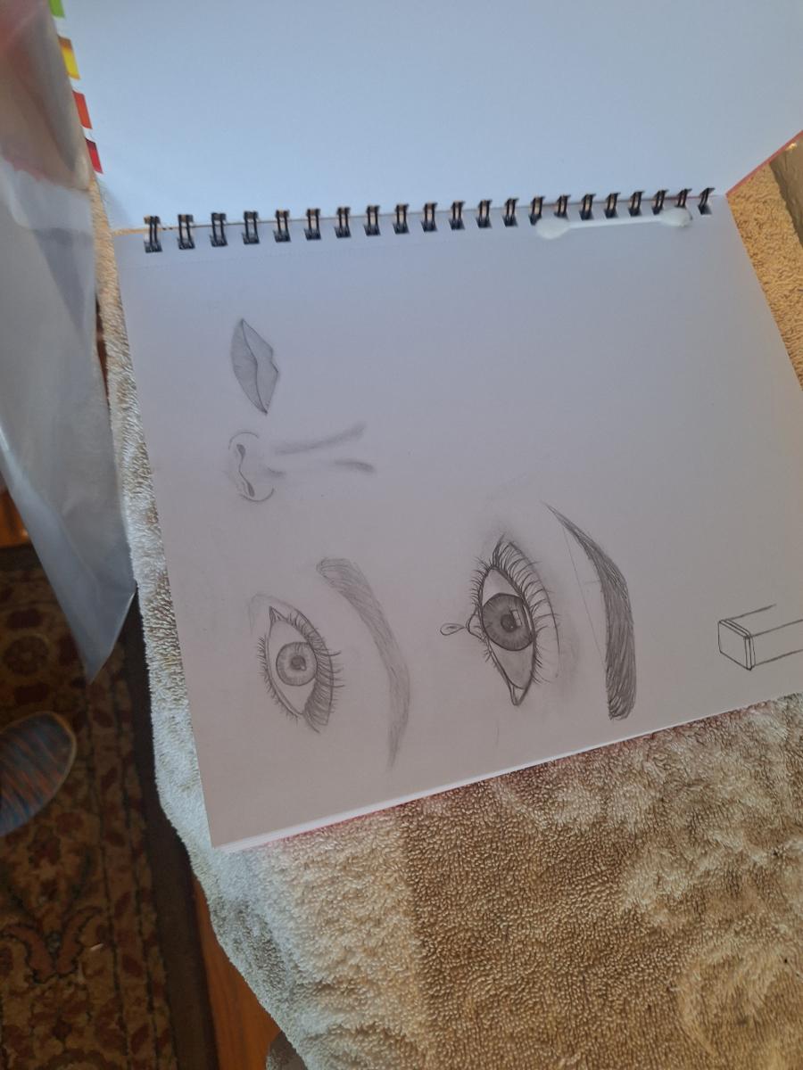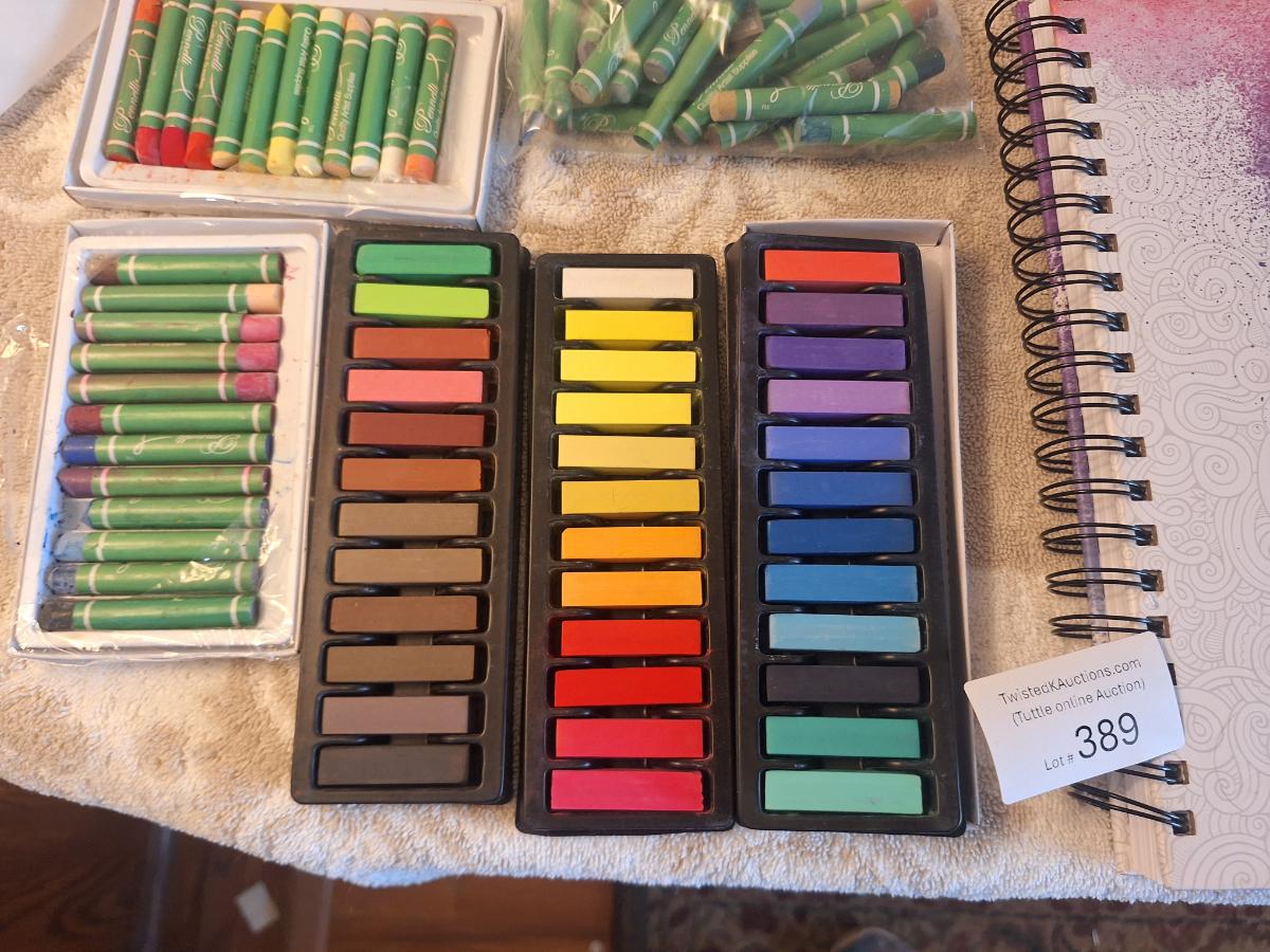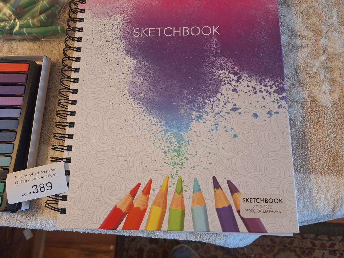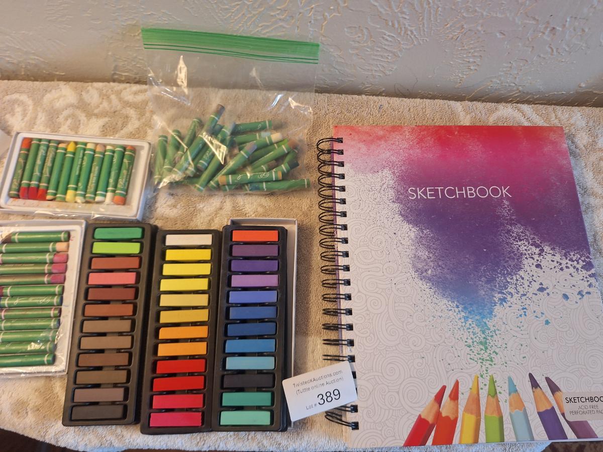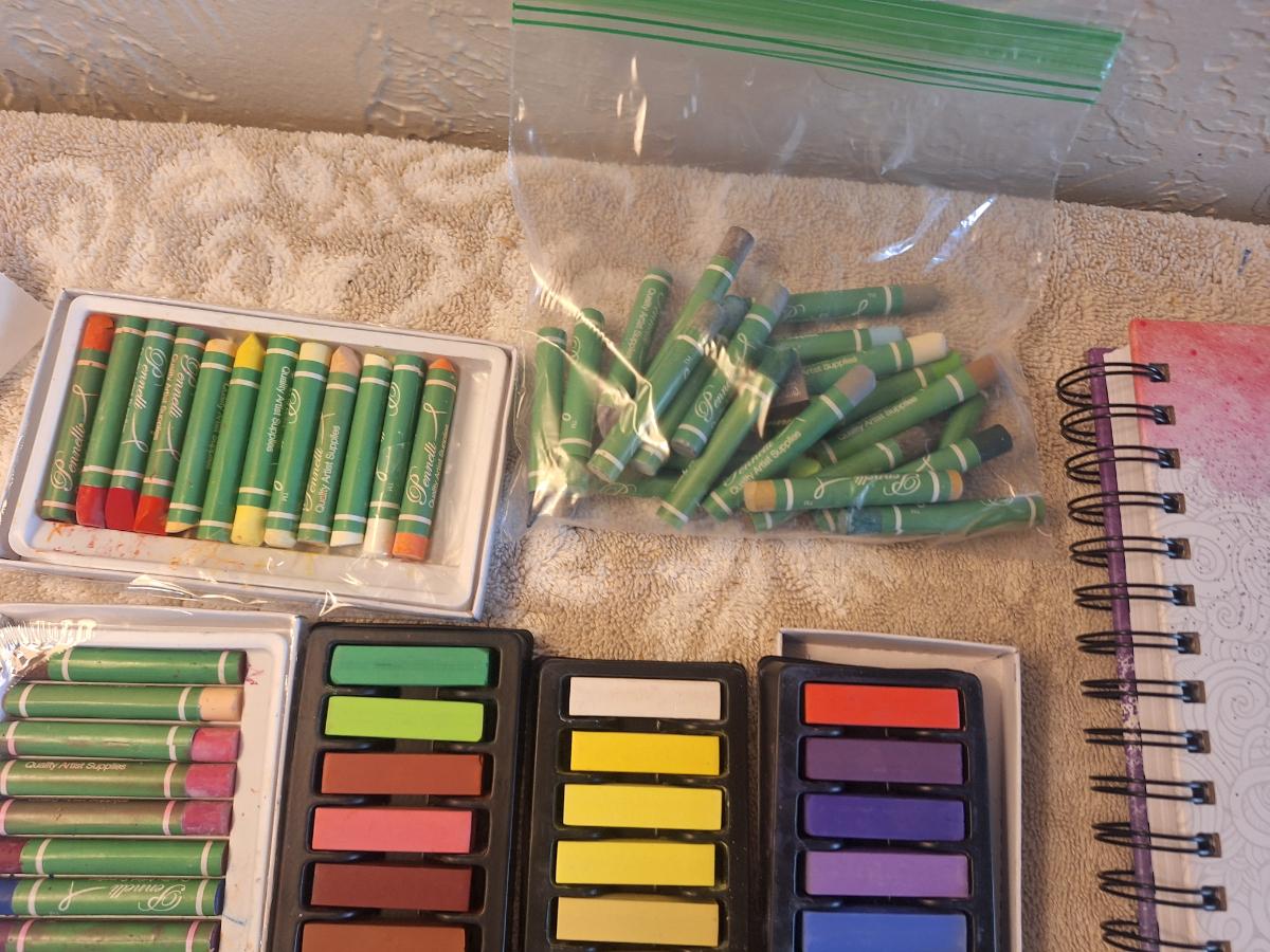 Sketchbook and a set of soft art pastels as well as some oil pastels.  The sketch book has one page with drawings on it.