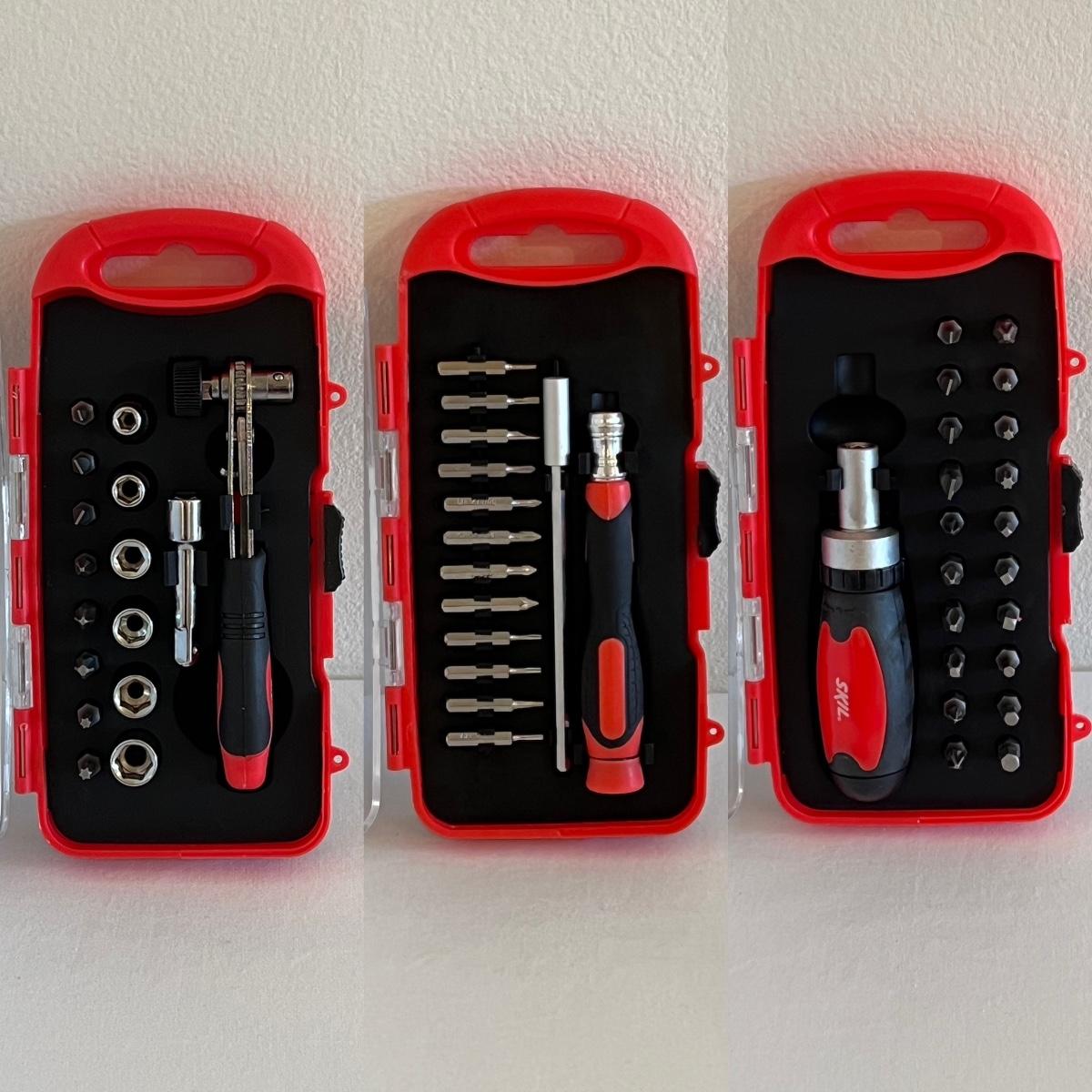 Includes: Precision screwdriver set, ratcheting screwdriver set, & 1/4-inch drive set