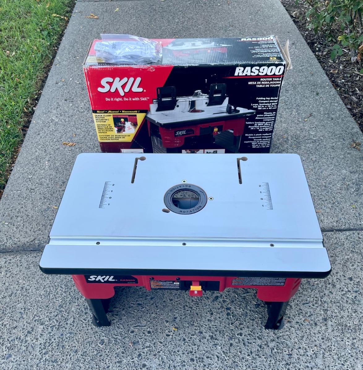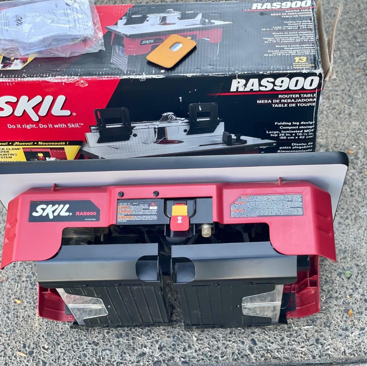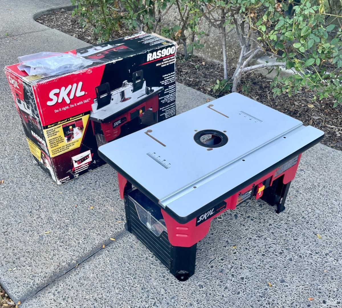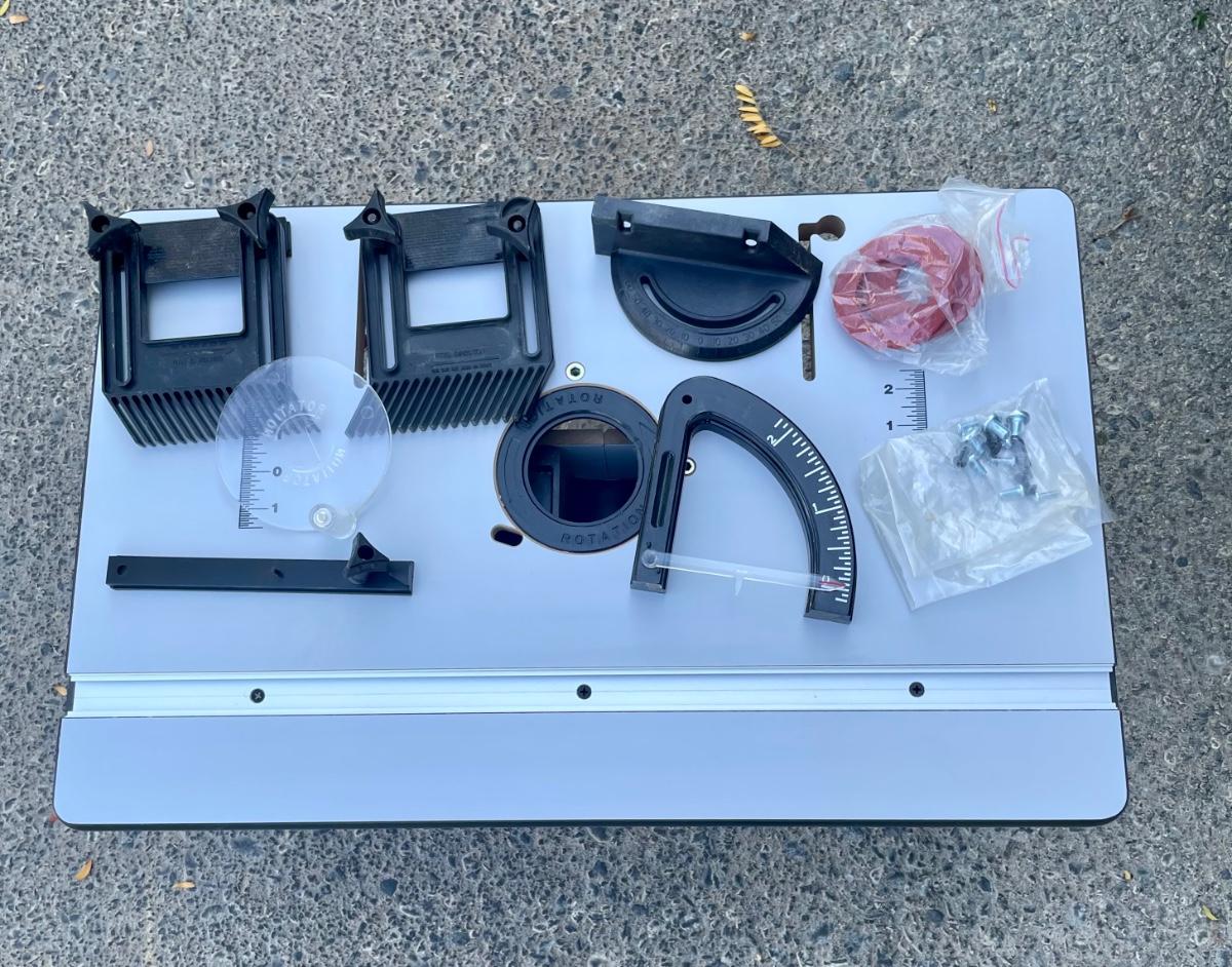 Router table with folding legs for easy storage when not in use. 26”x 16” work surface. Includes many accessories such as mitre gauge, feather boards, bit insert rings, and bit height gauge. Excellent, near-new condition.