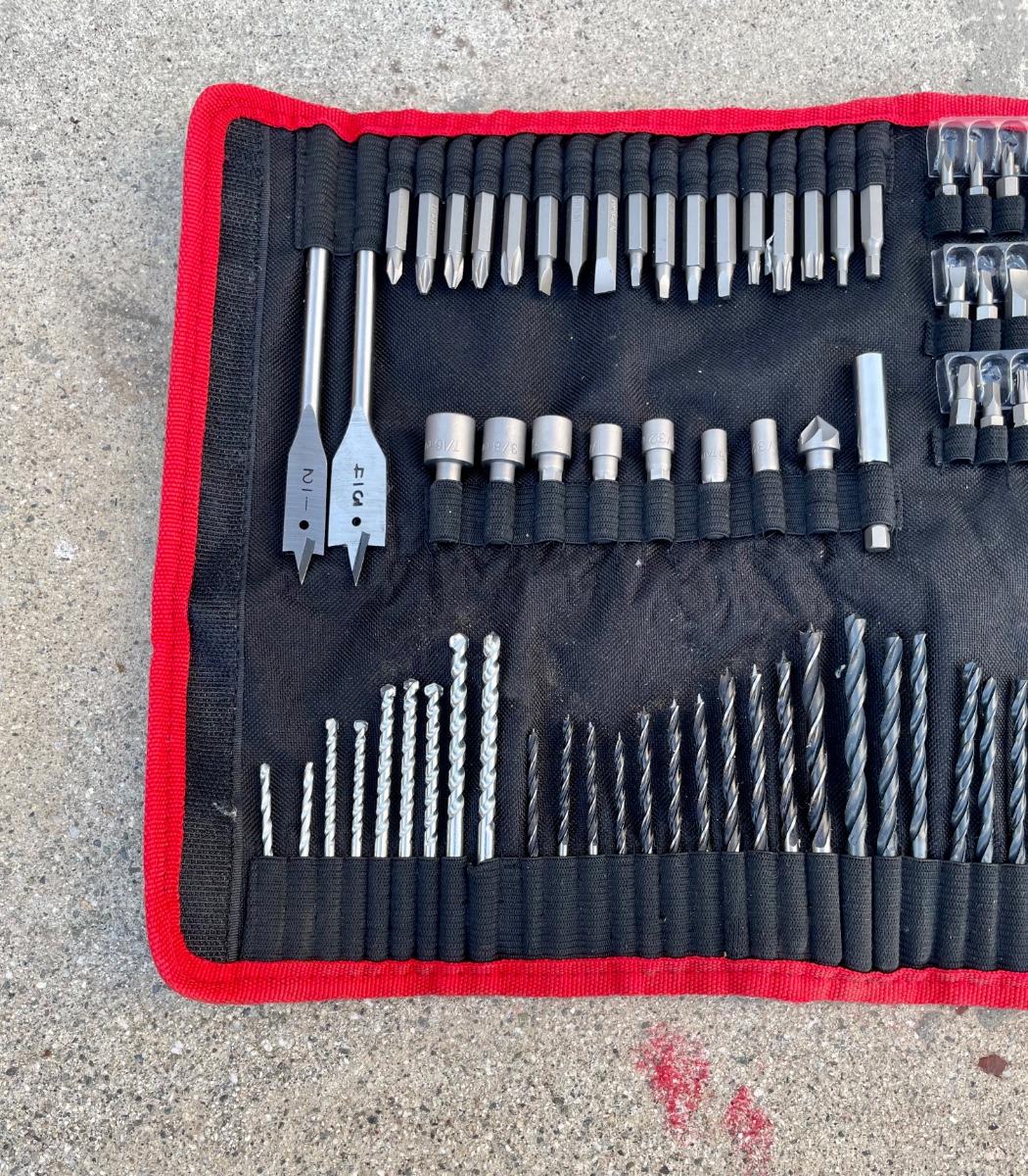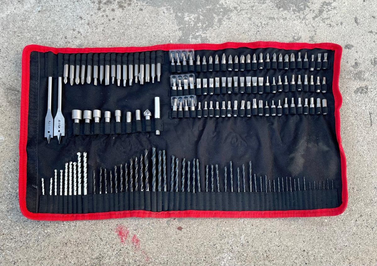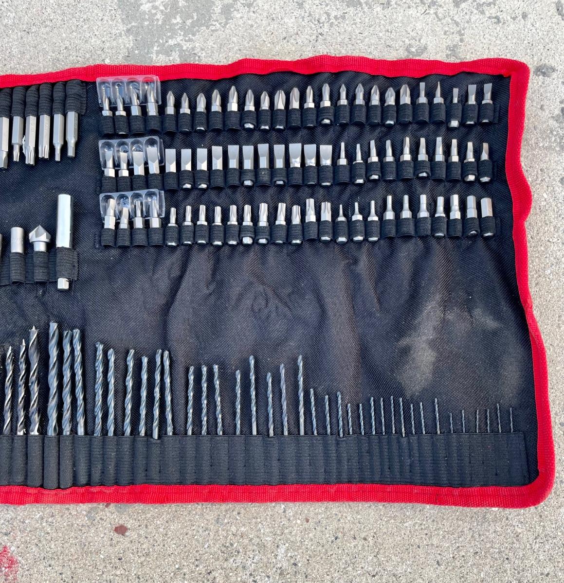 100 piece tool set in a nylon roll-up pouch: includes nut drivers, wood augers, drills, screwdriver bits, torx head bits and more.