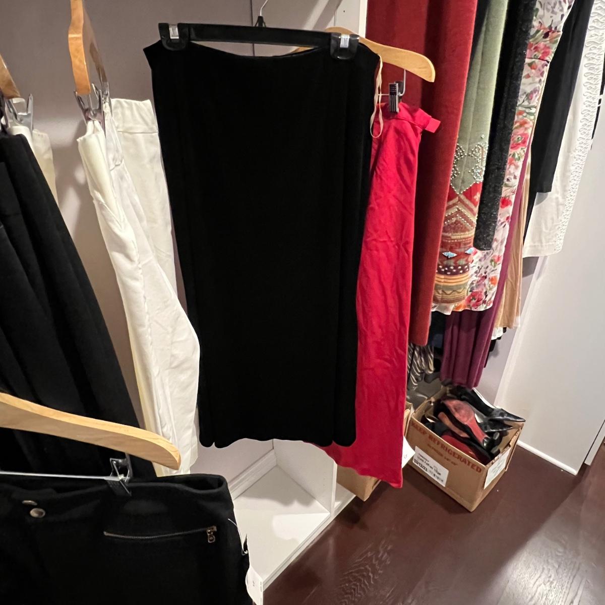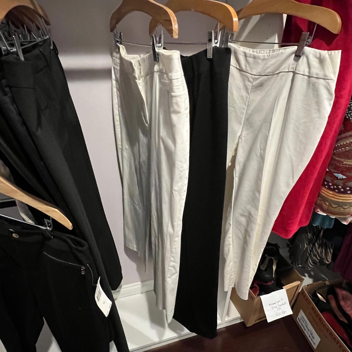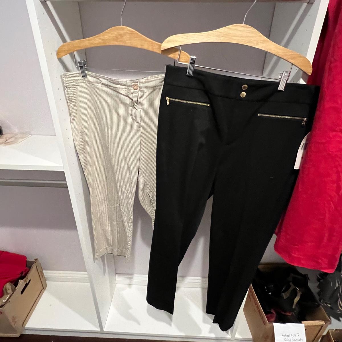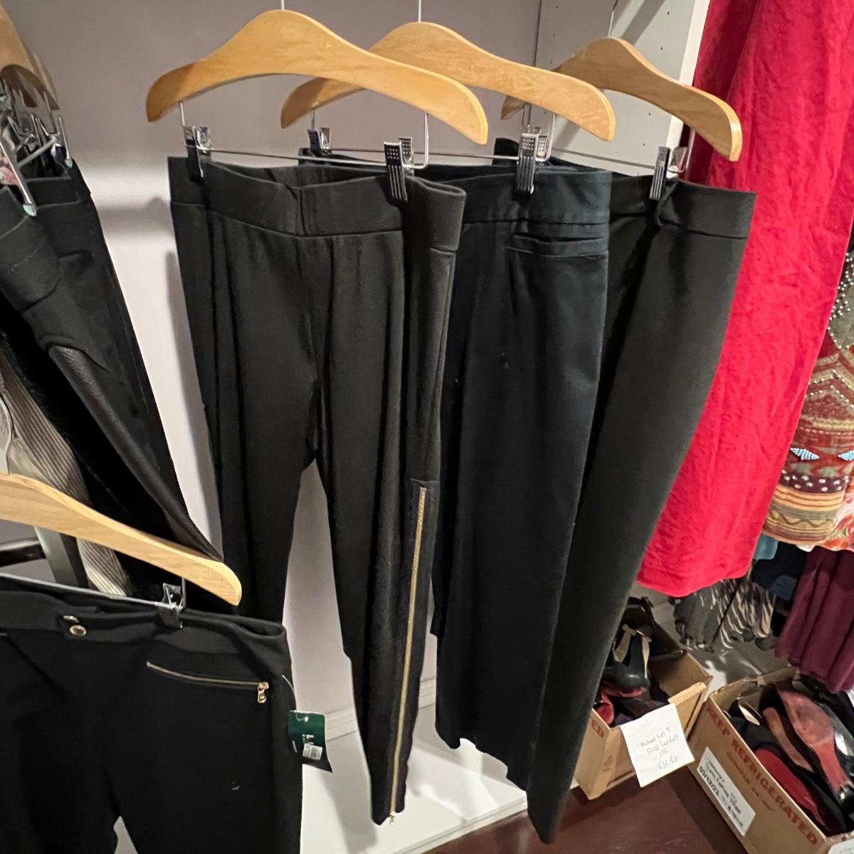 This large lot includes approximately eight skirts and ten pairs of pants with great brand names, see images. All are size large, mostly labeled as such or size 12 or 14. Coat hangers which are mostly wood are included.