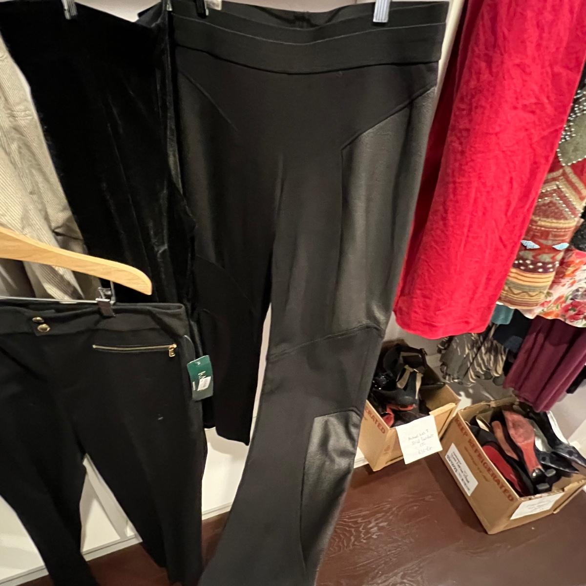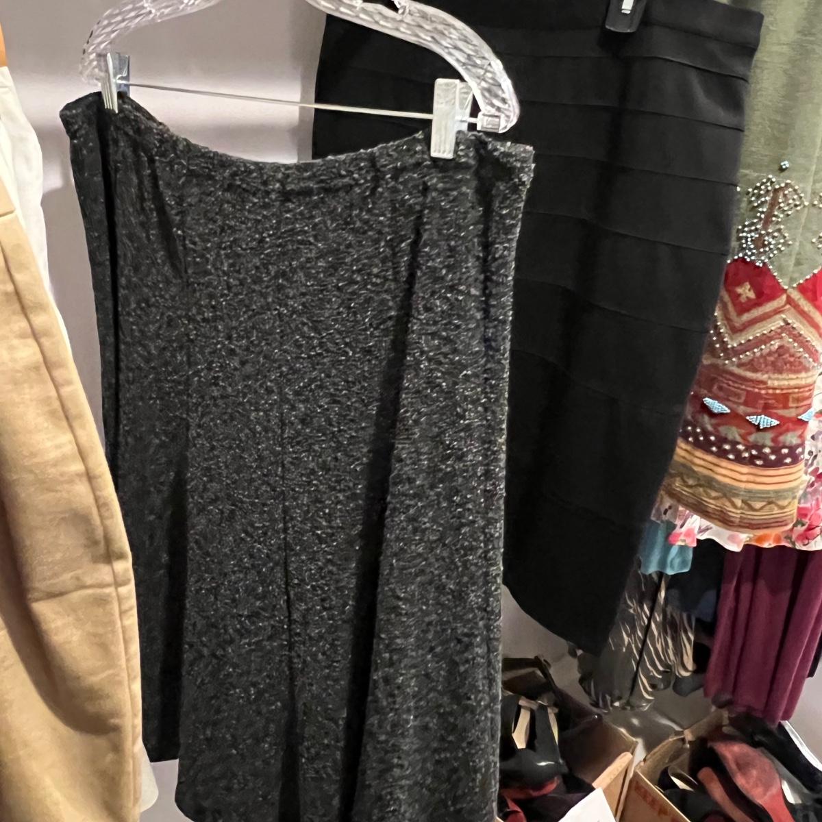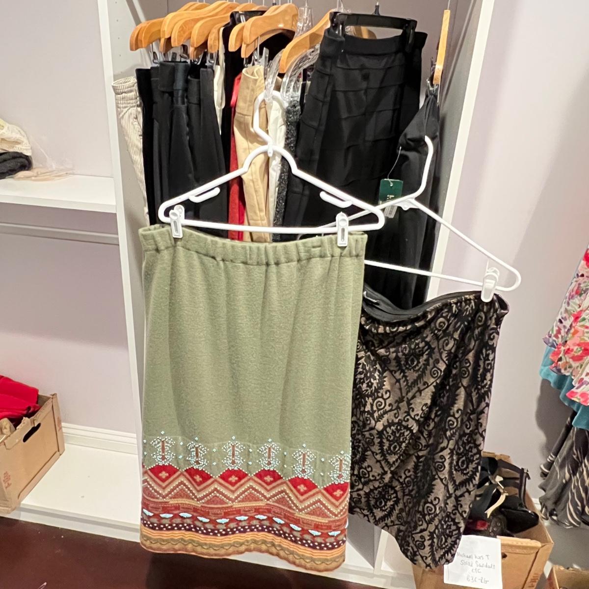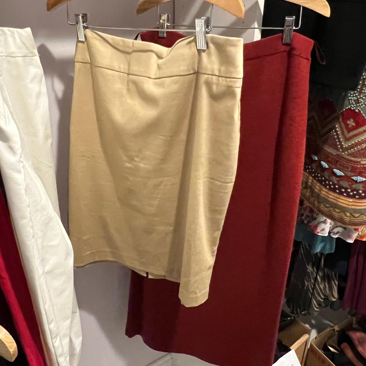 This large lot includes approximately eight skirts and ten pairs of pants with great brand names, see images. All are size large, mostly labeled as such or size 12 or 14. Coat hangers which are mostly wood are included.