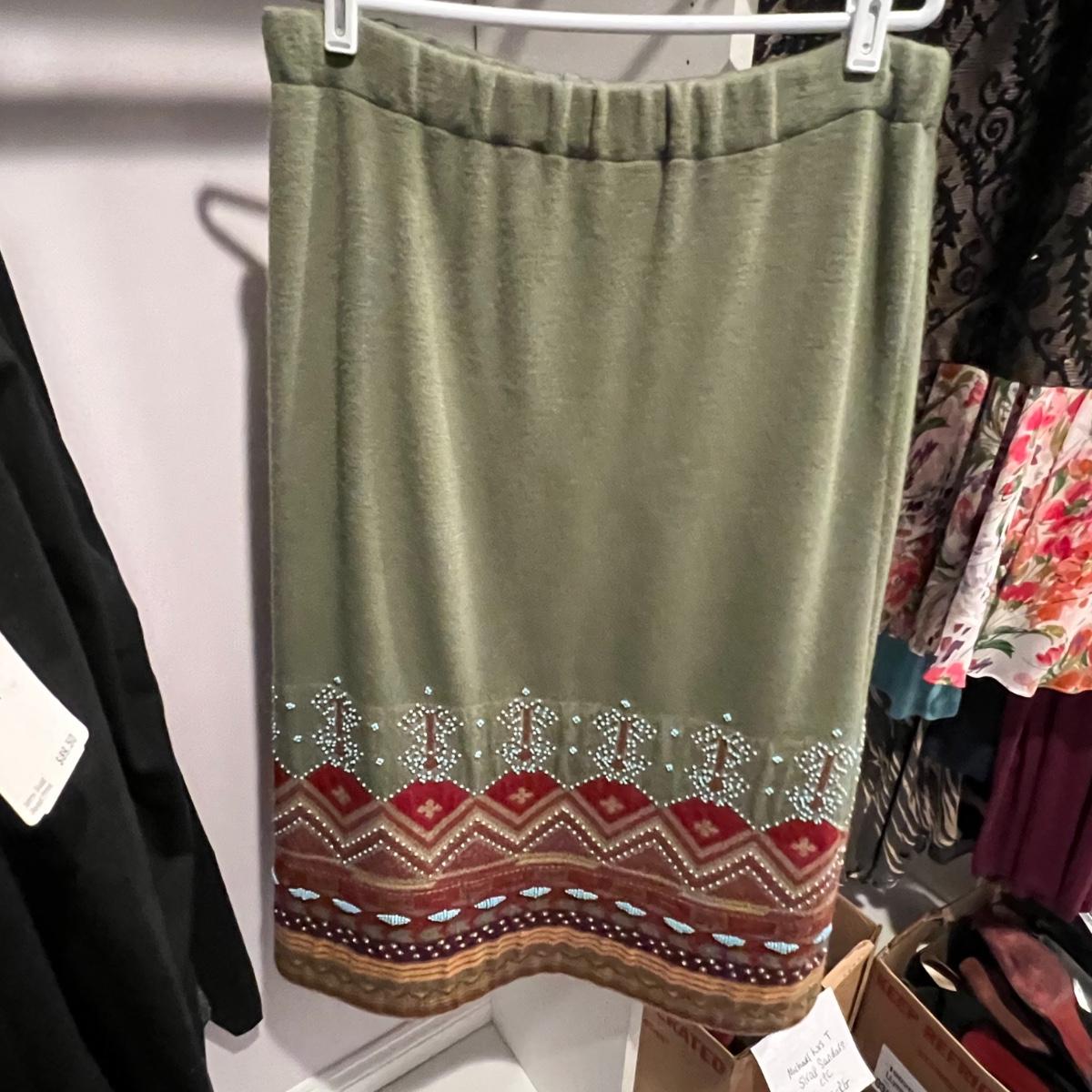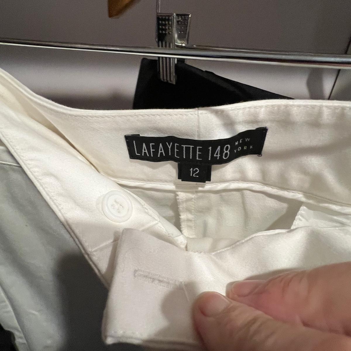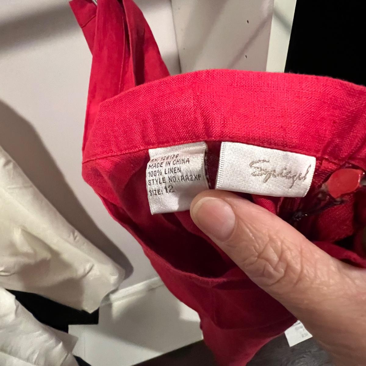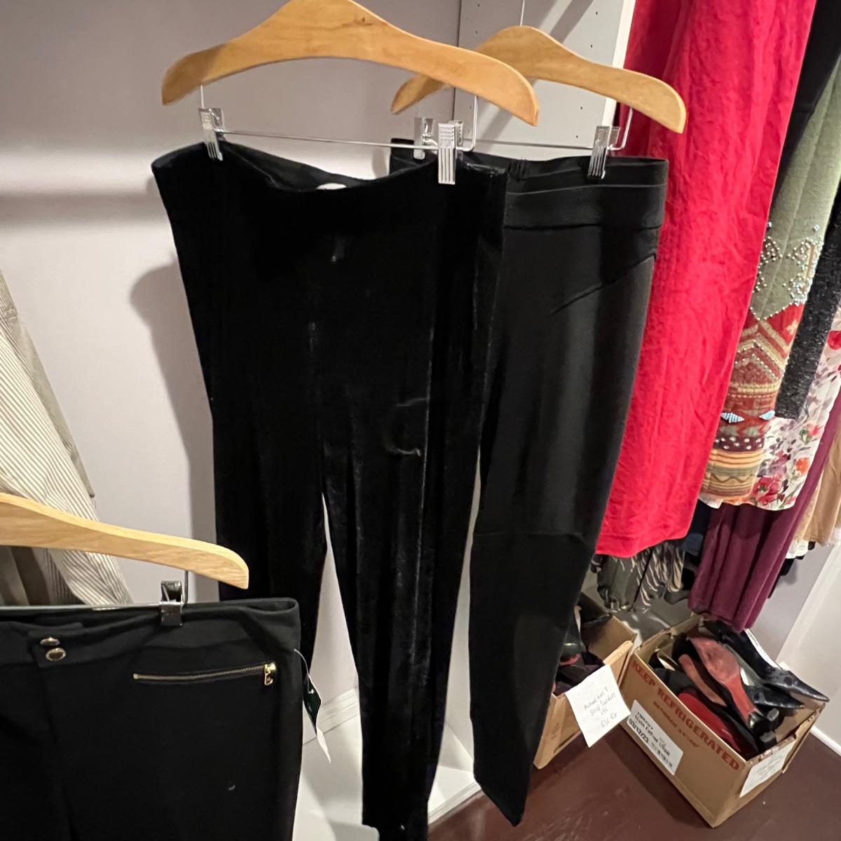 This large lot includes approximately eight skirts and ten pairs of pants with great brand names, see images. All are size large, mostly labeled as such or size 12 or 14. Coat hangers which are mostly wood are included.