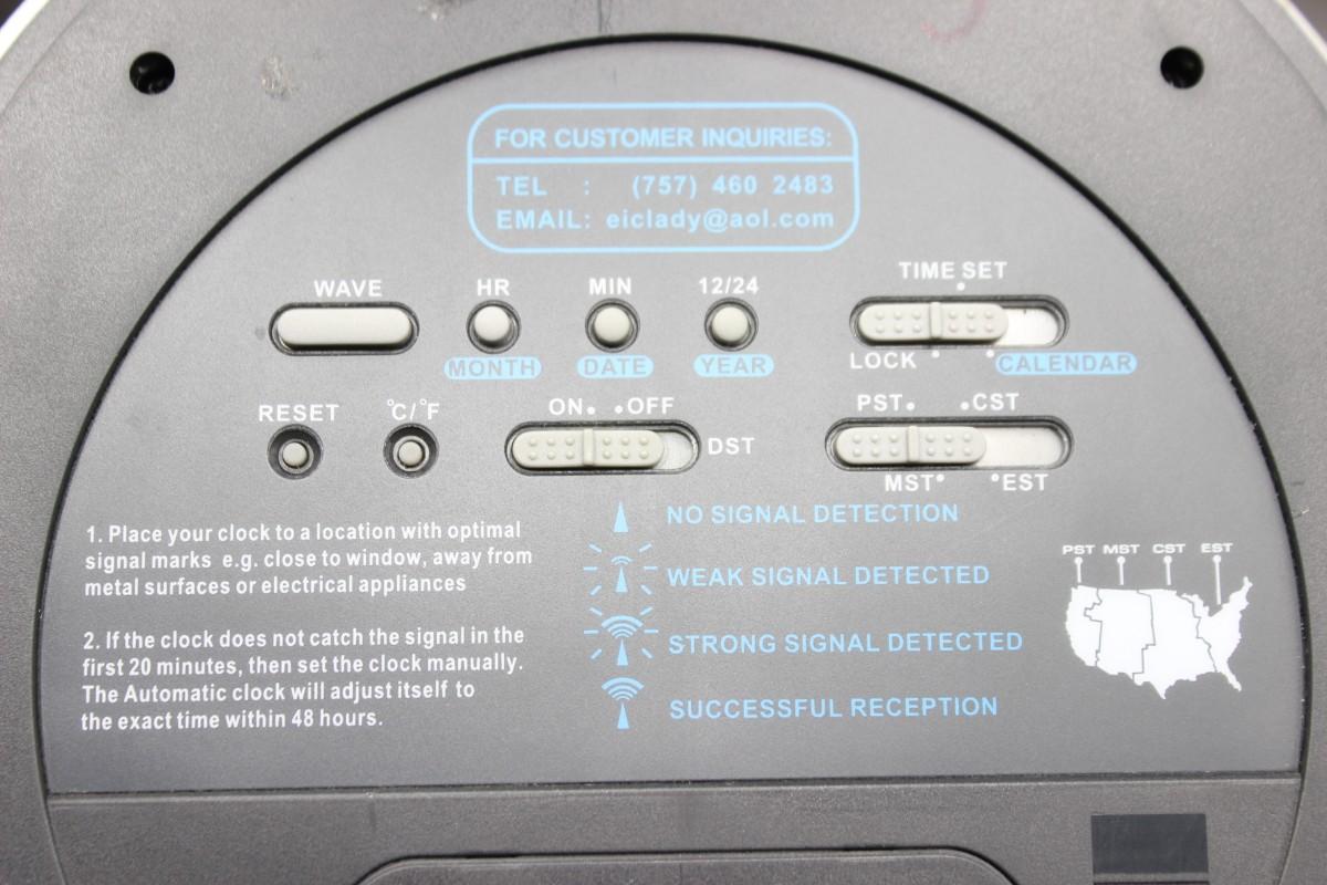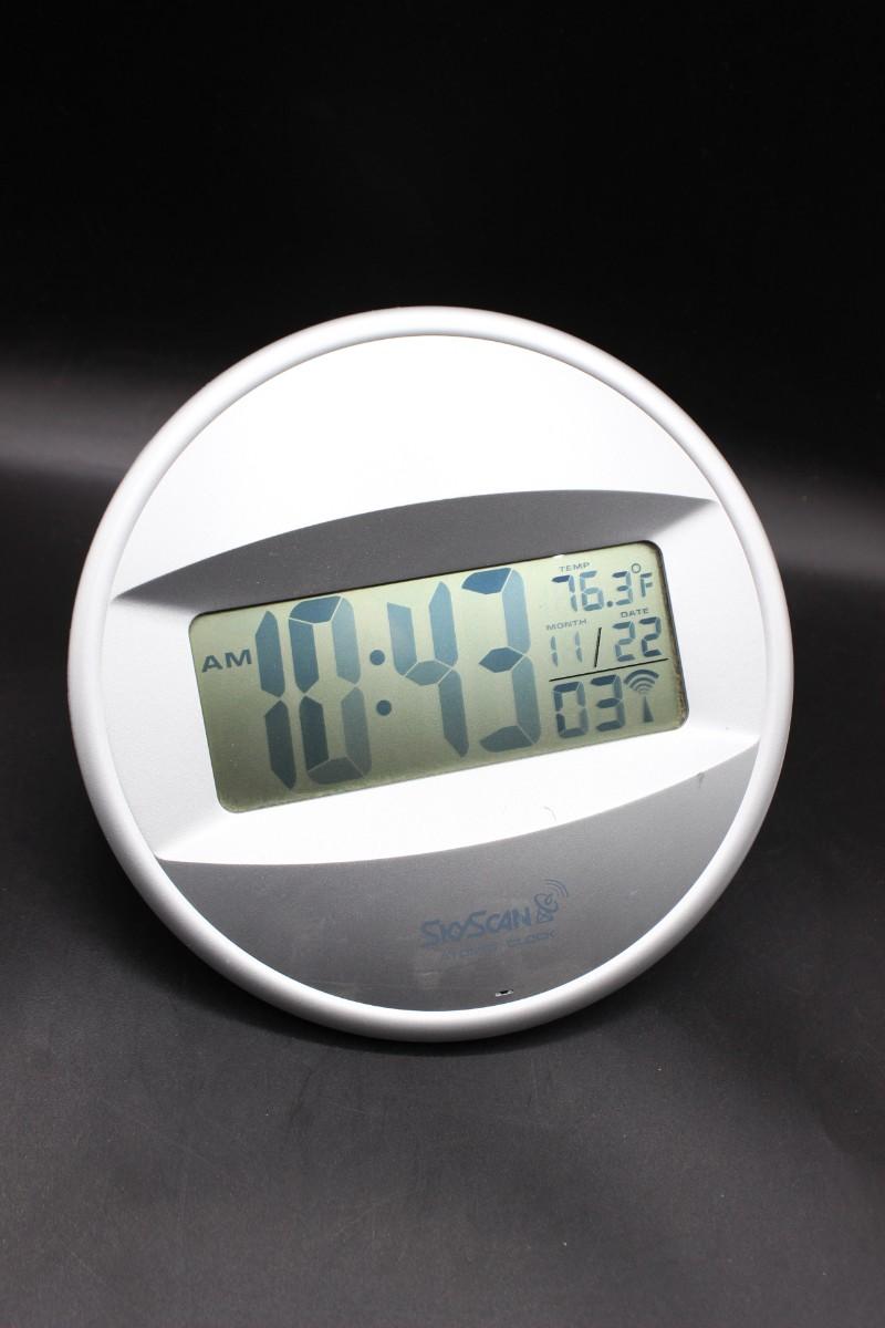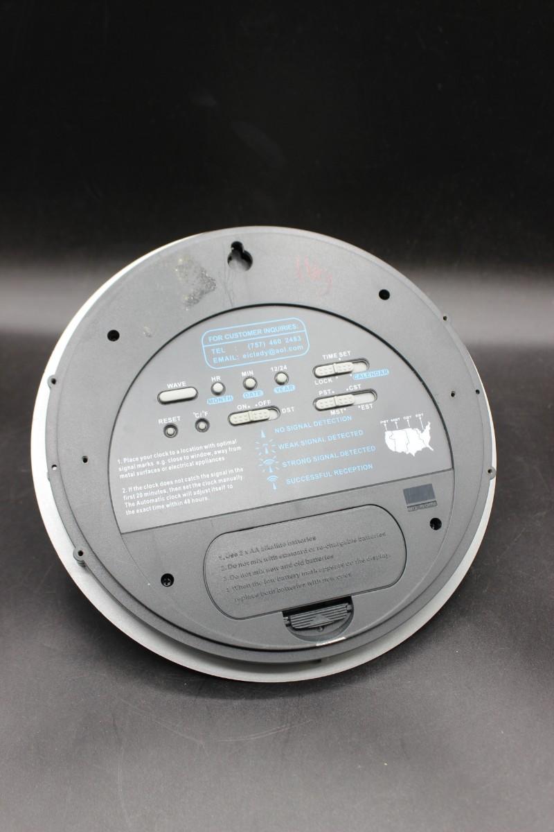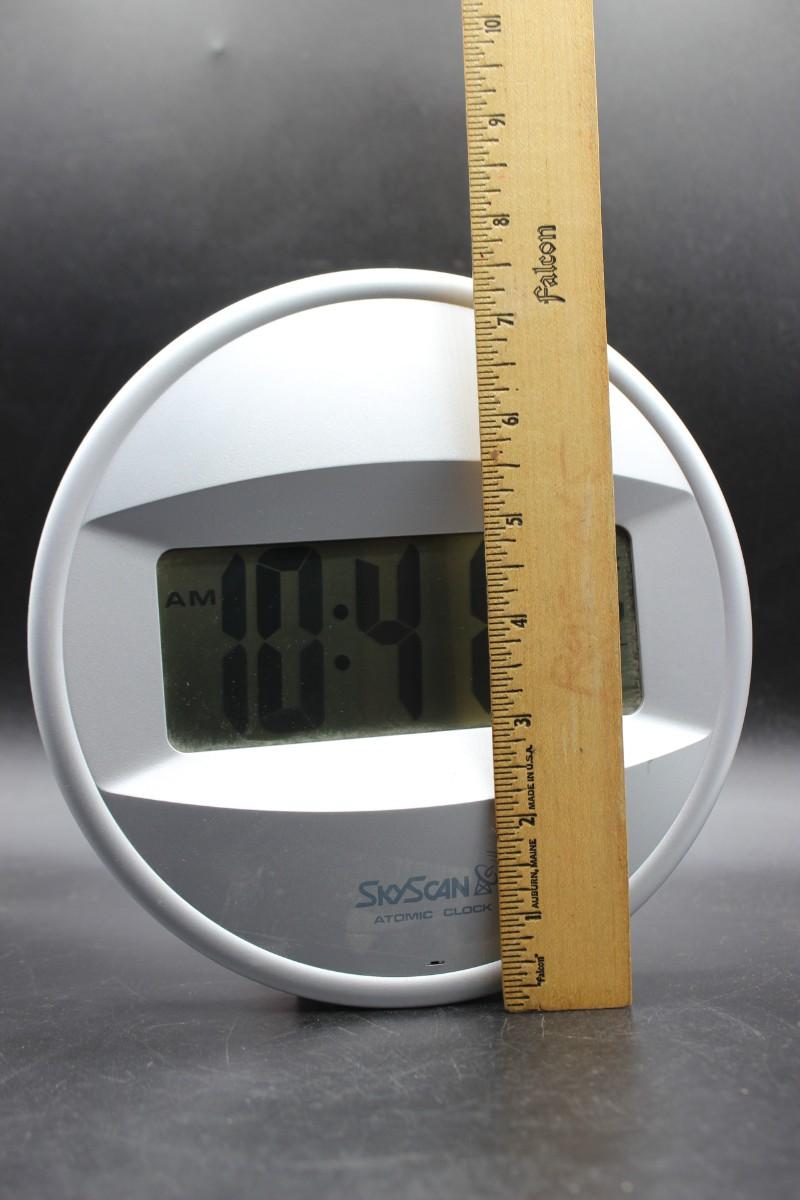 Sky Scan Atomic Clock Electronic Wall Clock, there are no significant cracks or chips to the electronic clock and is in good useable condition. Has been tested with batteries and works perfectly, check pictures for more details and for sizing.
