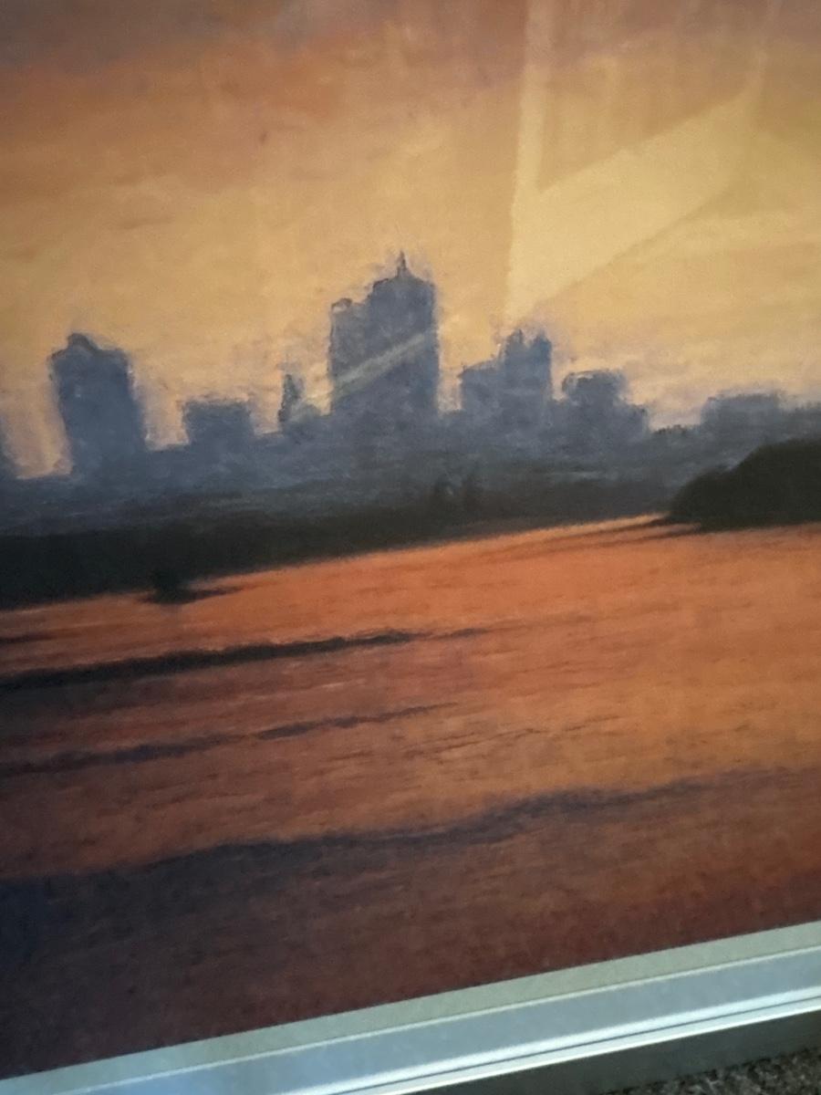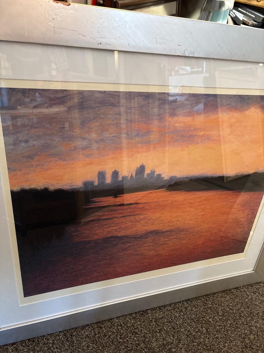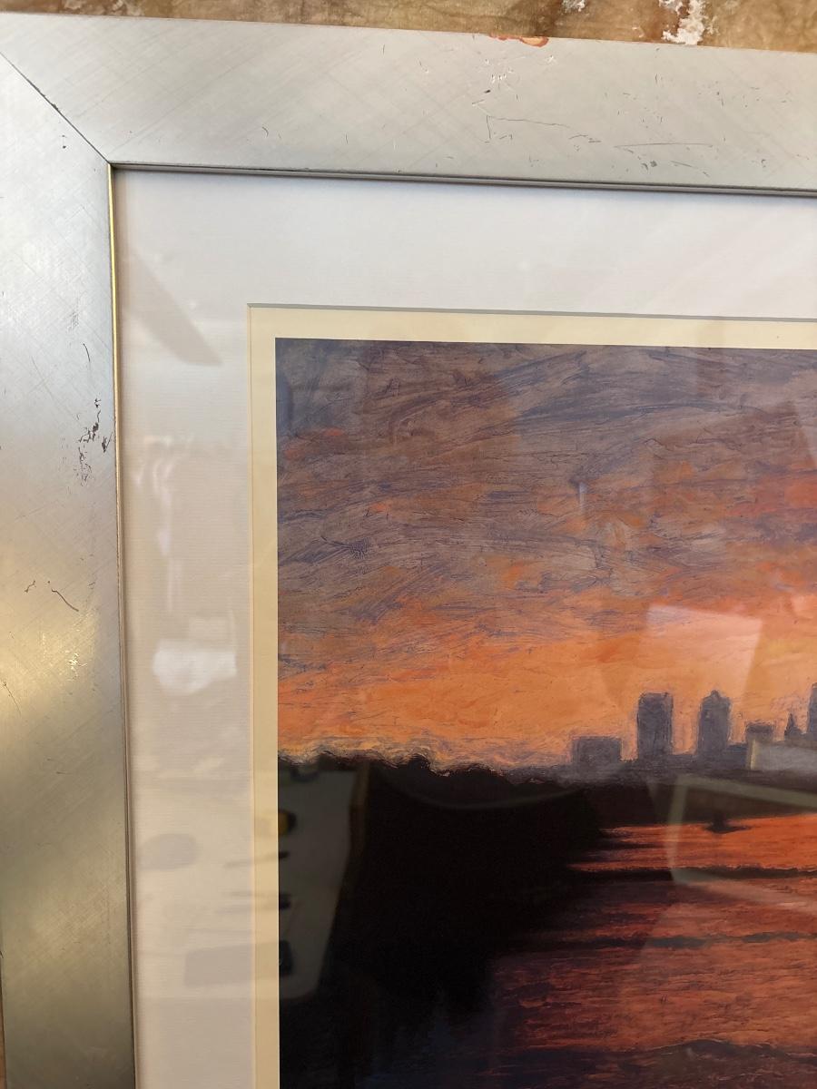 Beautiful colors of the skyline framed in a silver frame measuring 37” x 31.5”. Some damage on frame.