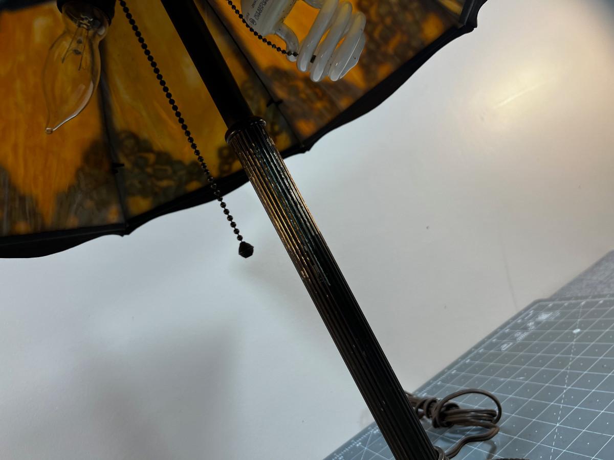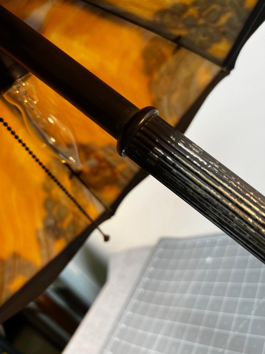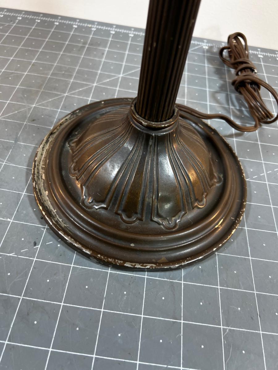 Working Condition. AWESOME! Tiffany Style Post is loose and needs repair. Chipping on the paint from use. 21" Tall and Shade is 16" Diameter.