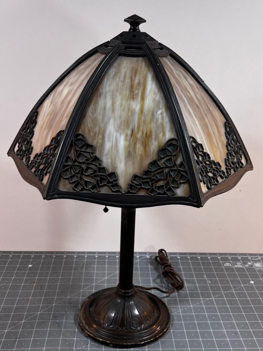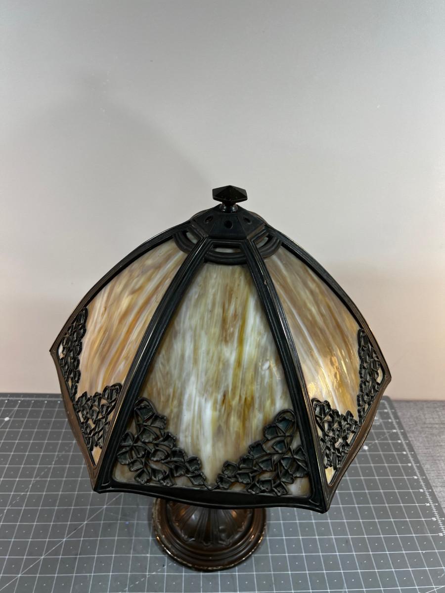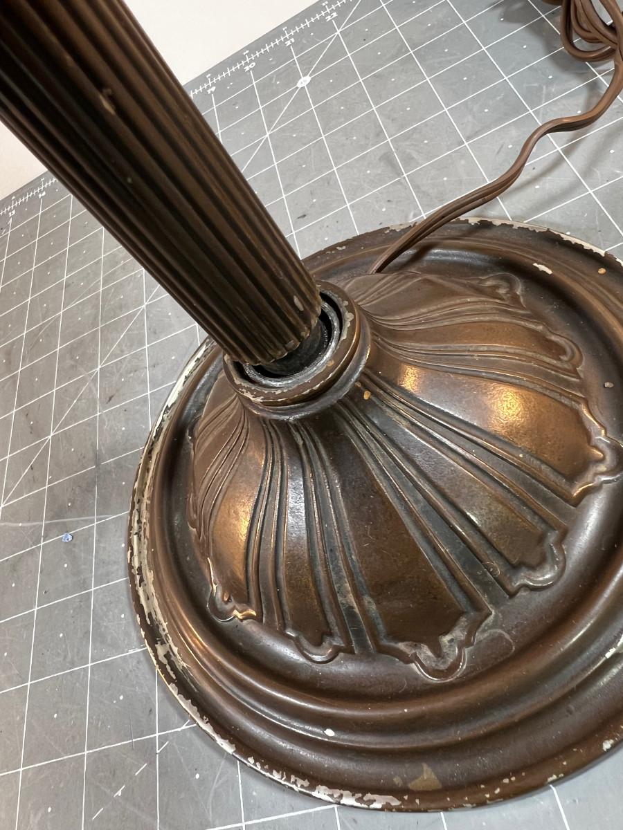 Working Condition. AWESOME! Tiffany Style Post is loose and needs repair. Chipping on the paint from use. 21" Tall and Shade is 16" Diameter.