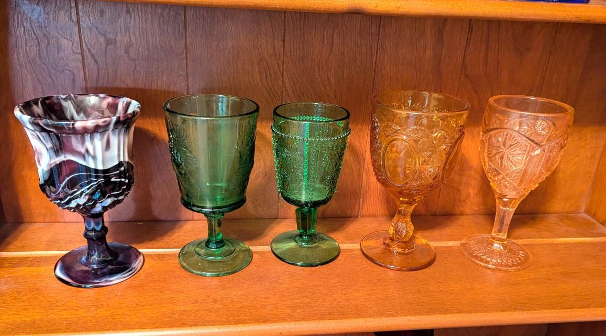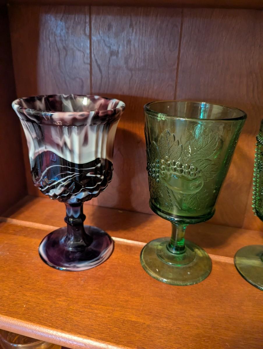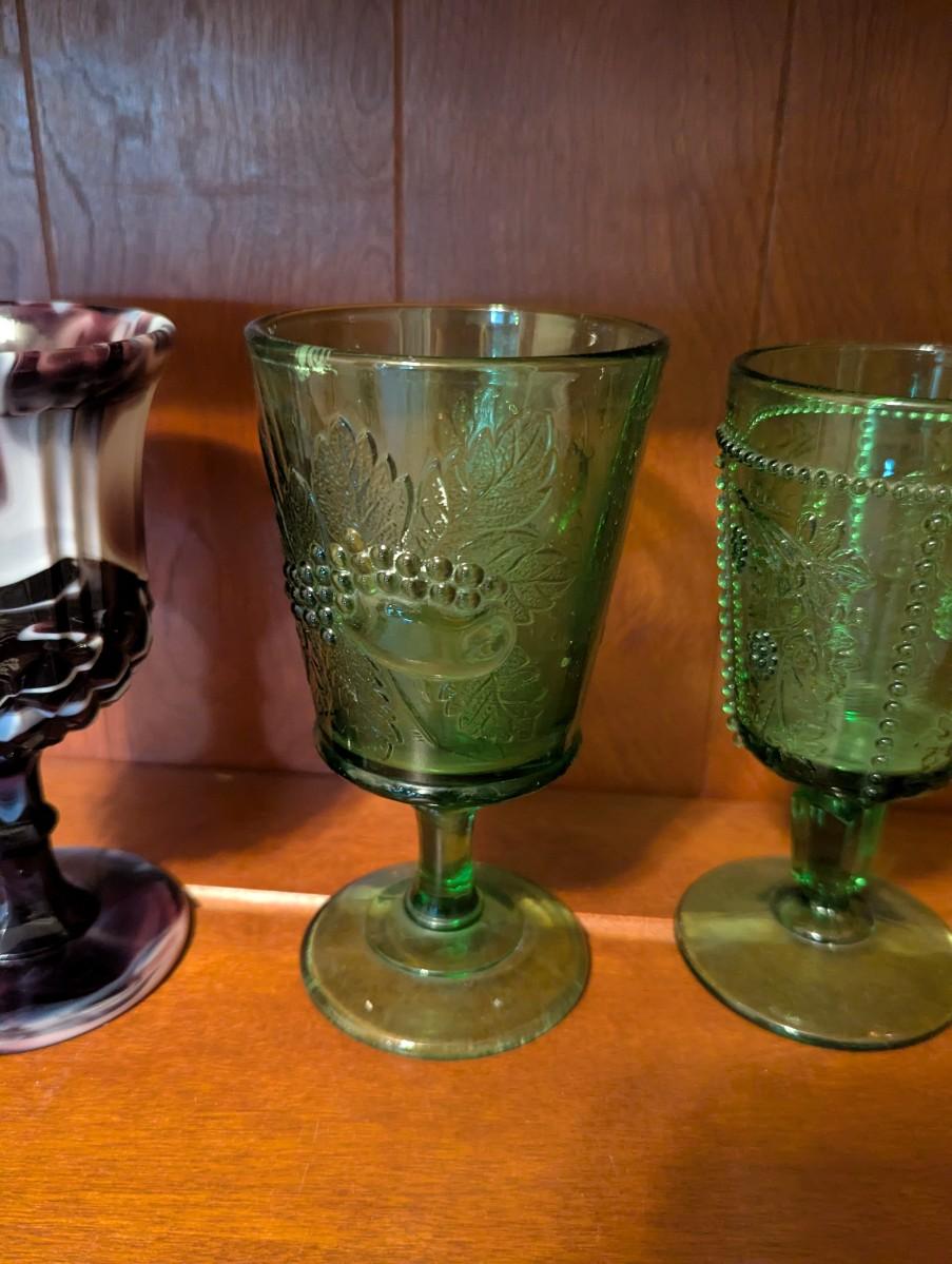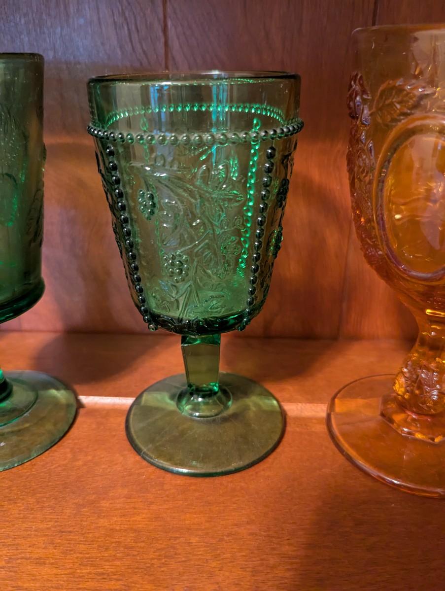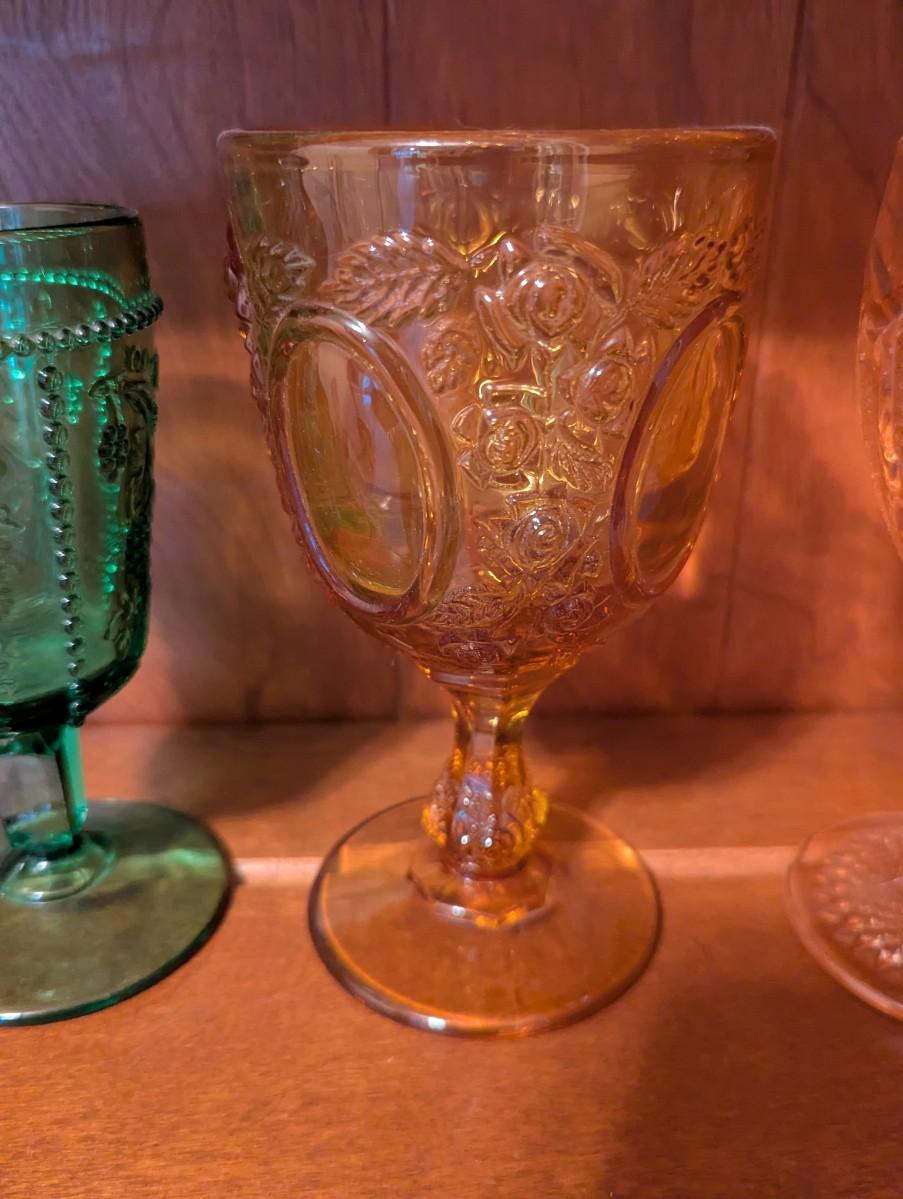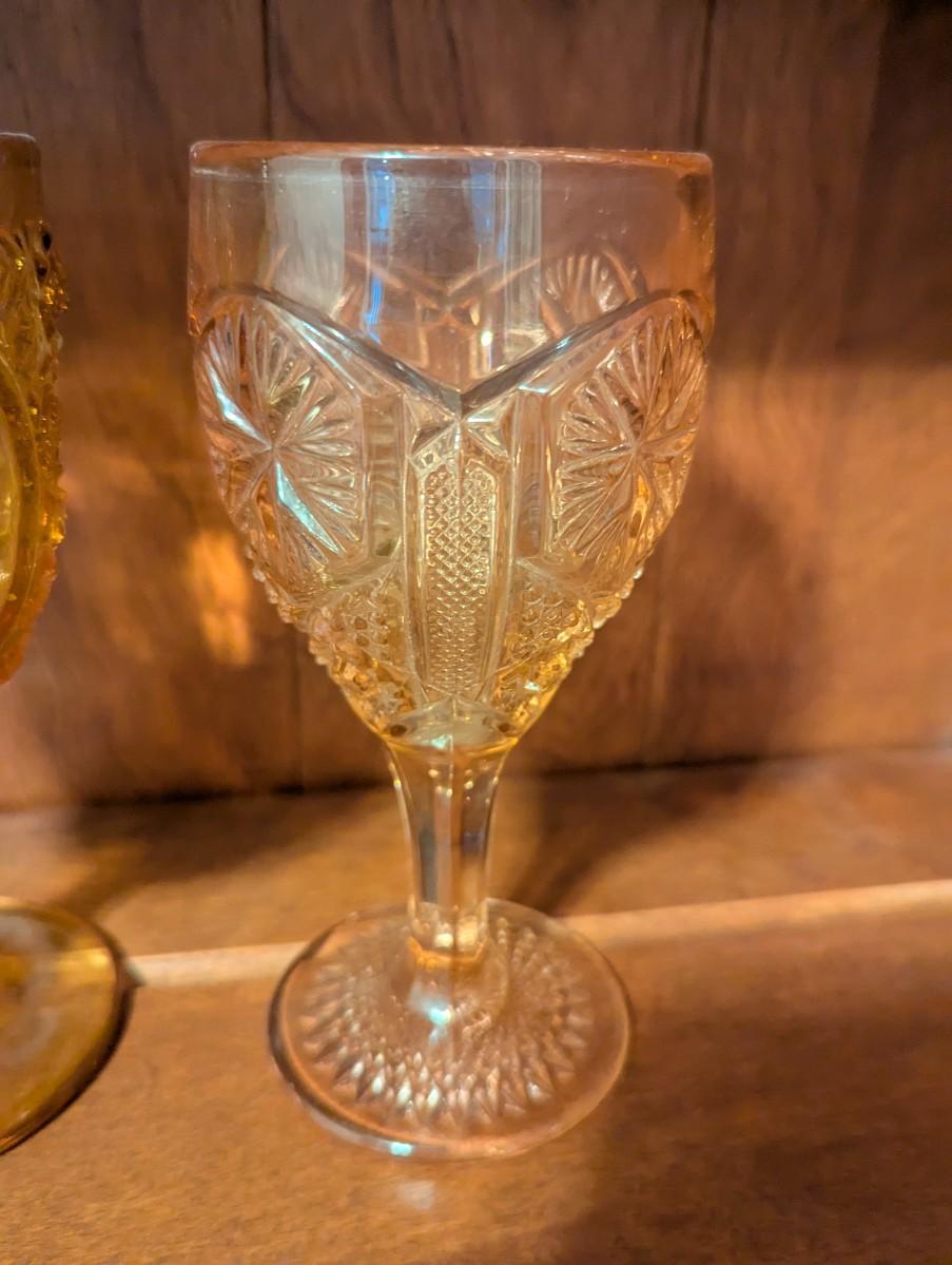 Slag Water Glass Rose Oval Amber Depression Star & File Wine Goblet Imperial 1904 Panel Star Hobstar Beaded Grape Green Glass