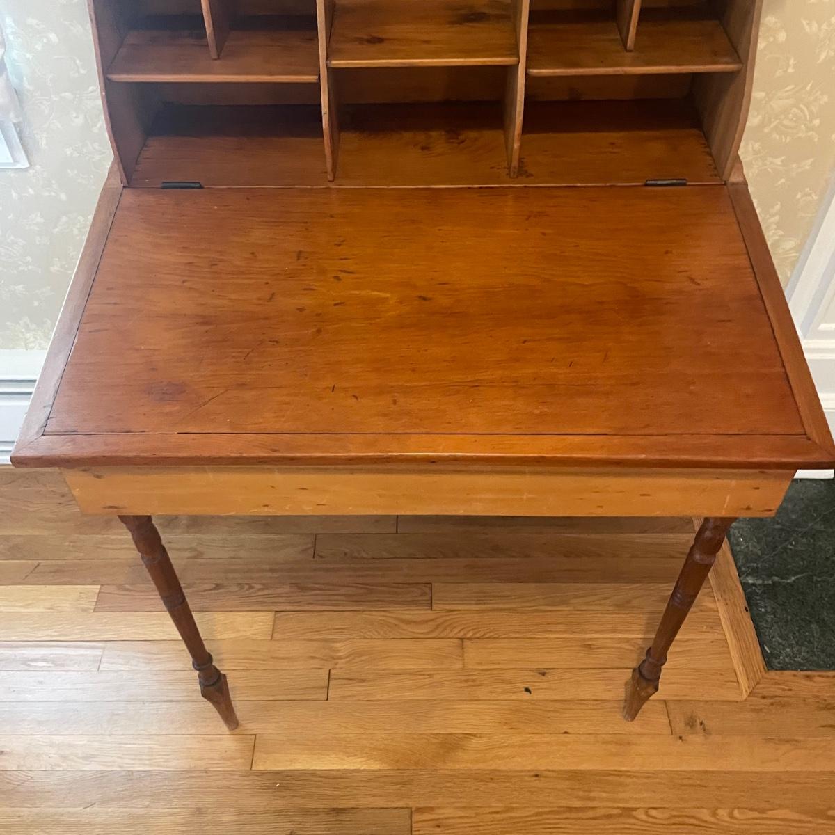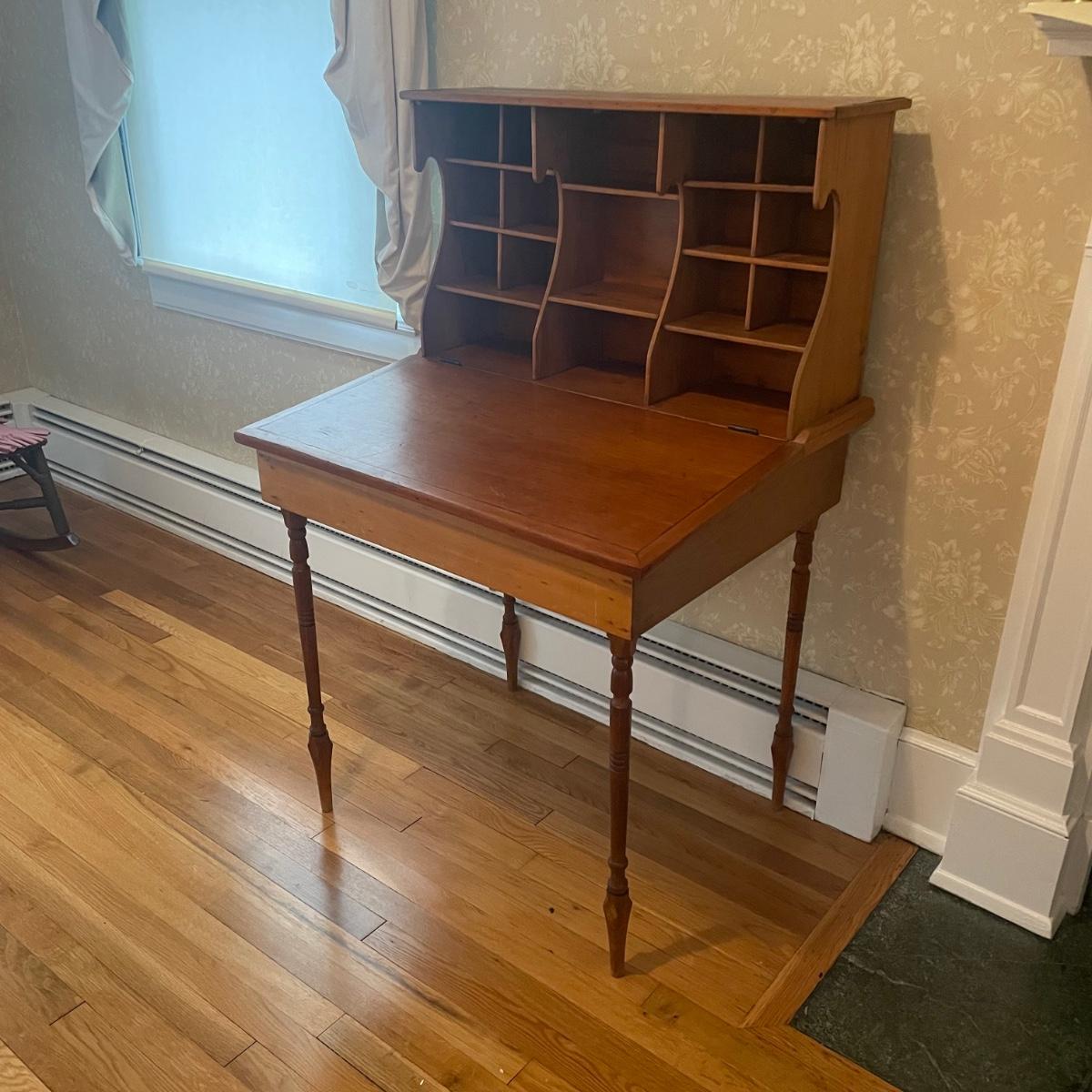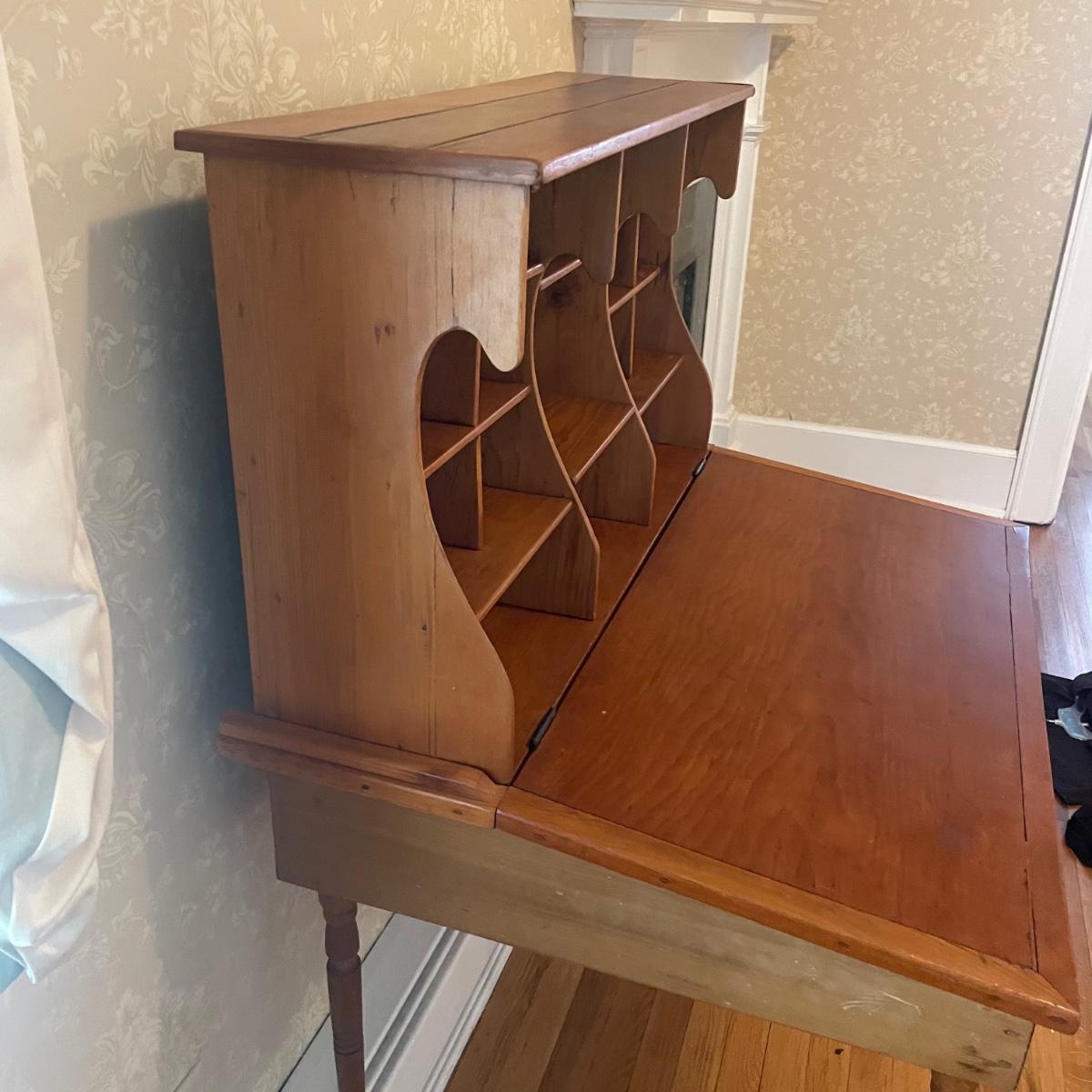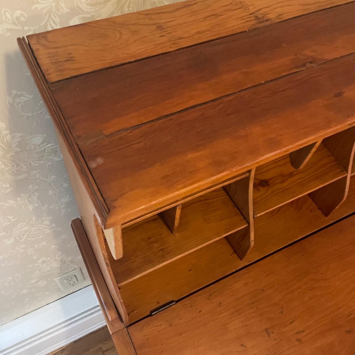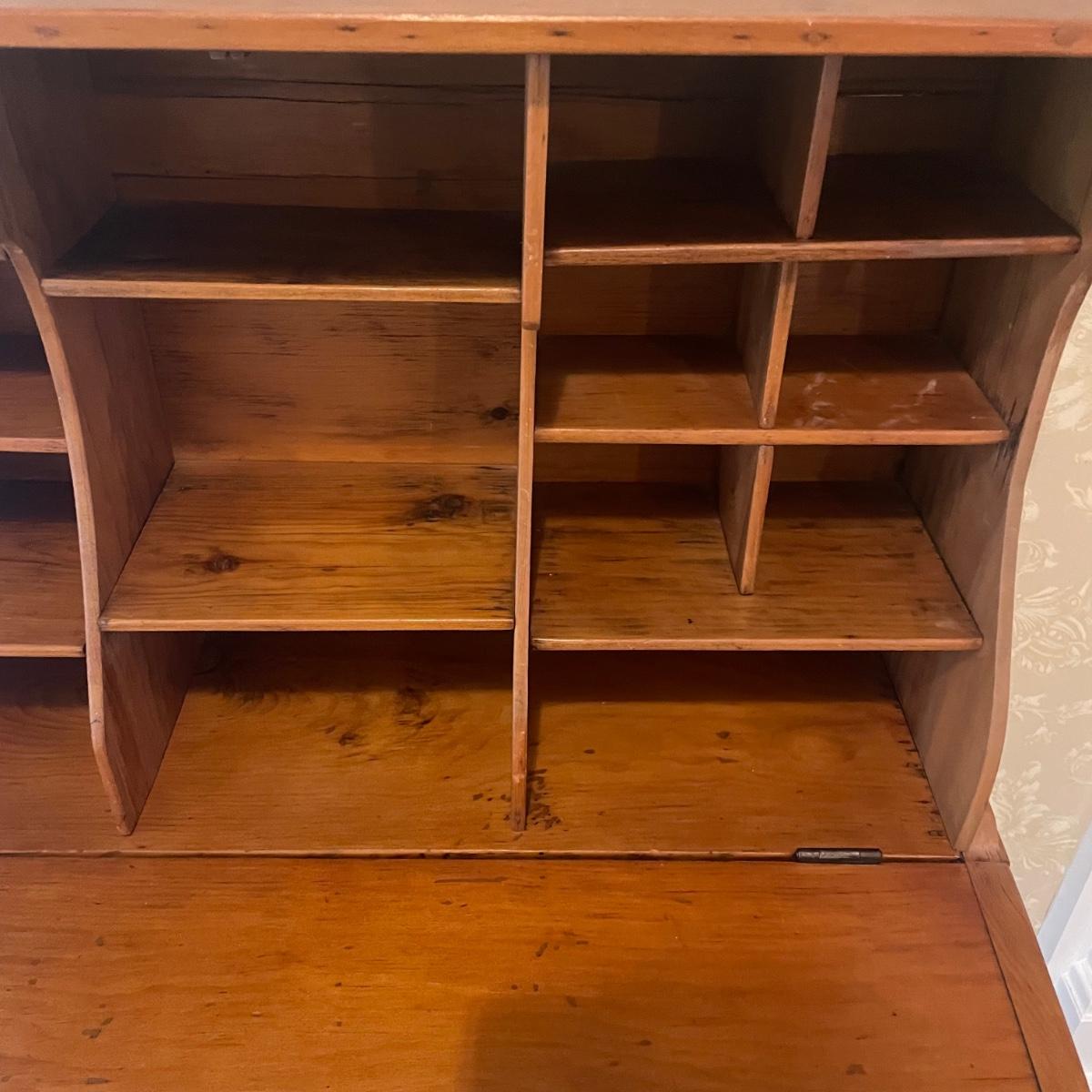 This lightweight plantation slant top Secretary desk has seventeen cubby holes (top section sits, unattached on desk) and their is a large compartment under the slant top. It’s in great condition and measures 32” wide x 26” deep x 50” tall.