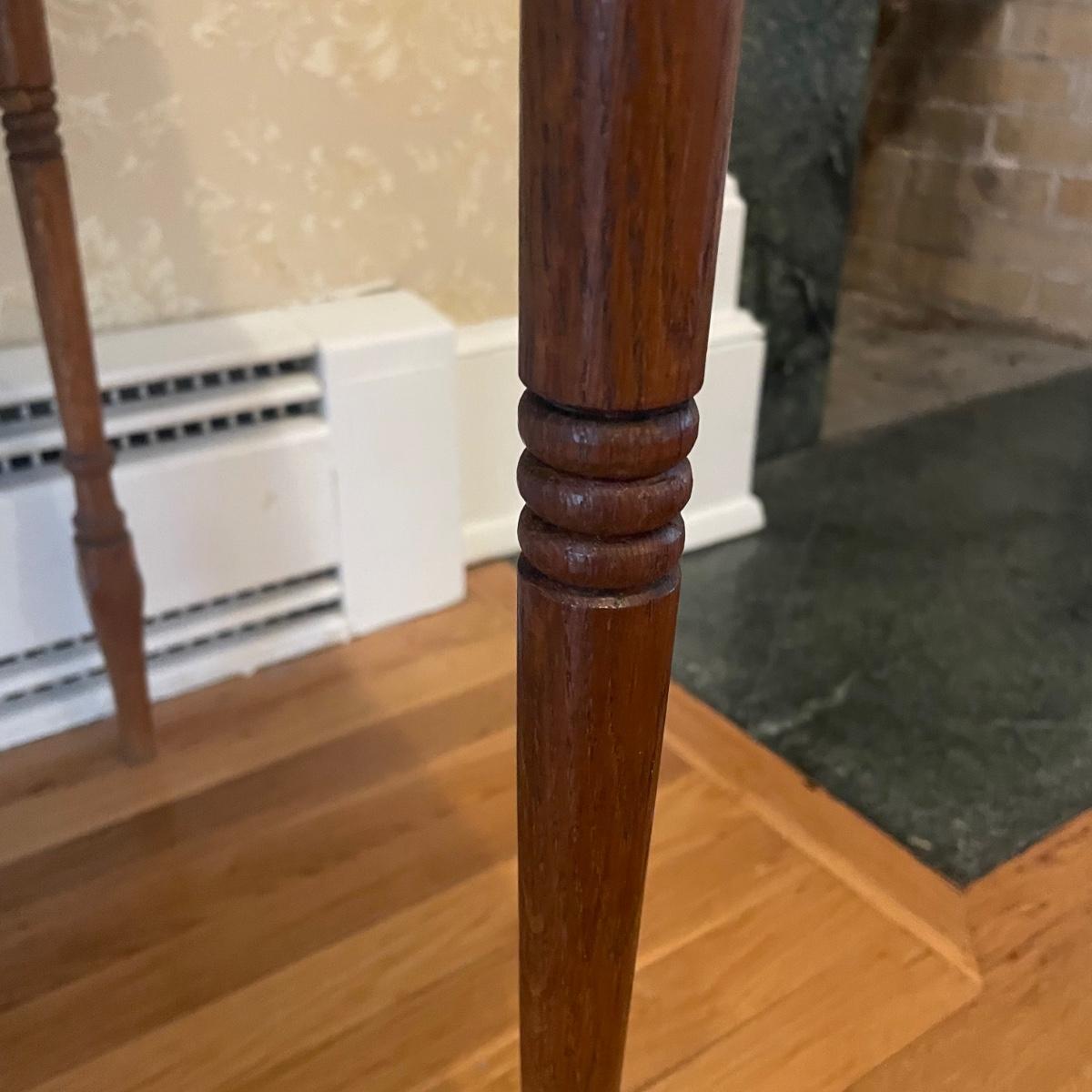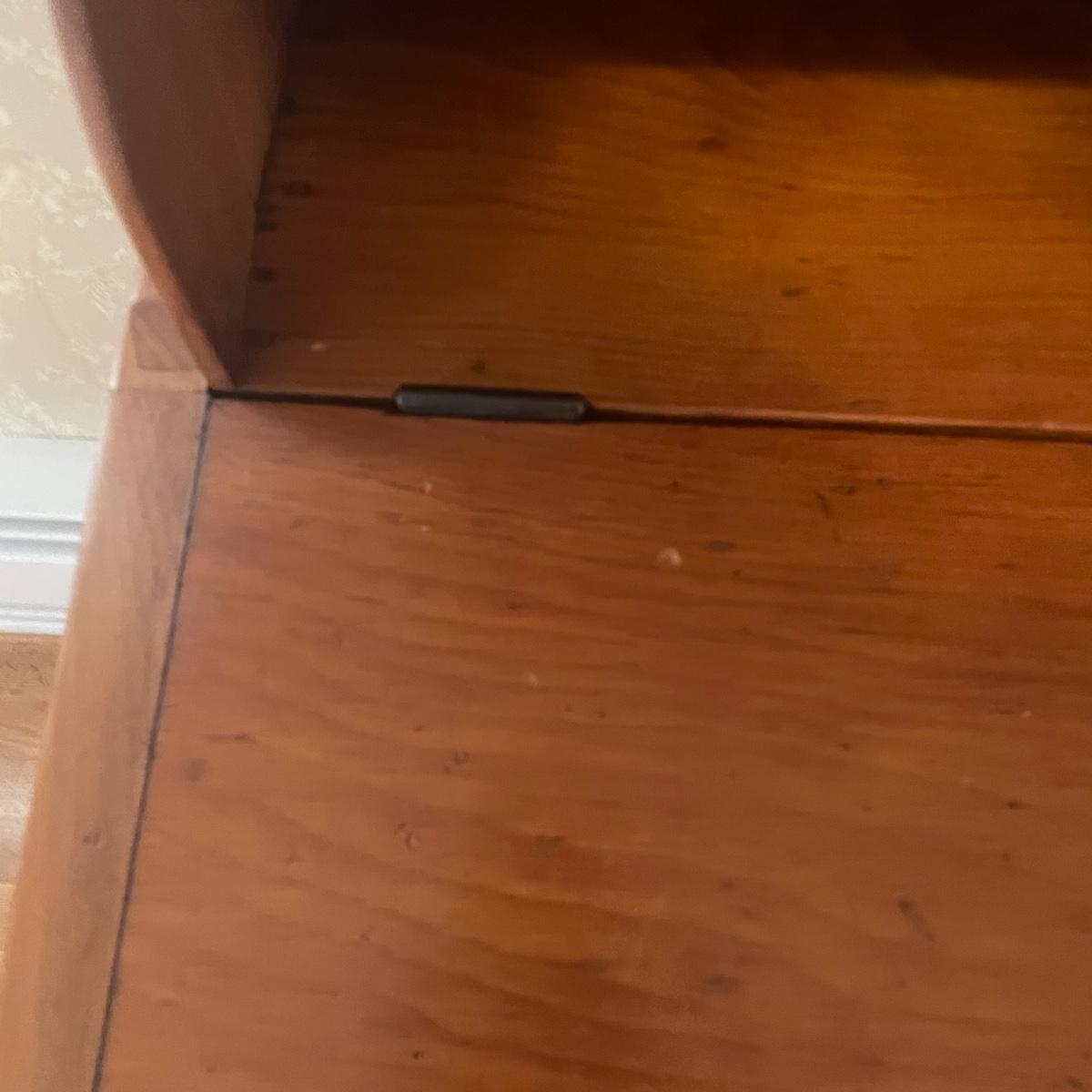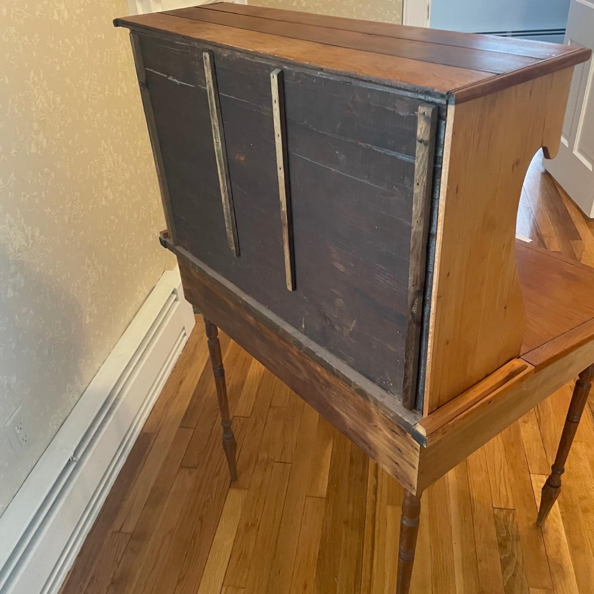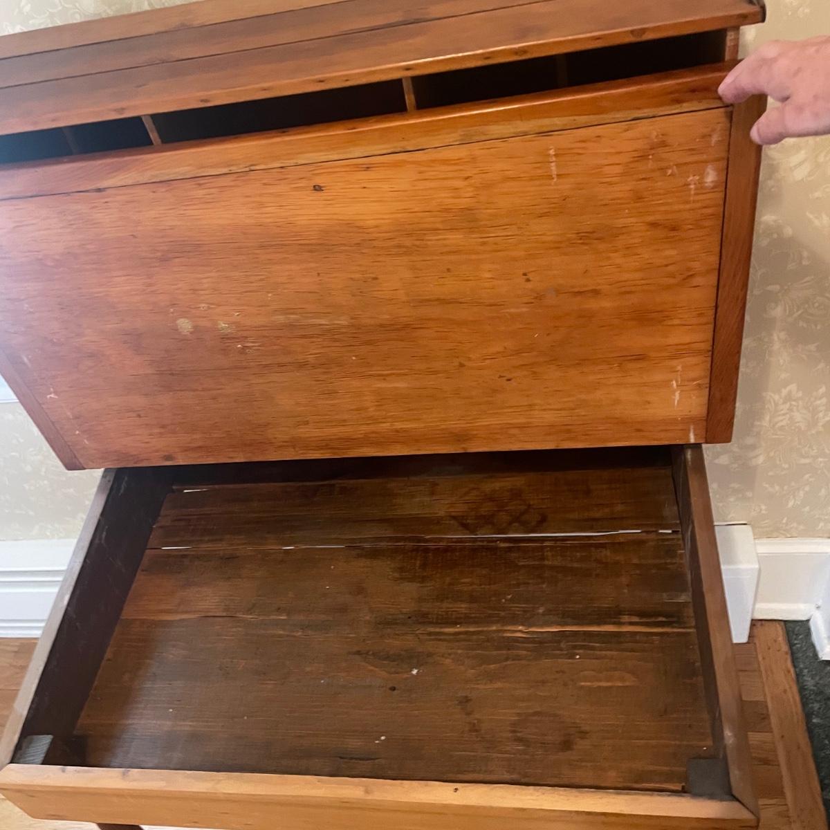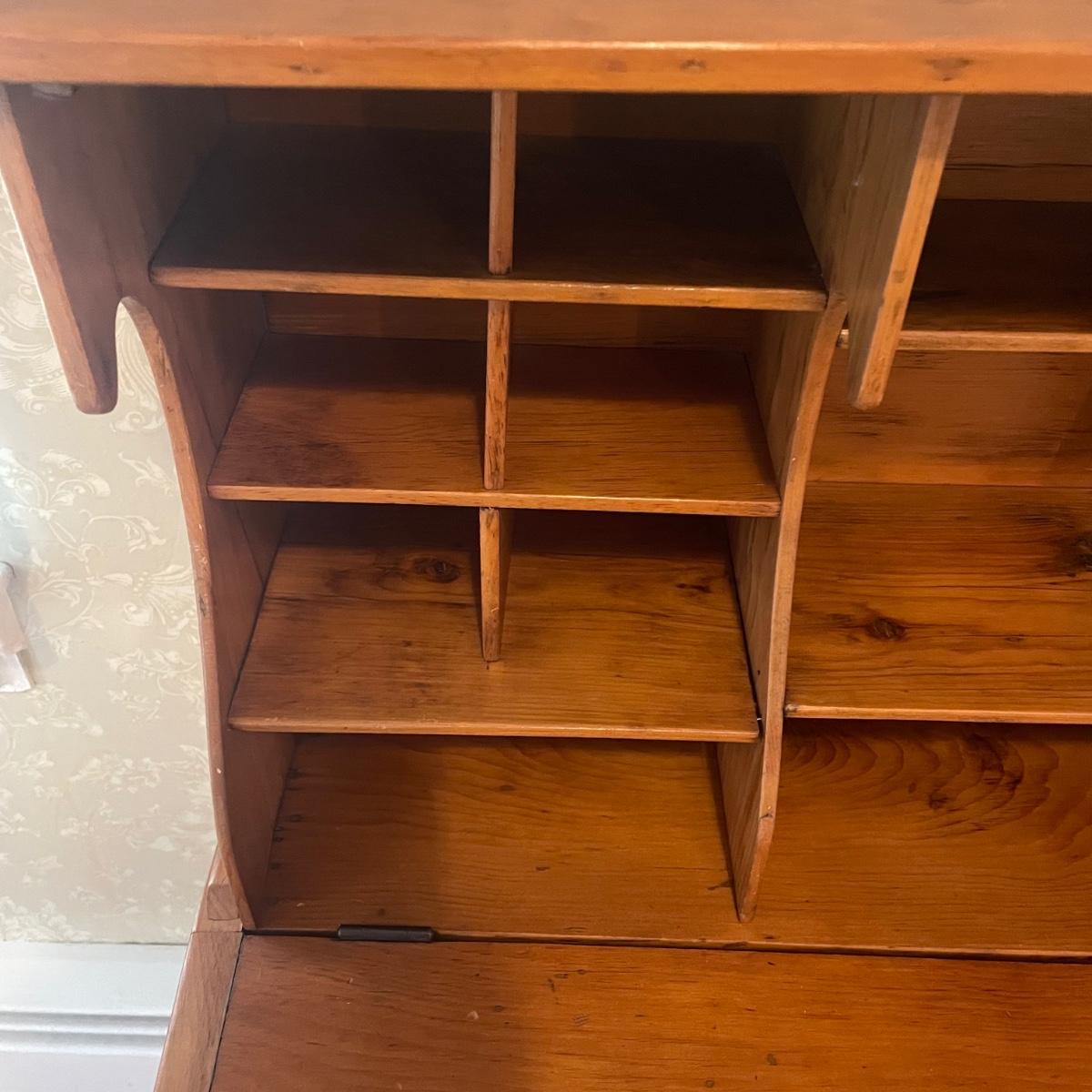 This lightweight plantation slant top Secretary desk has seventeen cubby holes (top section sits, unattached on desk) and their is a large compartment under the slant top. It’s in great condition and measures 32” wide x 26” deep x 50” tall.