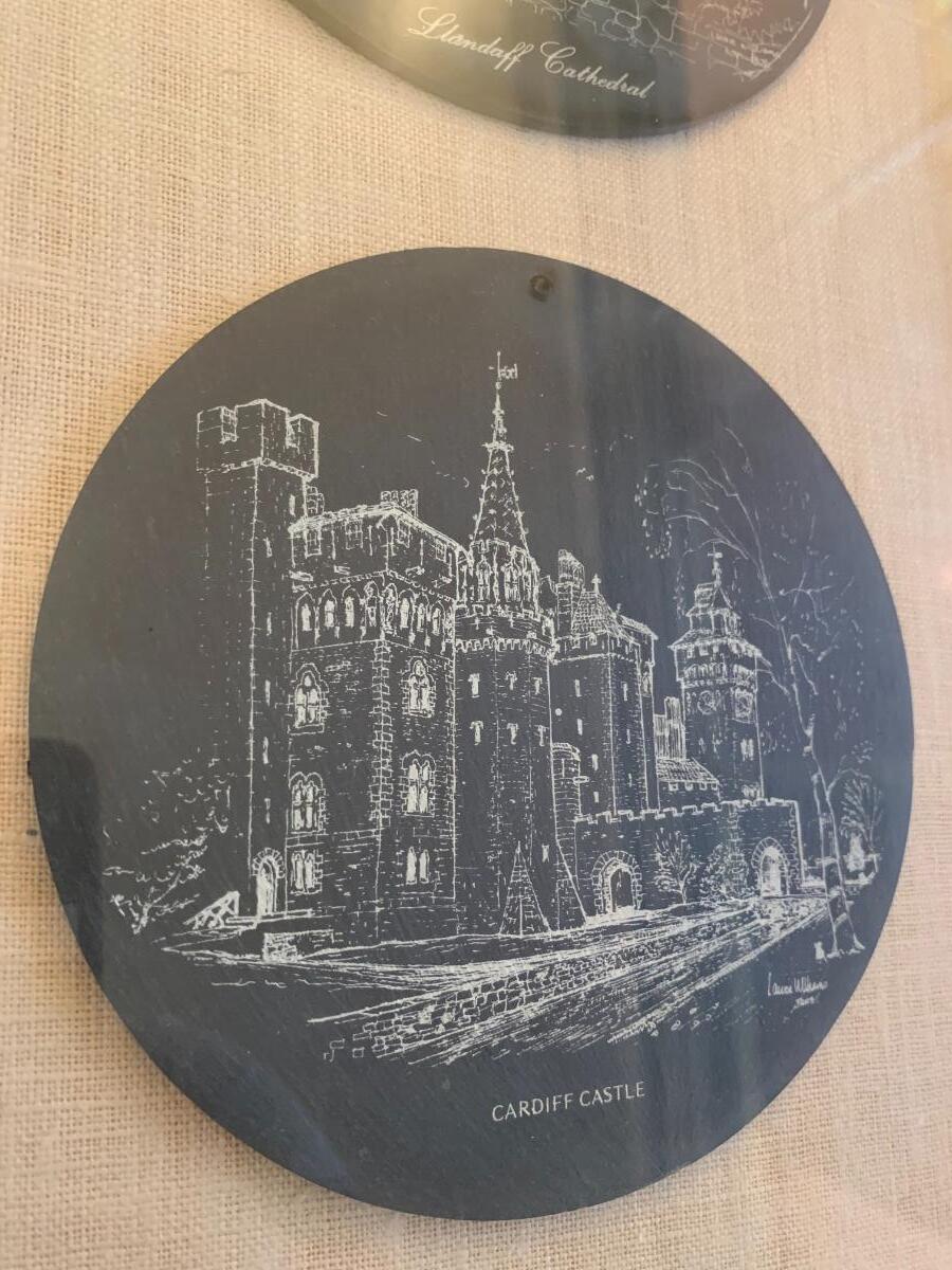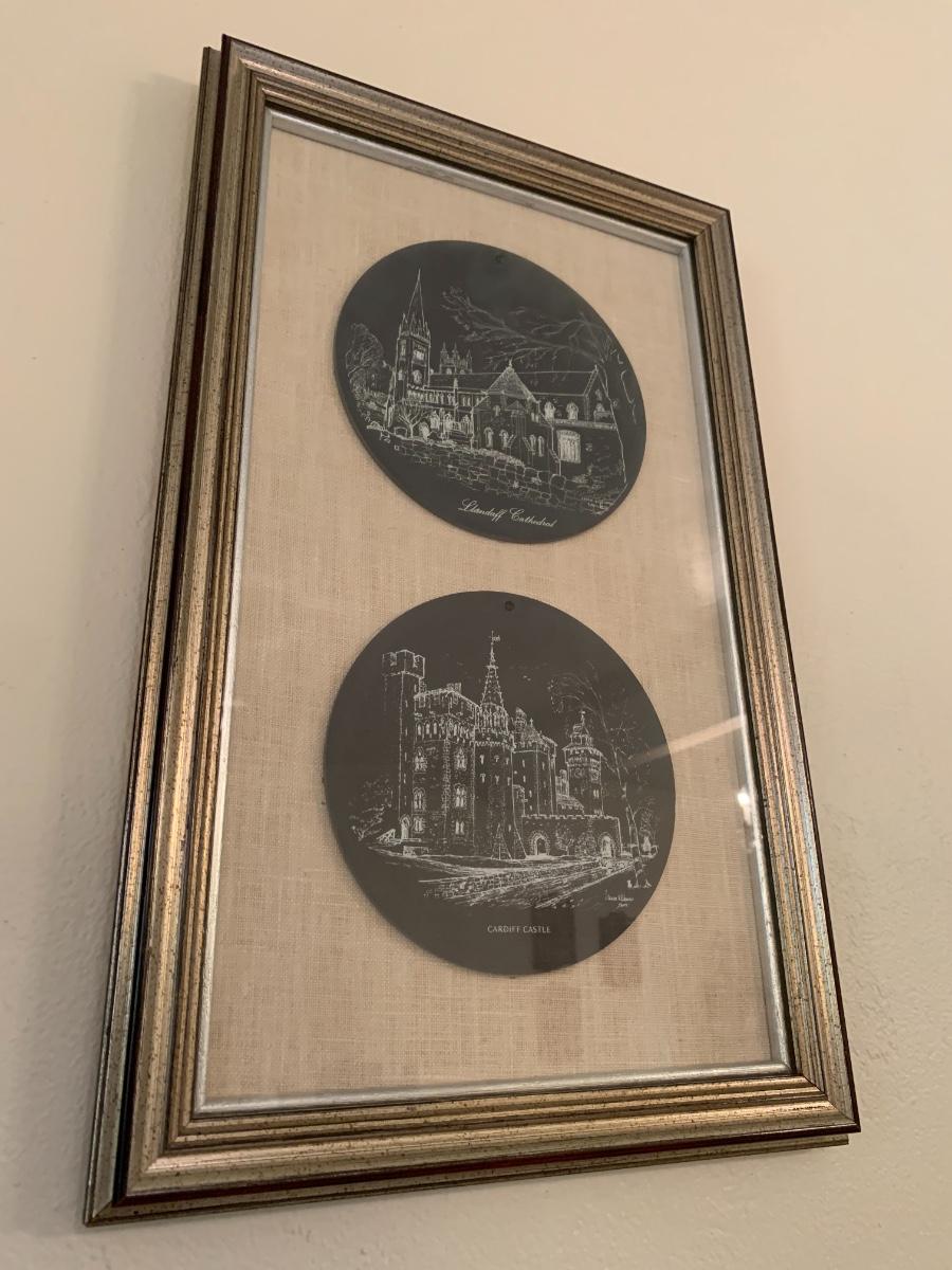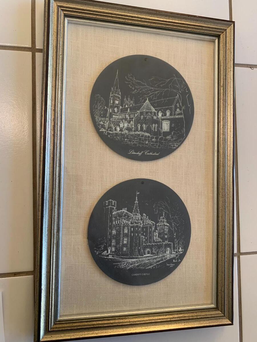 Framed original etched Welsh slate tiles of Cardiff Castle and Llandaff Cathedral by Laurie Williams.