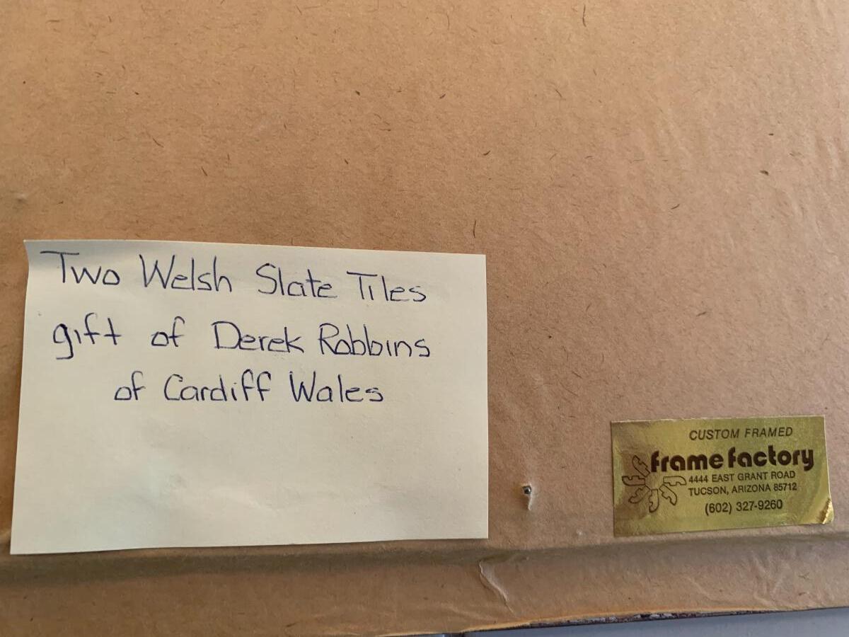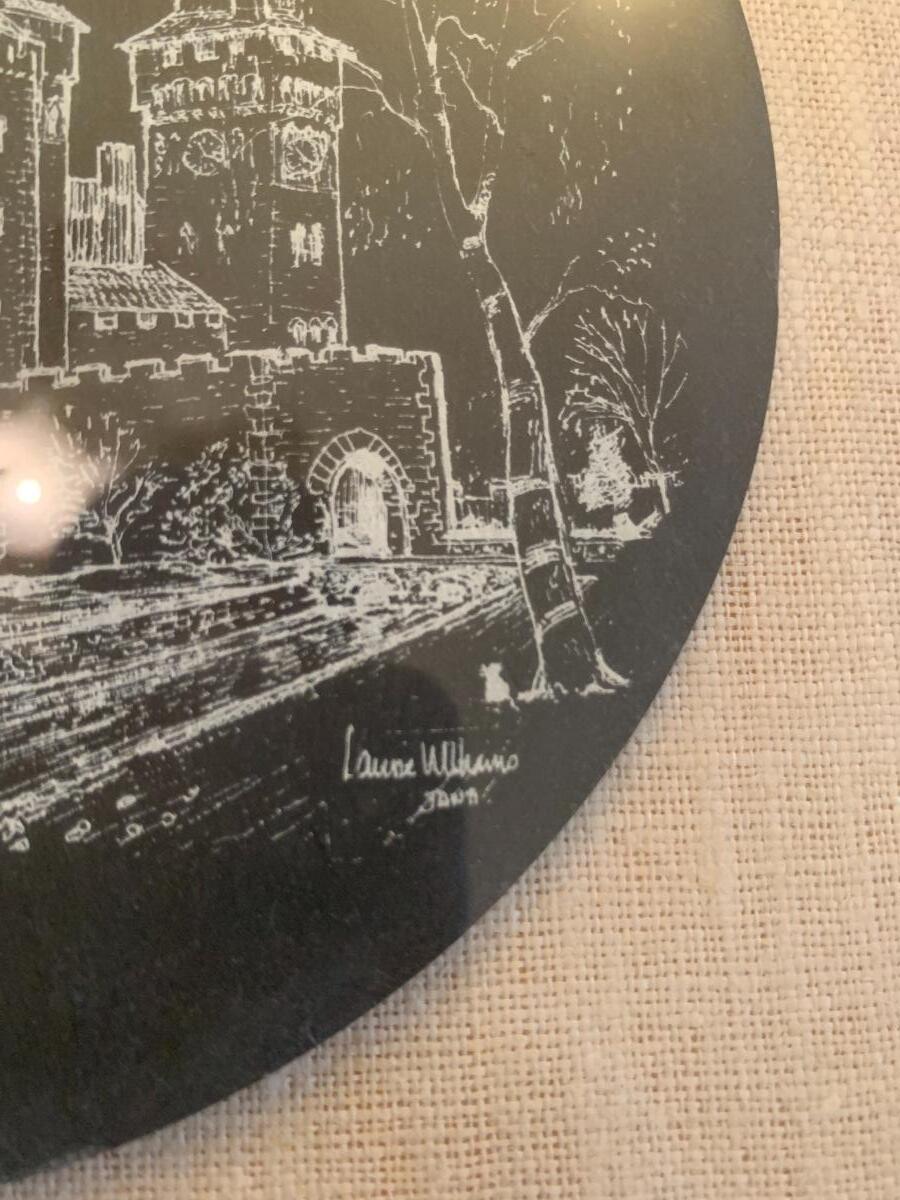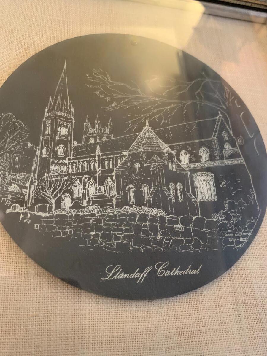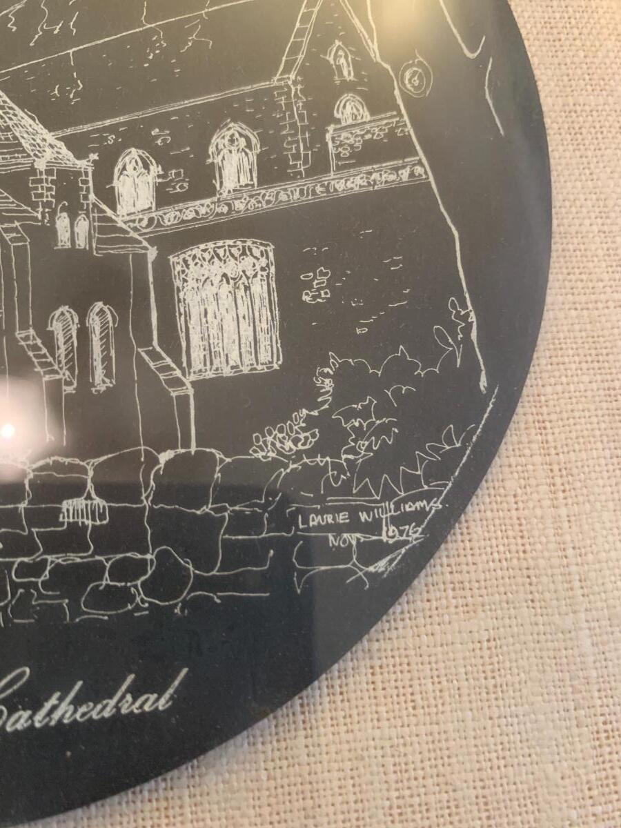 Framed original etched Welsh slate tiles of Cardiff Castle and Llandaff Cathedral by Laurie Williams.