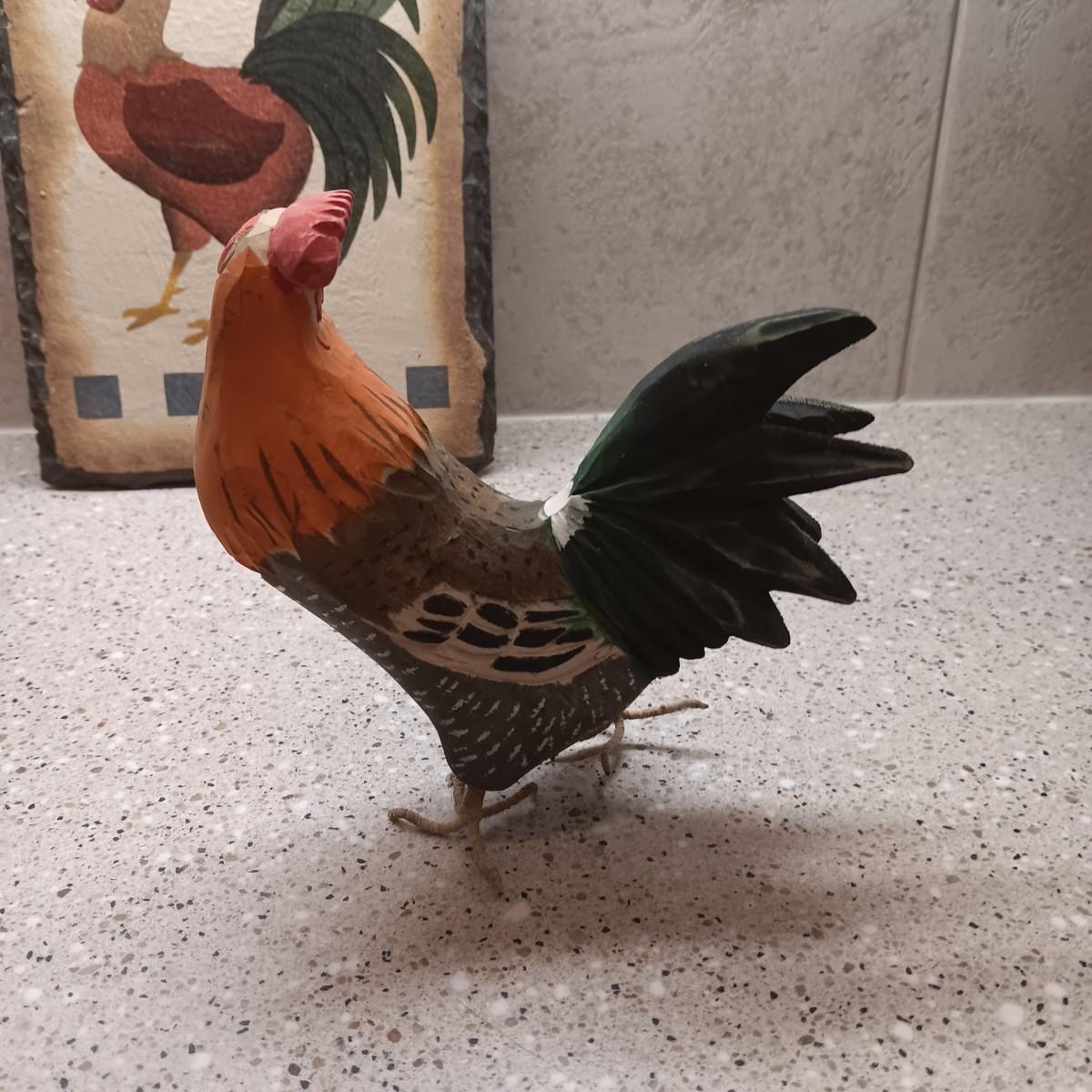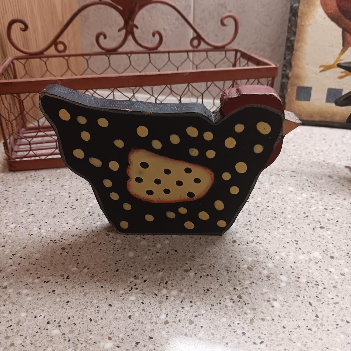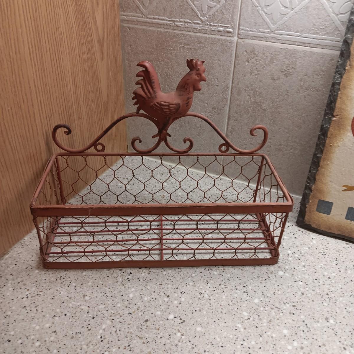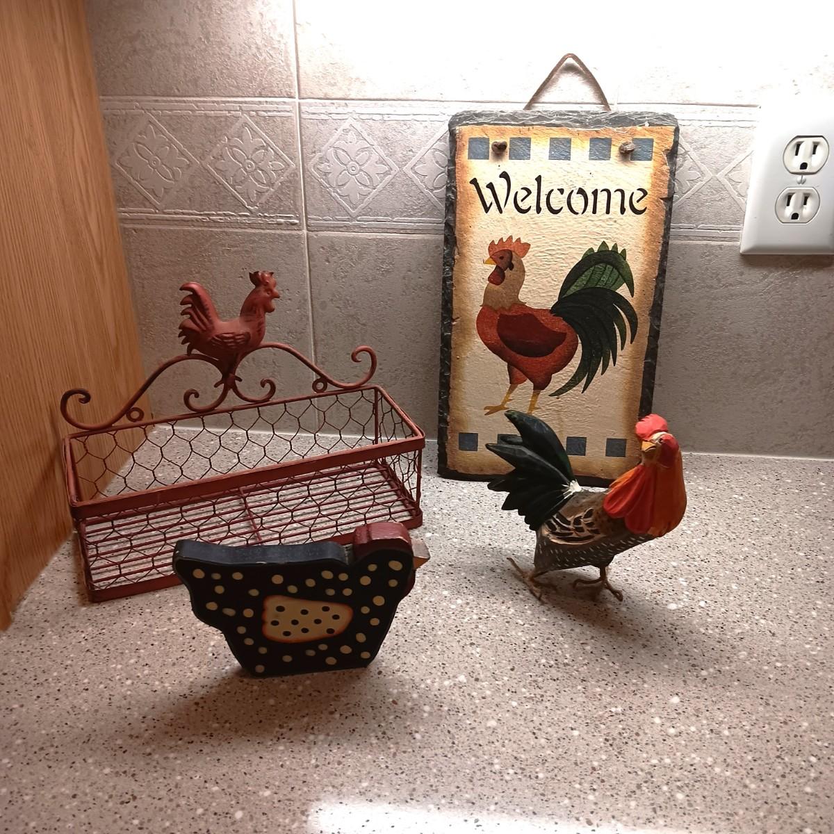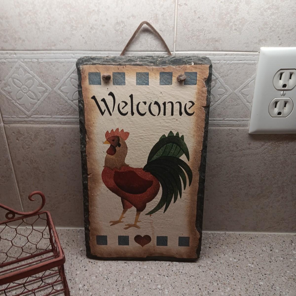SLATE WELCOME SIGN, IRON BASKET AND 2 FREESTANDING ROOSTERS