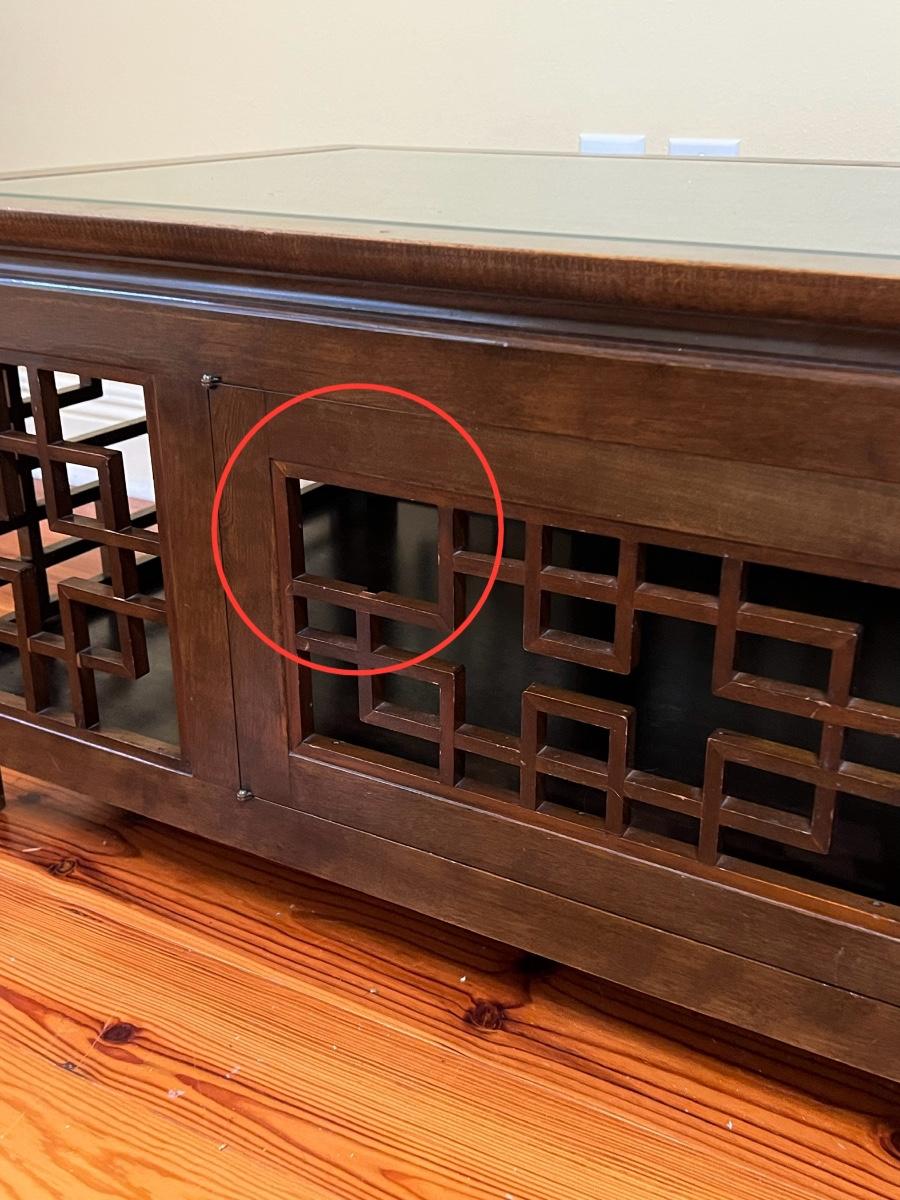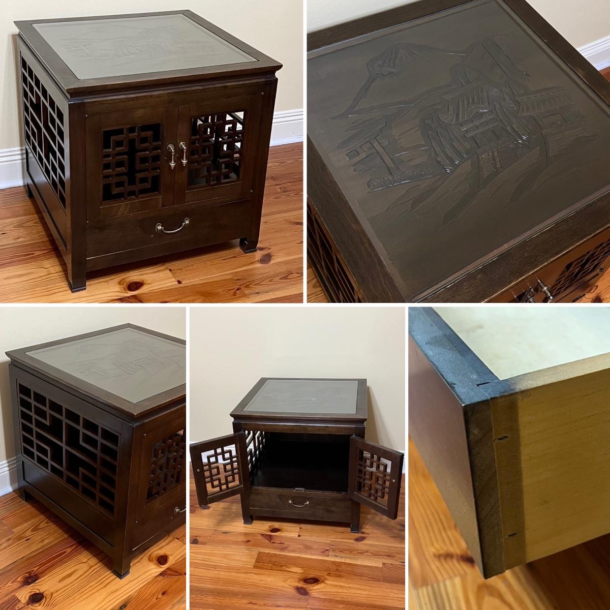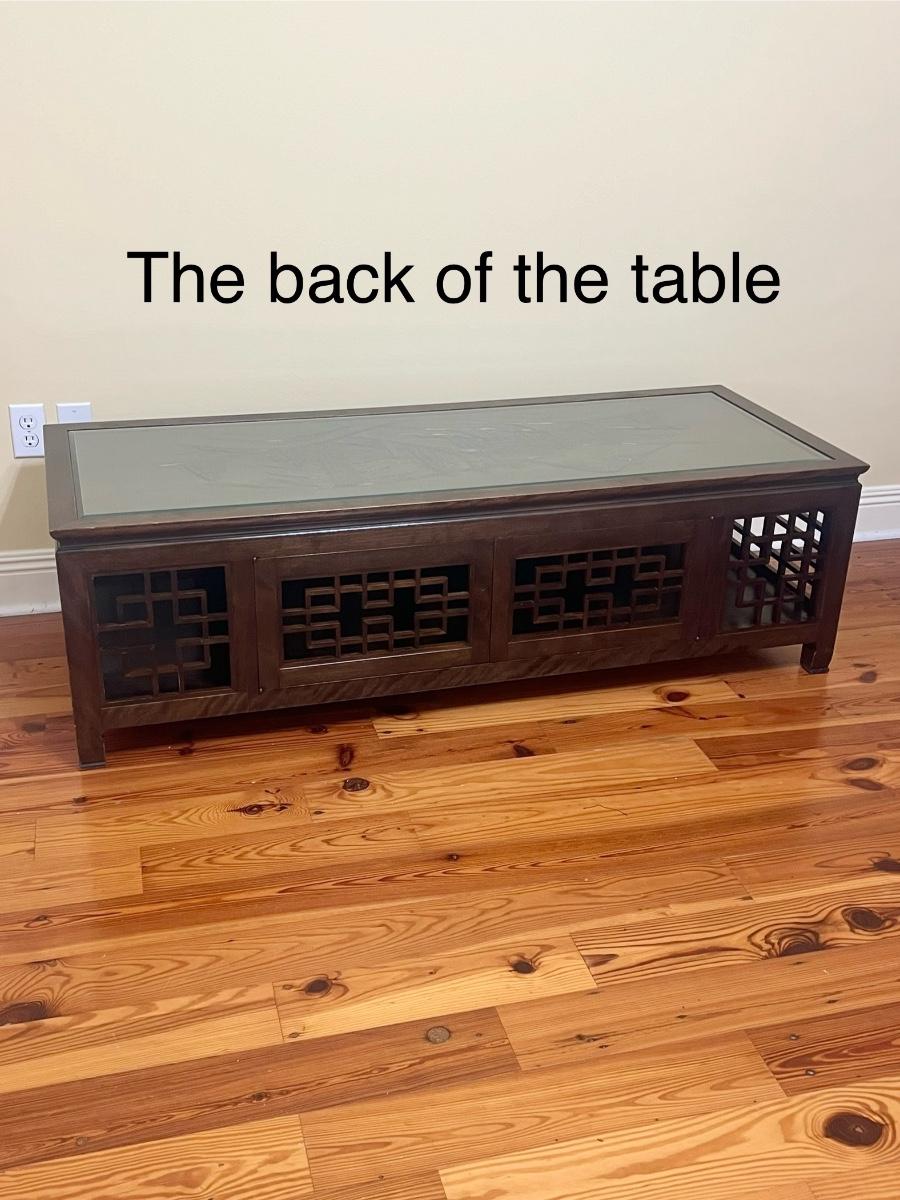 Drawers slide easy ~ Coffee table has doors on both sides ~ The back doors of the coffee table are missing the door knobs & some of the wood paneling has minor damage in spots, see photos ~ No brand ~ Coffee table = 18” H x 60.25” W x 24” D ~ Side tables = 24.25” H x 24” Square