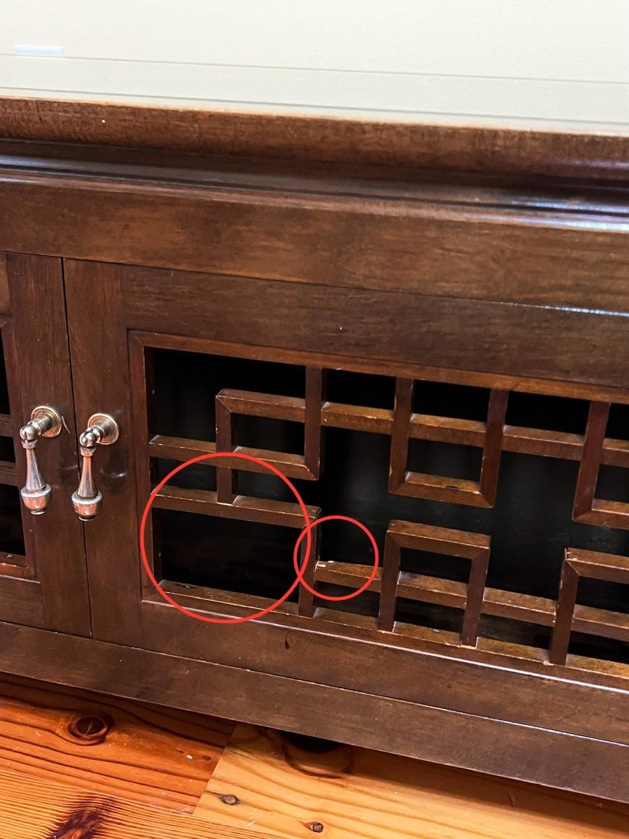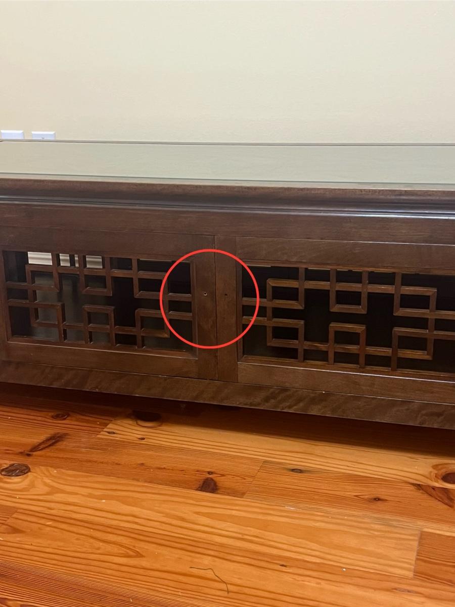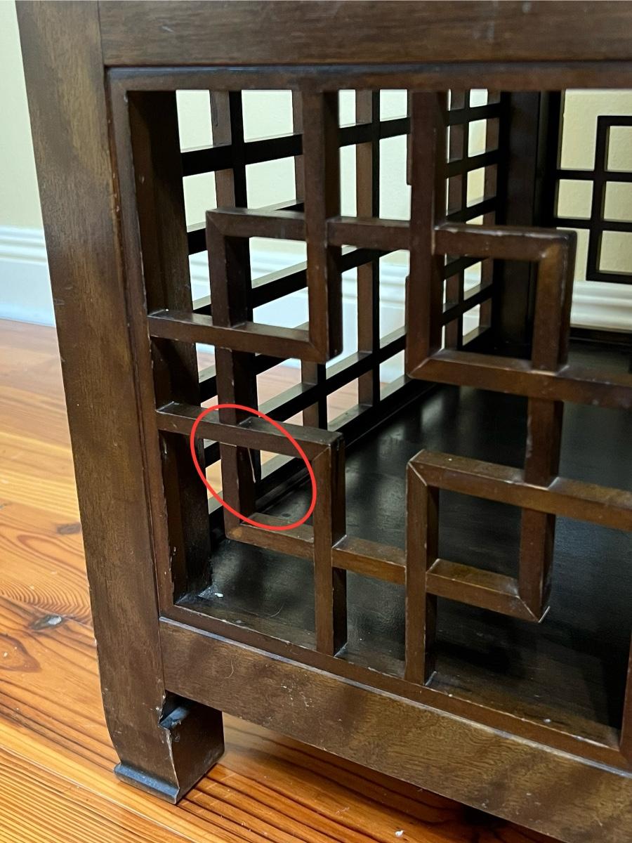 Drawers slide easy ~ Coffee table has doors on both sides ~ The back doors of the coffee table are missing the door knobs & some of the wood paneling has minor damage in spots, see photos ~ No brand ~ Coffee table = 18” H x 60.25” W x 24” D ~ Side tables = 24.25” H x 24” Square