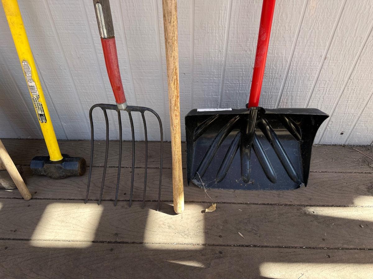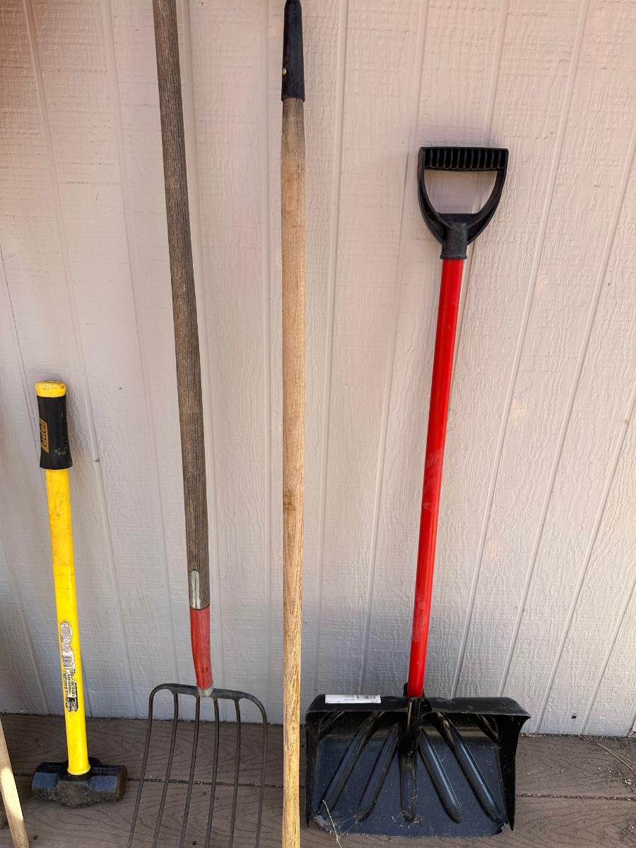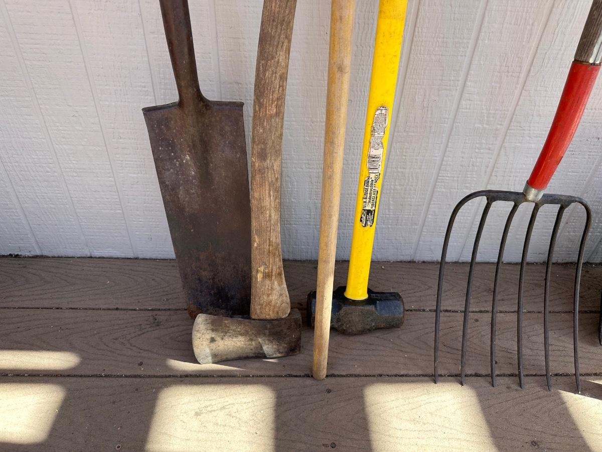 SLEDGE HAMMER, AXE AND VARIOUS YARD TOOLS