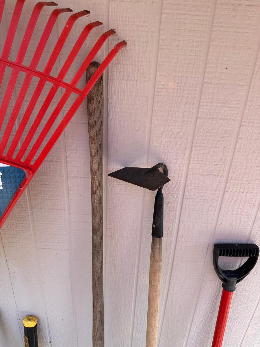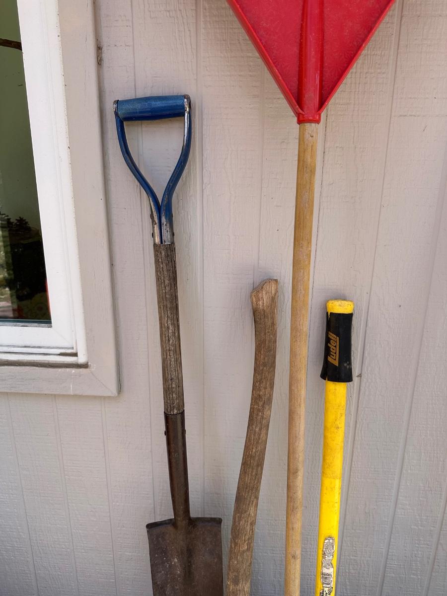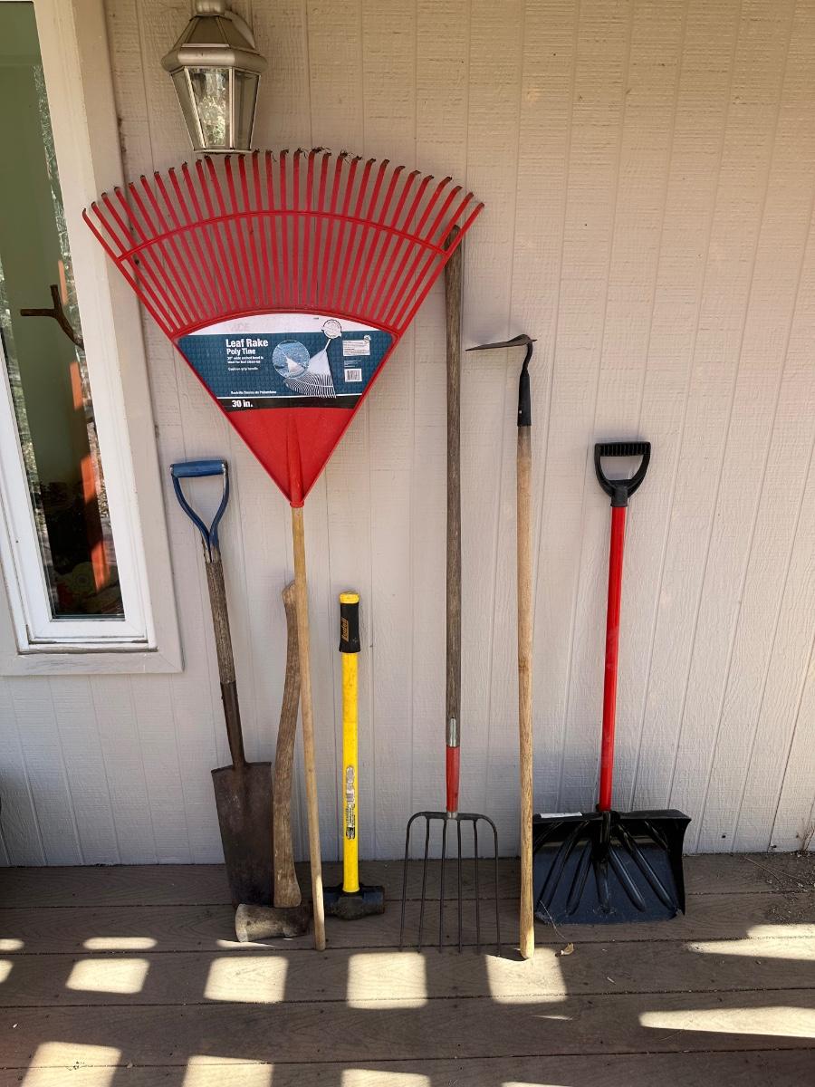 SLEDGE HAMMER, AXE AND VARIOUS YARD TOOLS