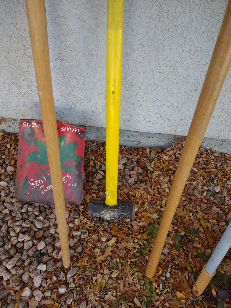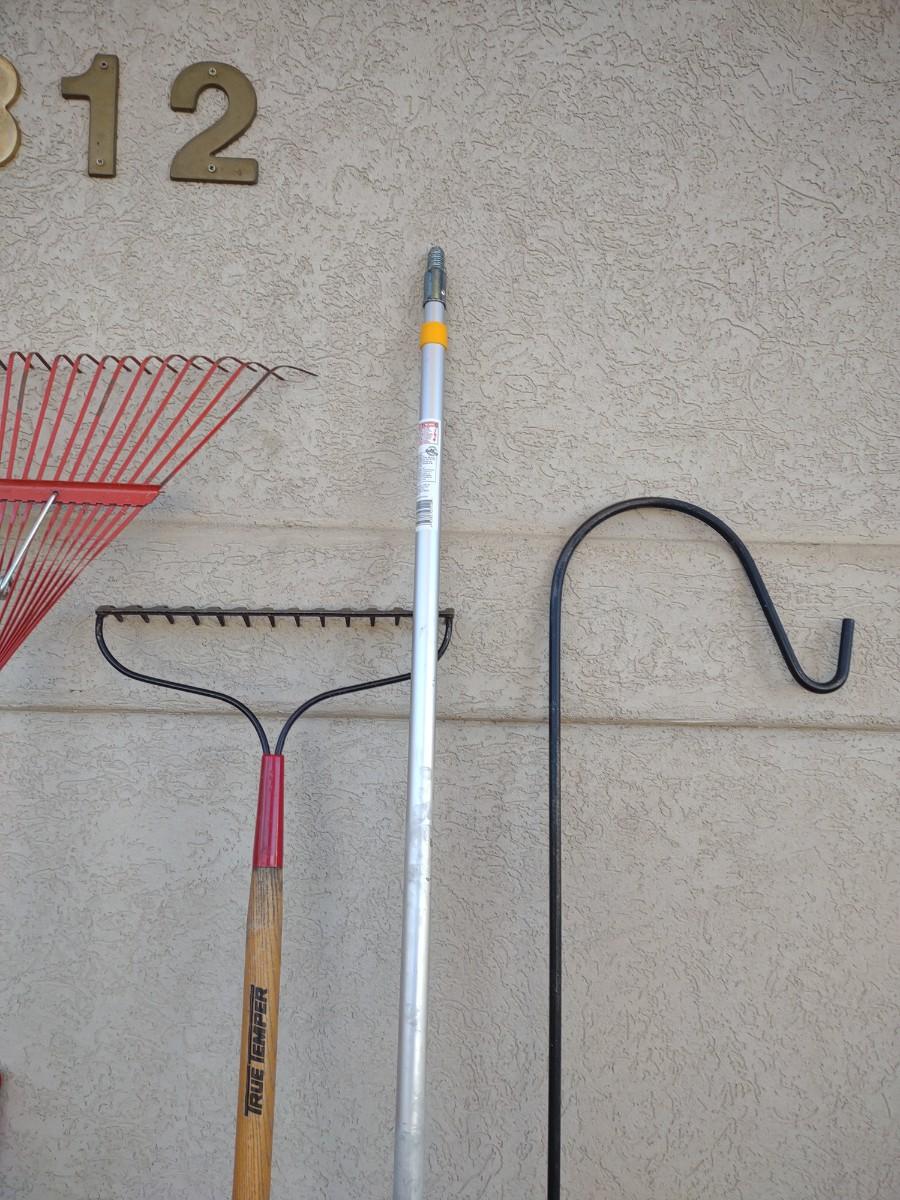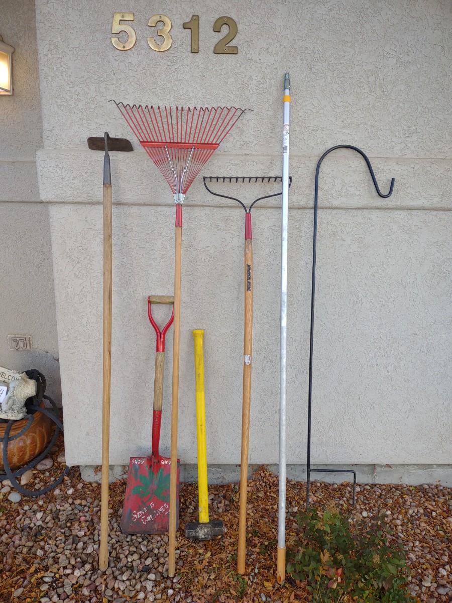 SLEDGE HAMMER, YARD TOOLS AND A SHEPHERDS HOOK
