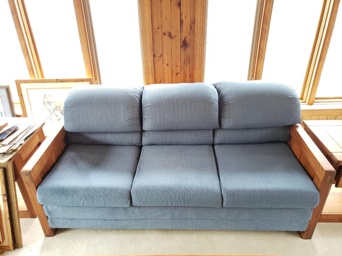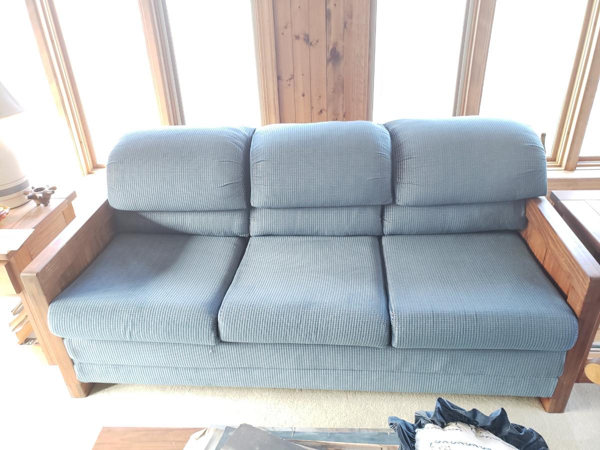 72" in length. The cushions are still firm. This is a heavy piece and will require two people to move down a set of spiral steps. If you don't have help to bring this piece down, DO NOT BID!