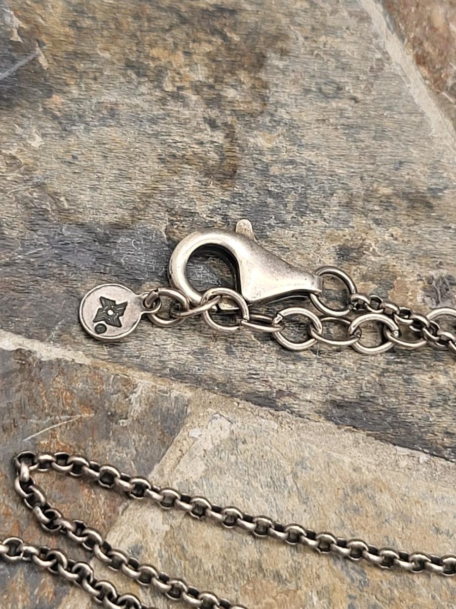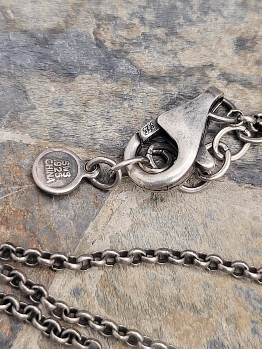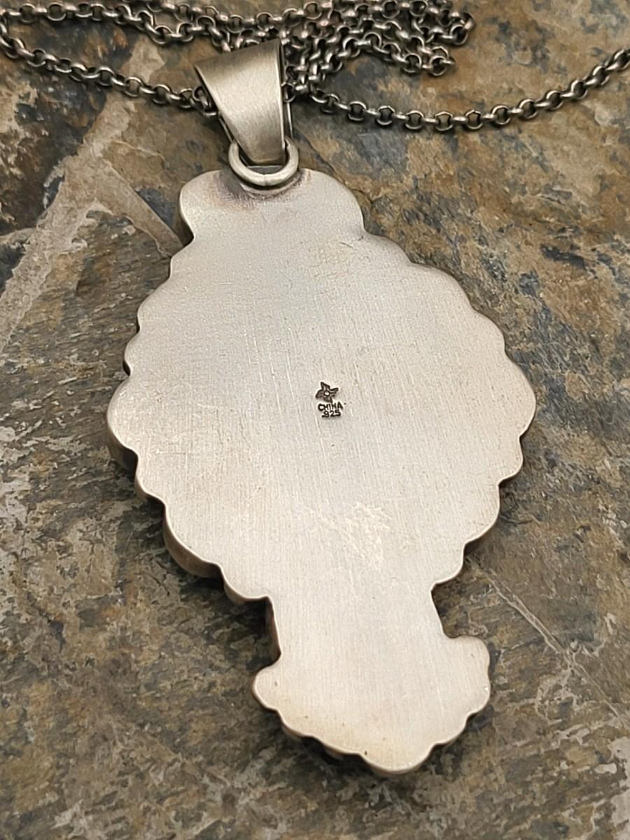 Pendant is 2.5" long x 1.5" at it's widest. It is on a 20" sterling silver chain. Designer SWS. Weighs 26.1 grams.