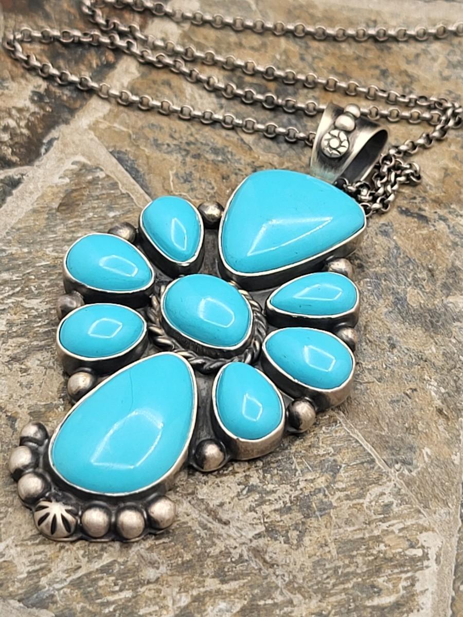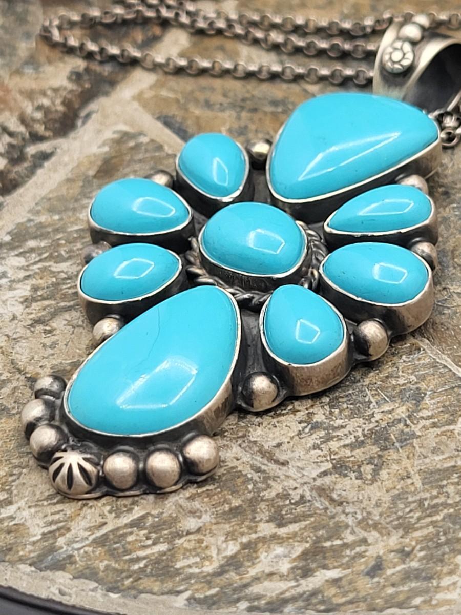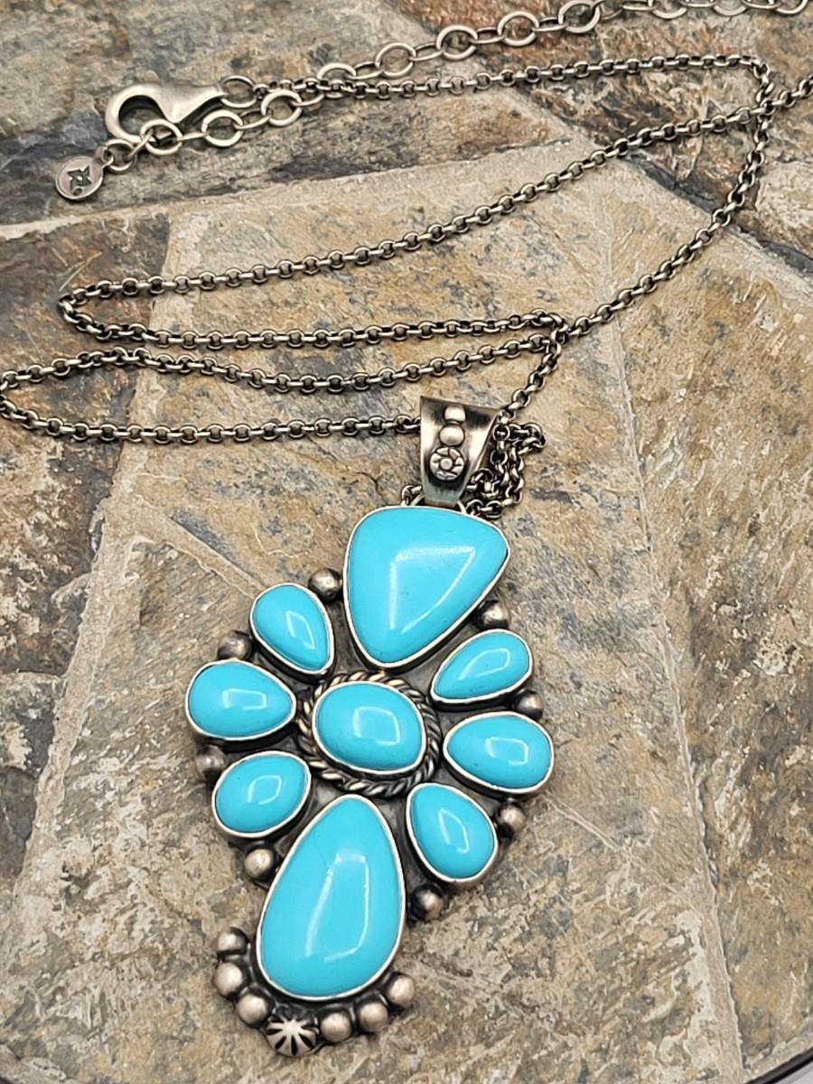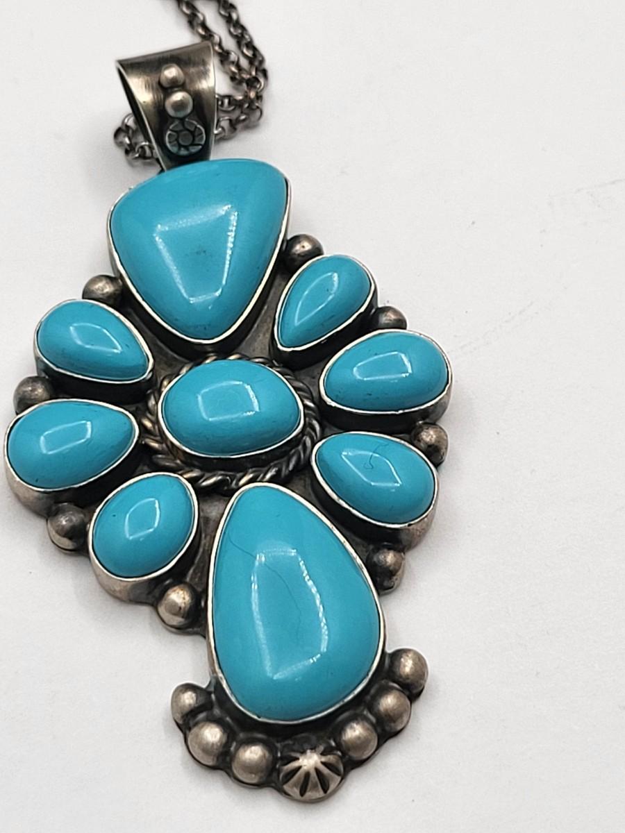 Pendant is 2.5" long x 1.5" at it's widest. It is on a 20" sterling silver chain. Designer SWS. Weighs 26.1 grams.