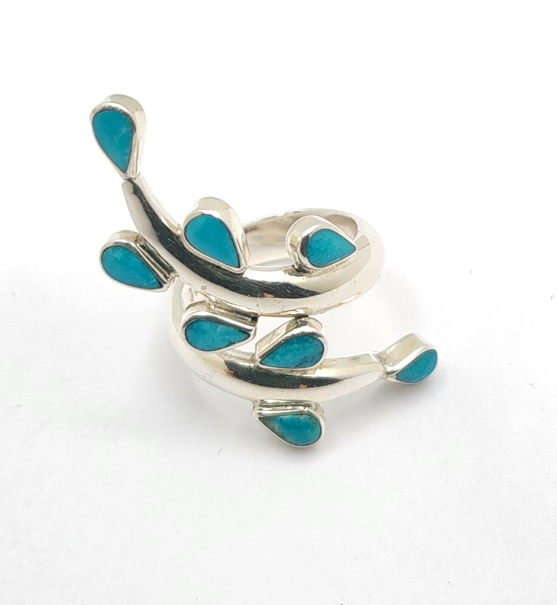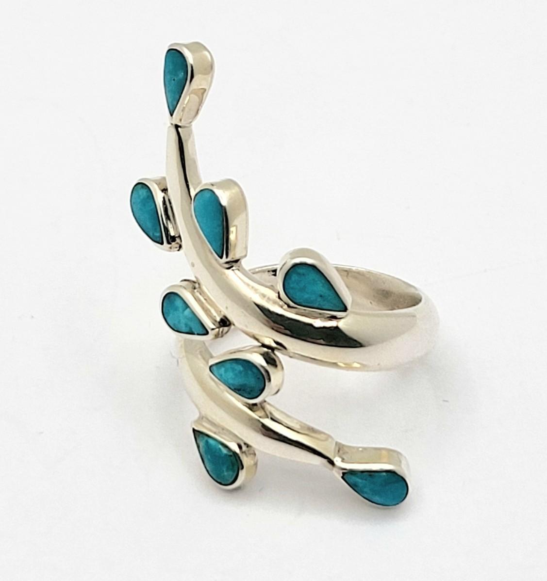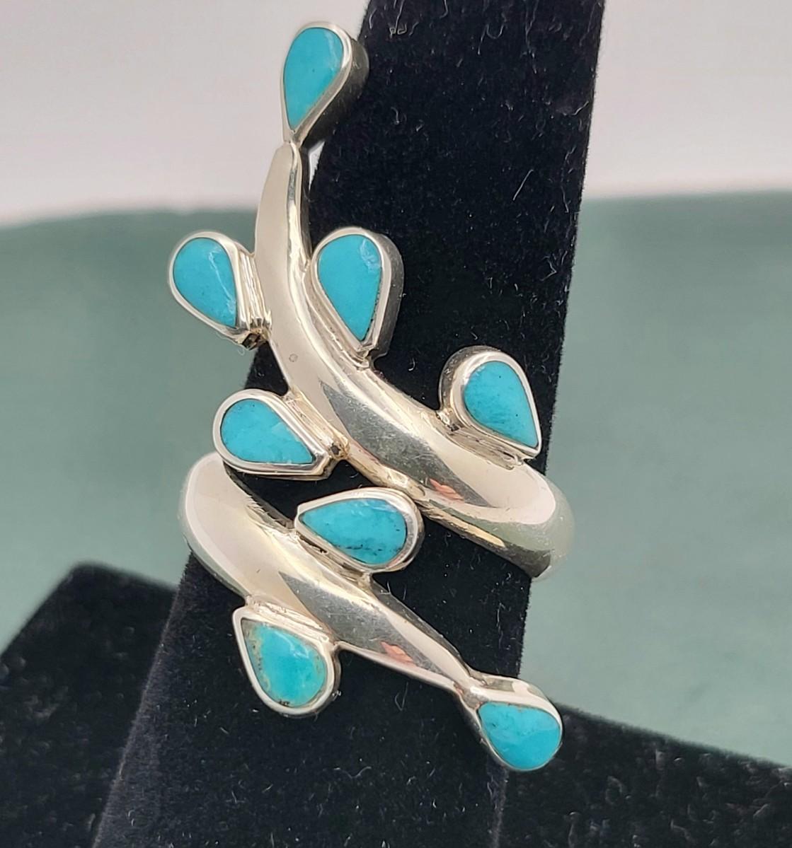 Size 7.5, eight teardrop turquoise inlay bypass ring, 925 Mexico. Measures 1.75" long x .75" wide. Weighs 9.4 grams.
