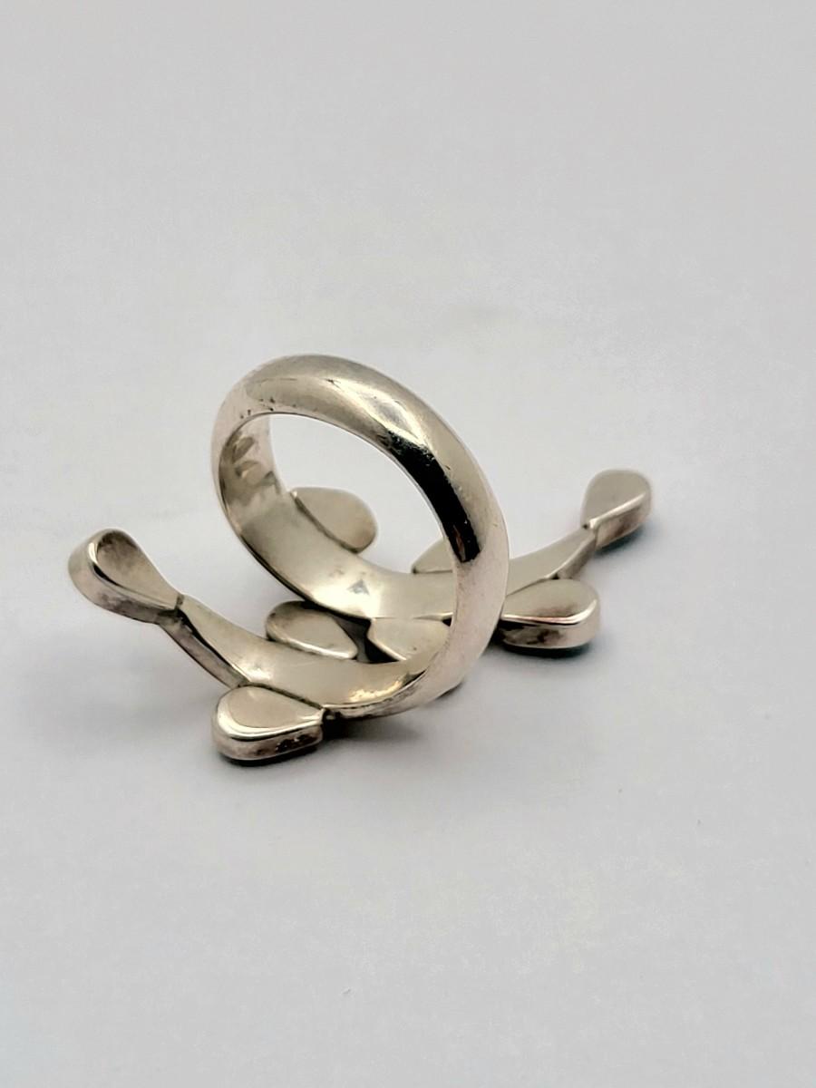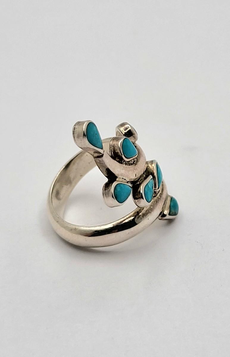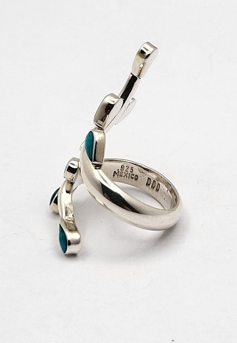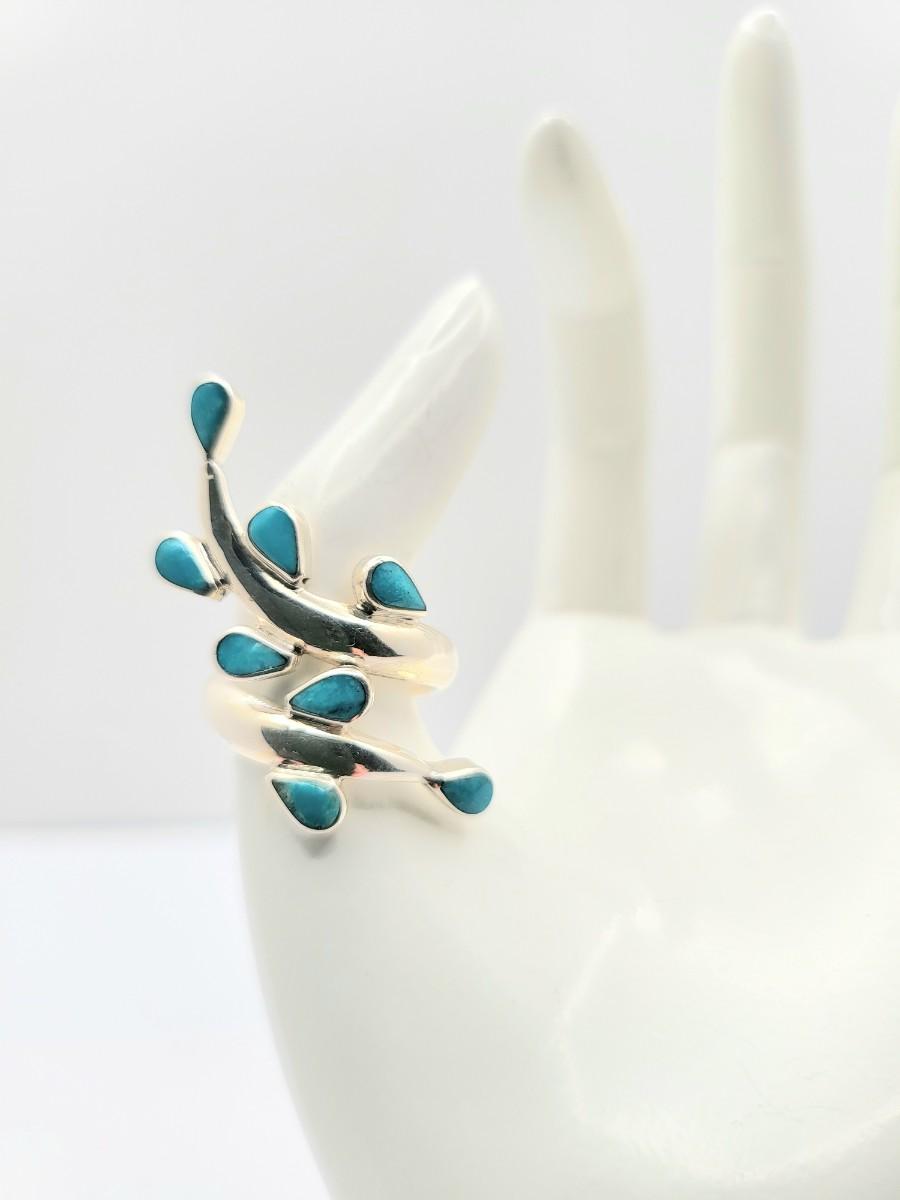 Size 7.5, eight teardrop turquoise inlay bypass ring, 925 Mexico. Measures 1.75" long x .75" wide. Weighs 9.4 grams.