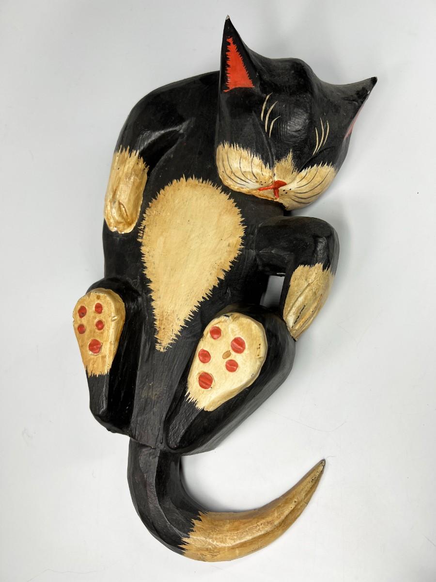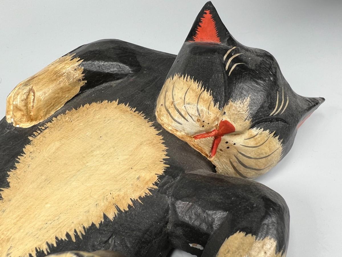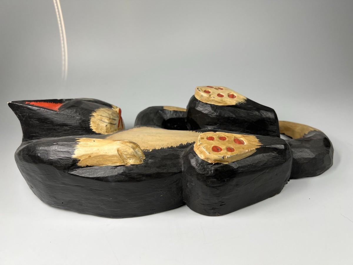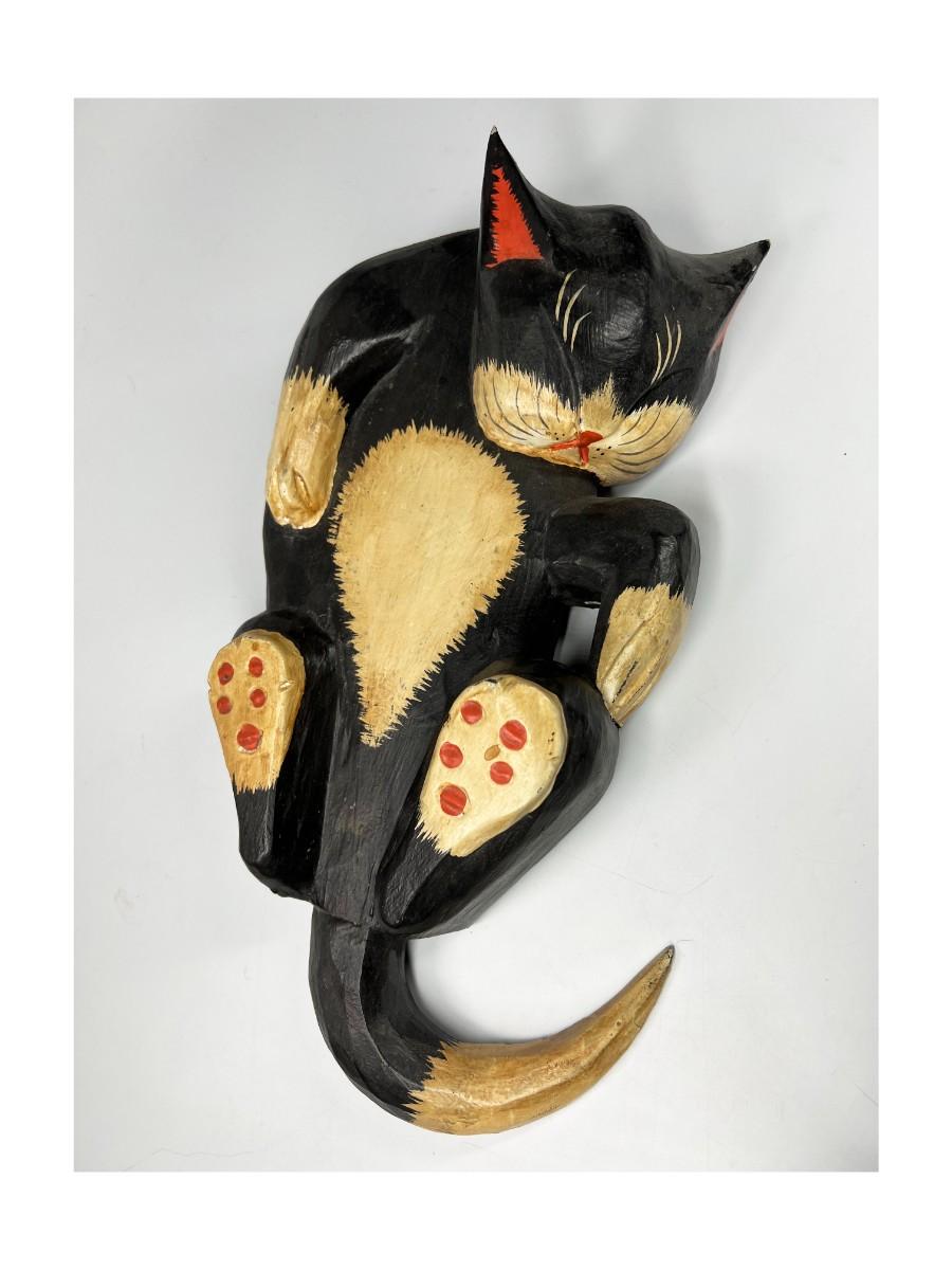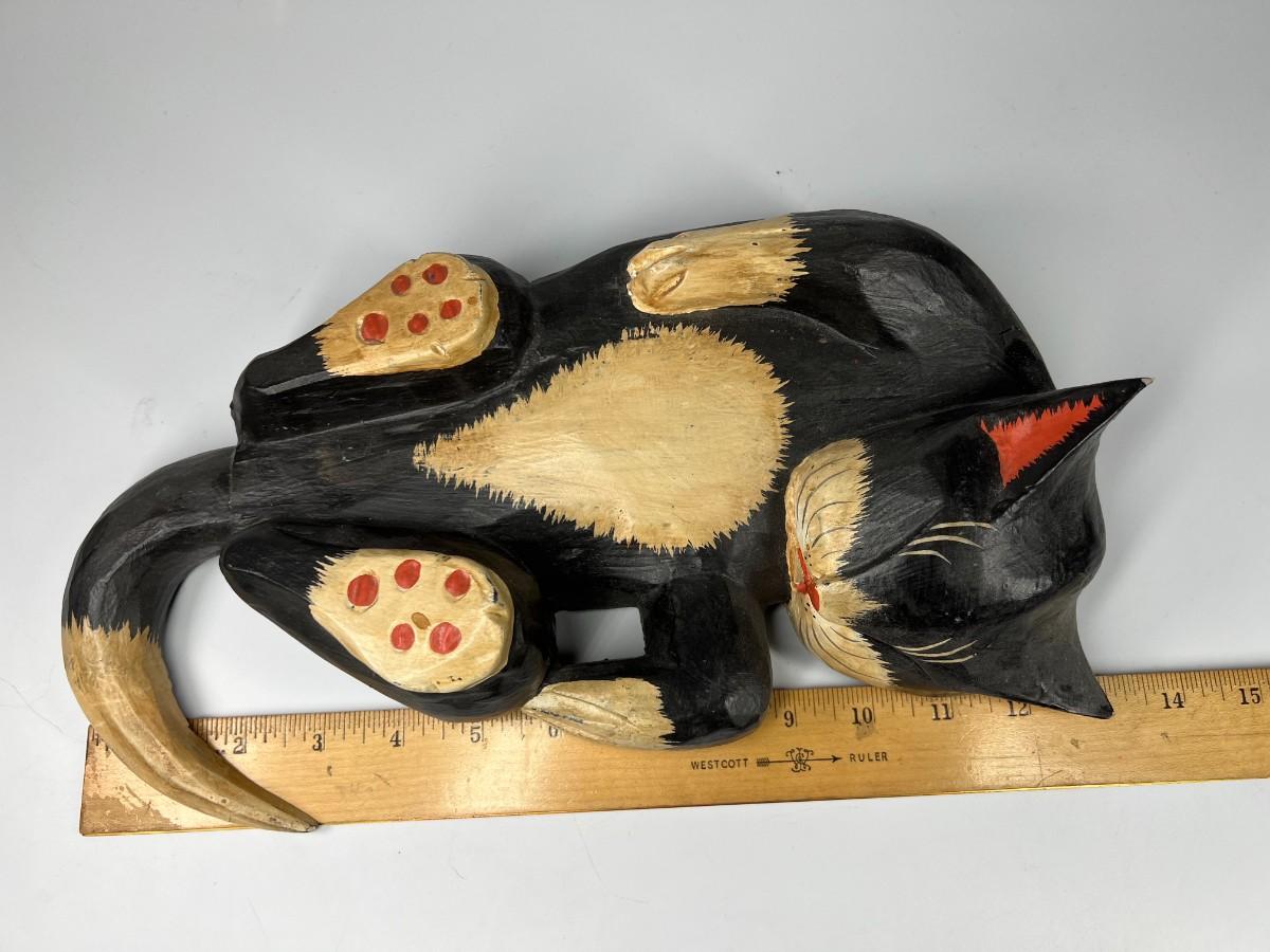 Sleeping Black Cat Carved Wood Garden Art Indoor & Outdoor Decor, there are some scuffs, but there is no significant damage and is in good displayable condition. Check pictures for more details and for sizing.