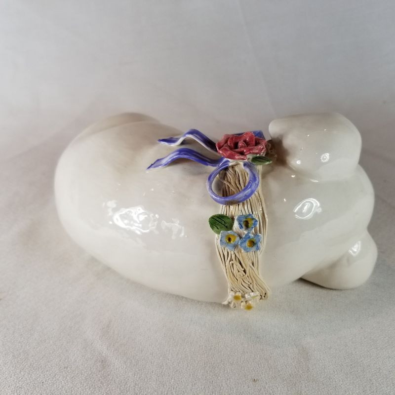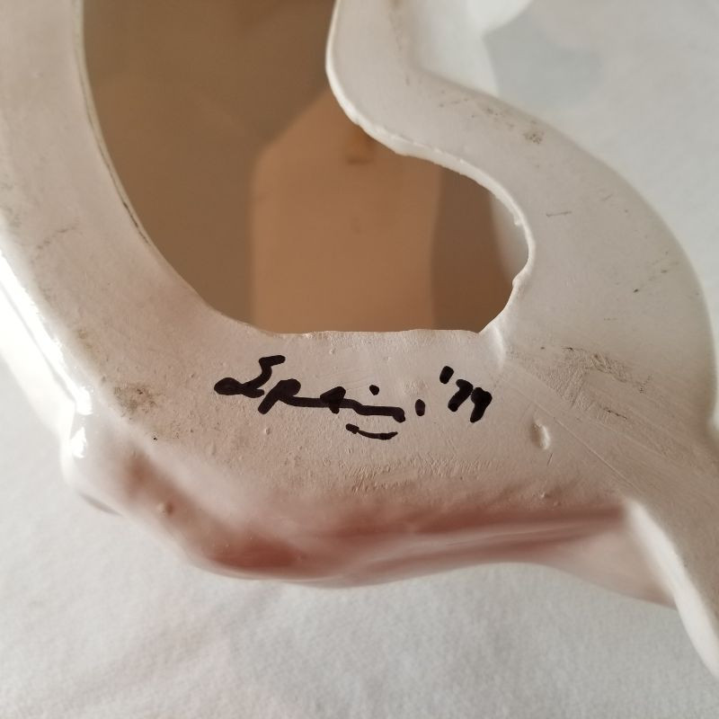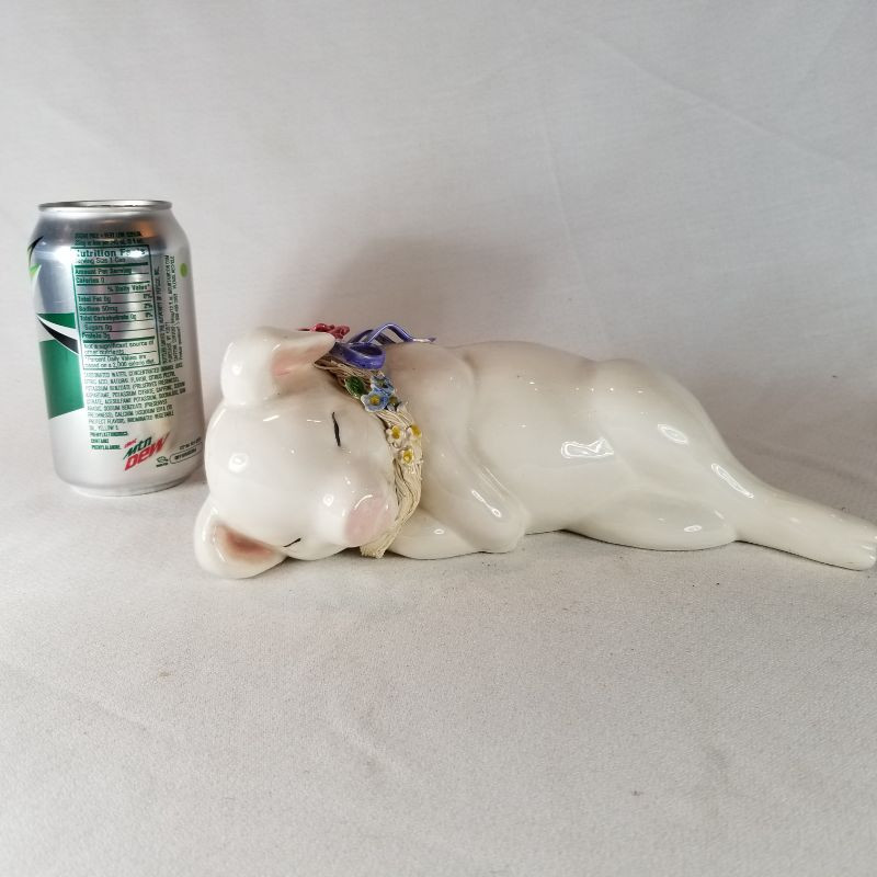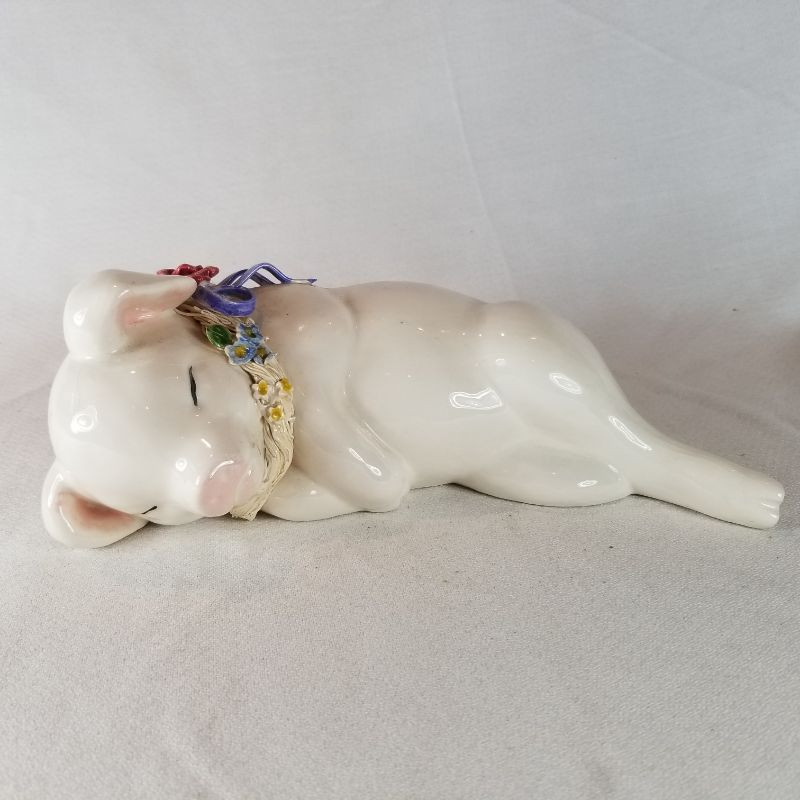 A very sweet and cute artist-made sleeping pig. 10-inches long X 5-inches wide X 3-1/2-inches tall. Looks great on an upper shelf. Artist signed on bottom. In very good condition, no chips or cracks.