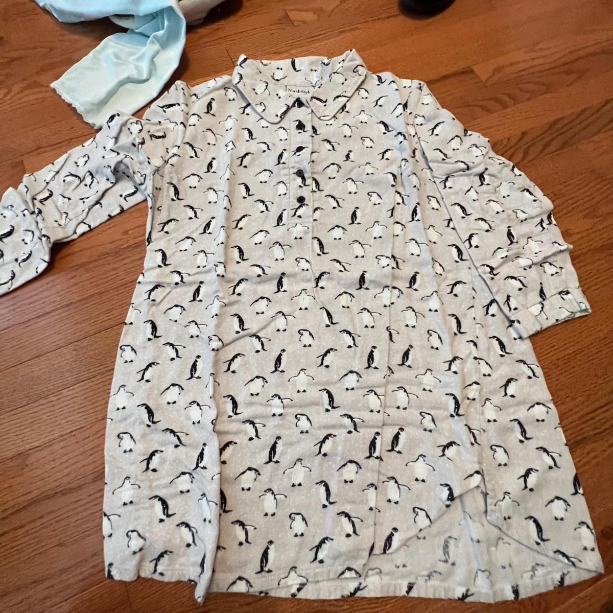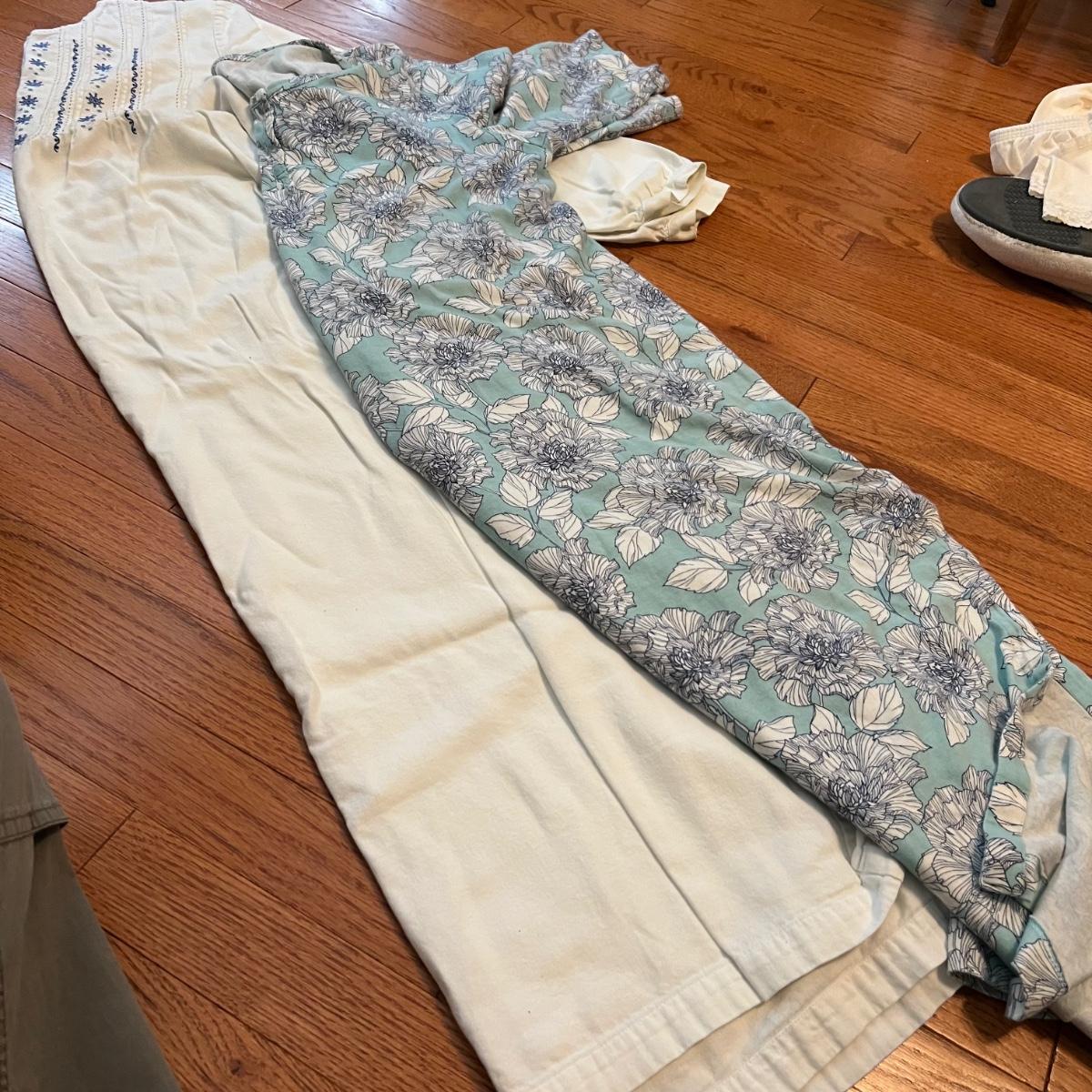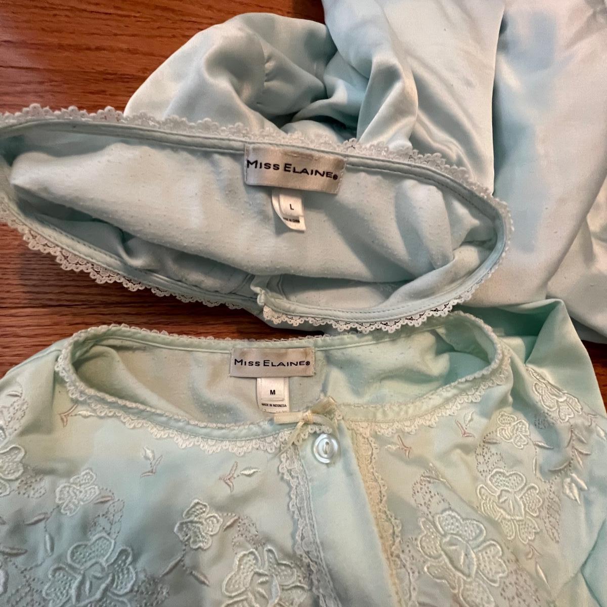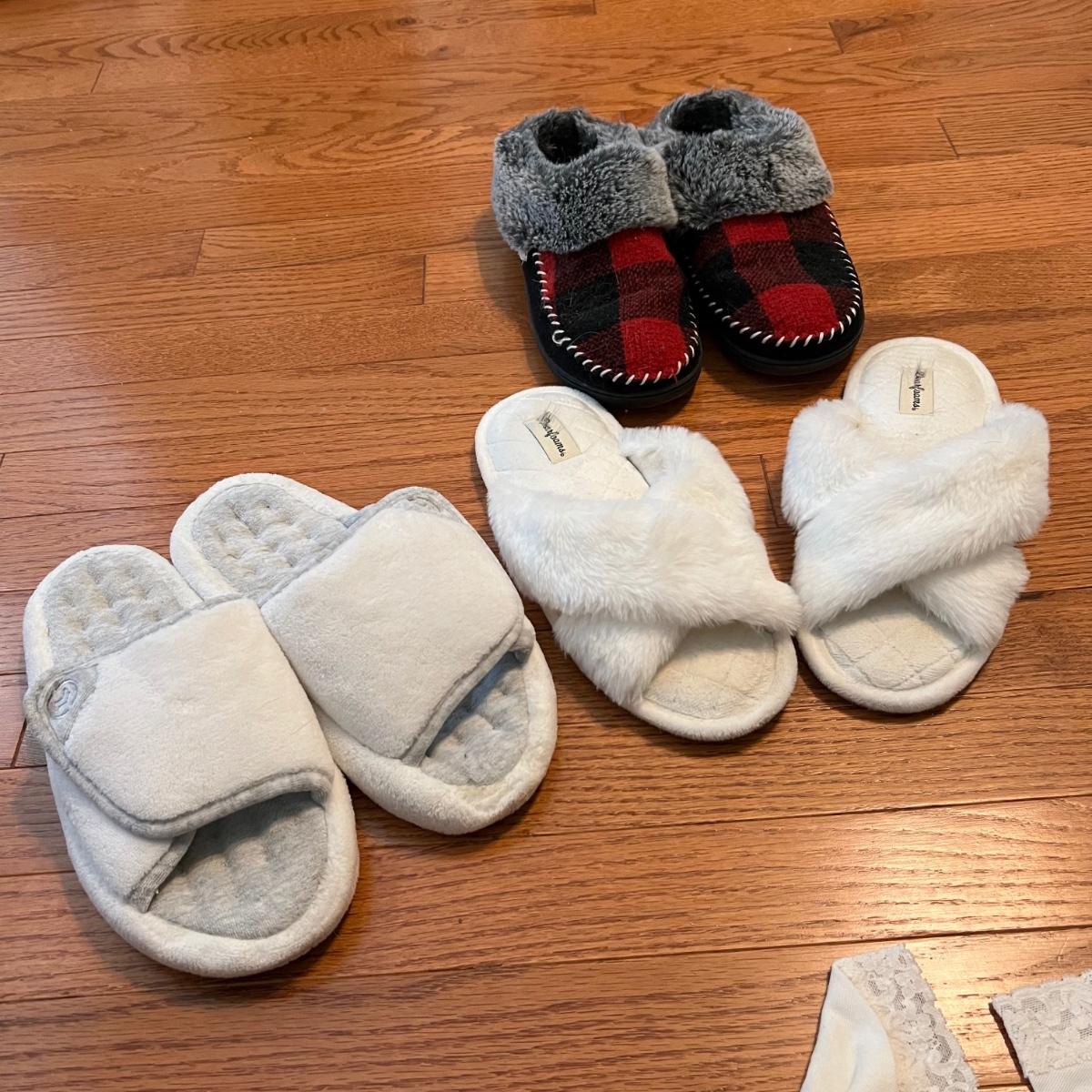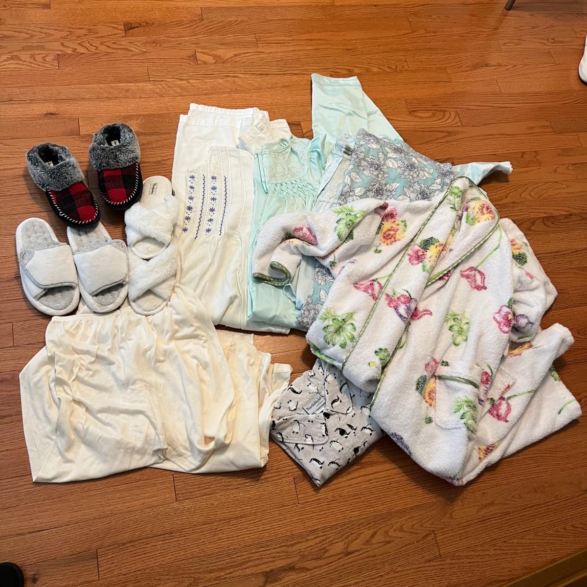 Dressing gown, night gowns, slippers and more in this sleepwear lot. Three pairs of slippers are size medium and the clothing is a mix of medium and large. The two piece pajamas has no size label but as it’s stretchy would assume it’s M/L.