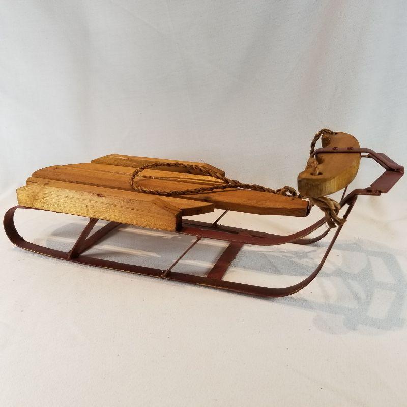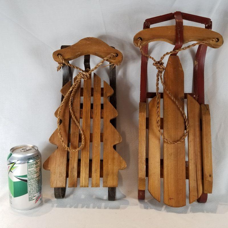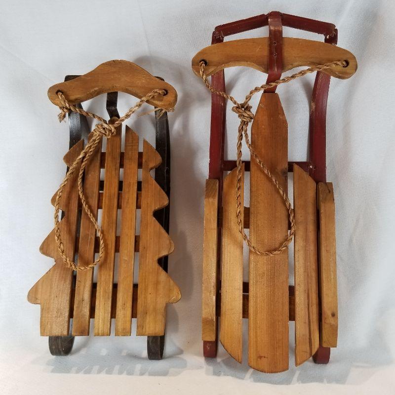Two very nice small wood and metal toy sleighs. Great for the little ones to put their dolls on and take for a sleigh ride or to decorate for the Holidays. The smaller one that is cut to resemble a tree is very cute. Metal runners show some wear from use but overall in very good condition,