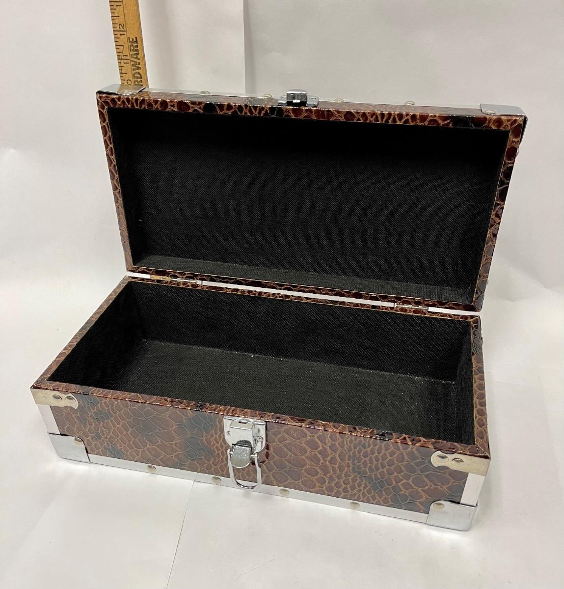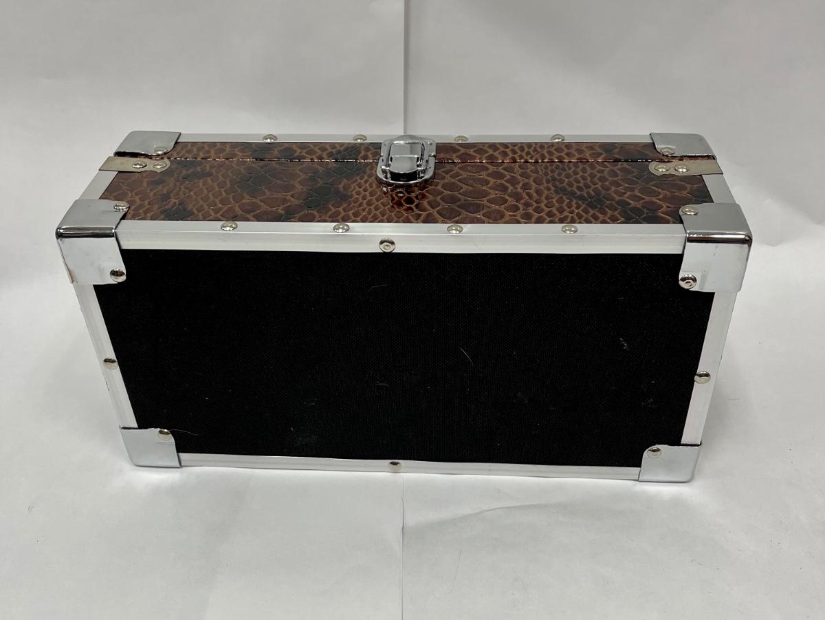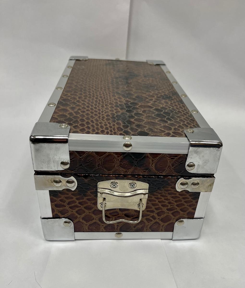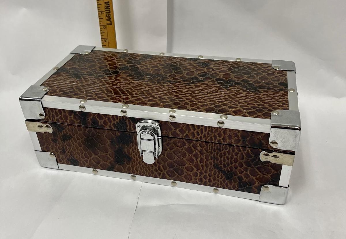 Slender faux snakeskin train case box. Latch closure with metal edge details. Single handle on one end. Skinny box may have been a CD holder or something of similar use. Good condition.