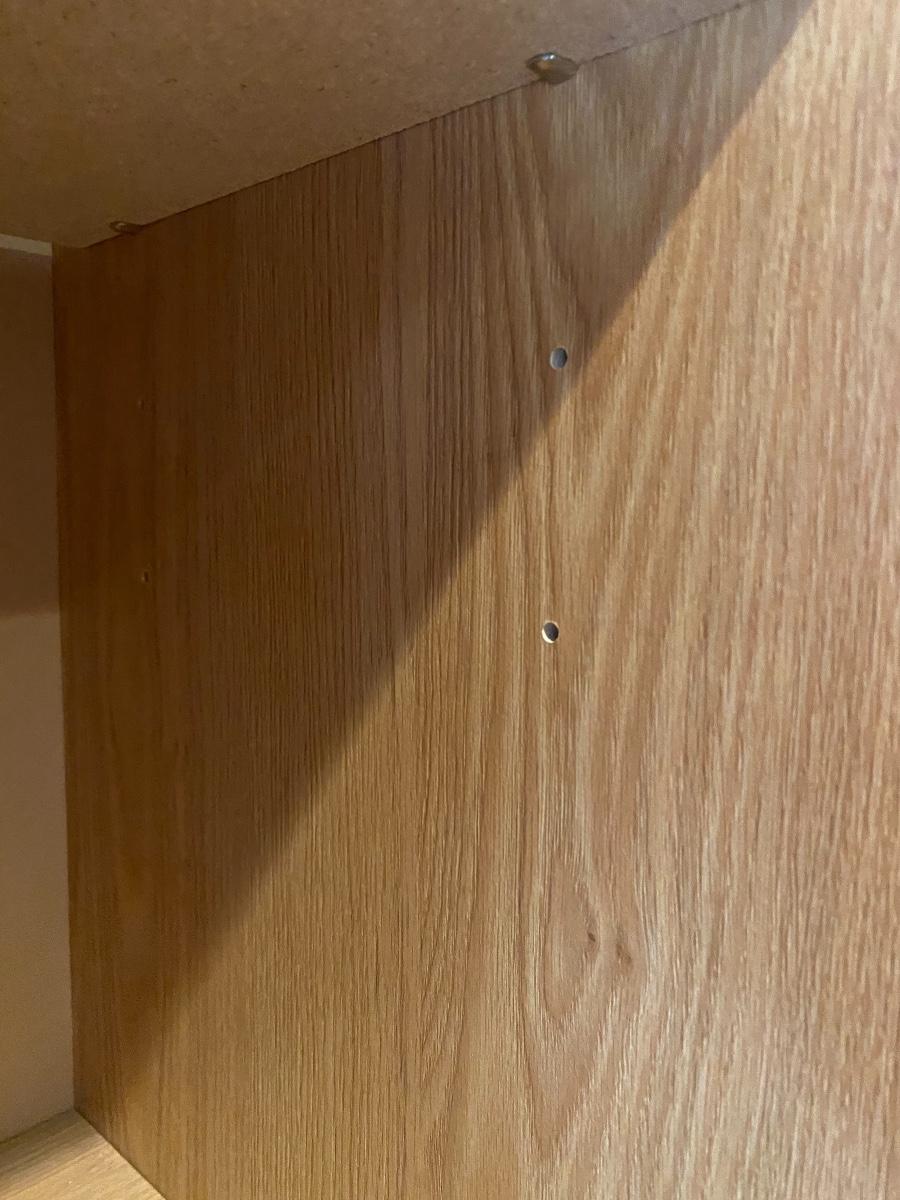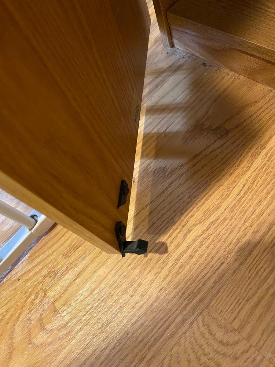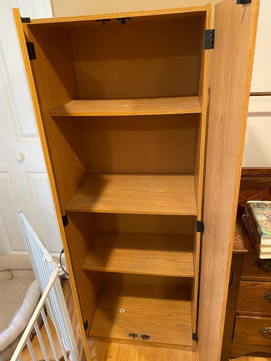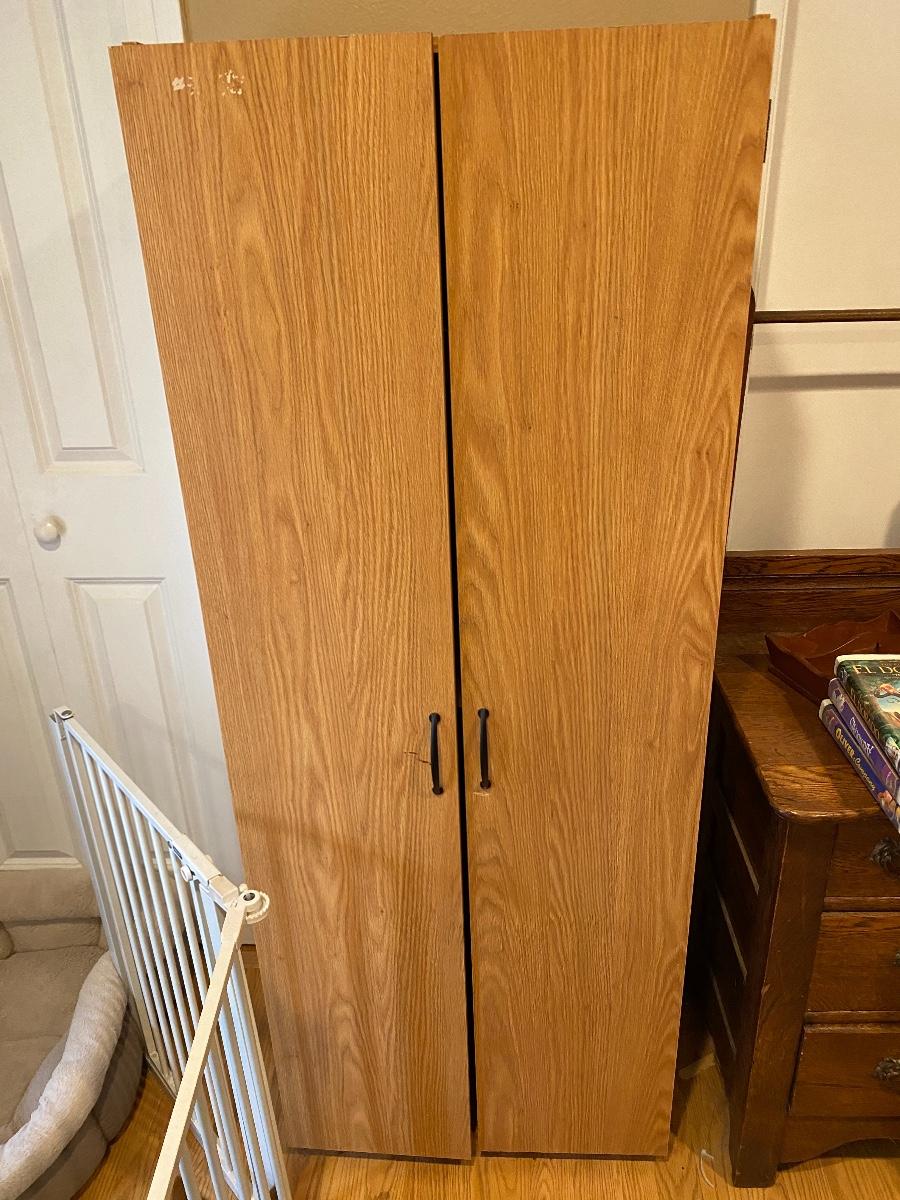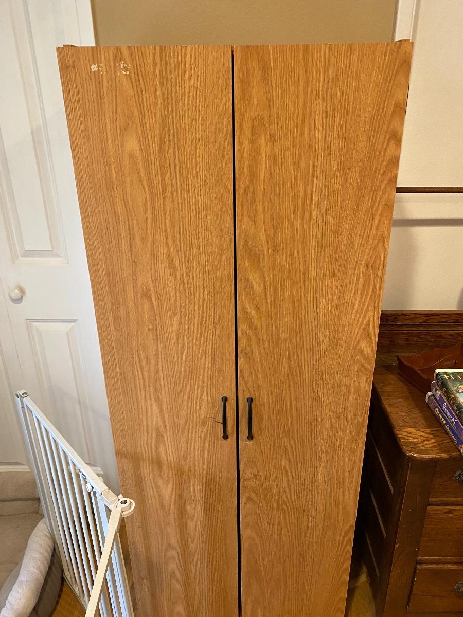 Slender wood cabinet. Adjustable shelves. The latch on one door is broken. About 5’ tall.
