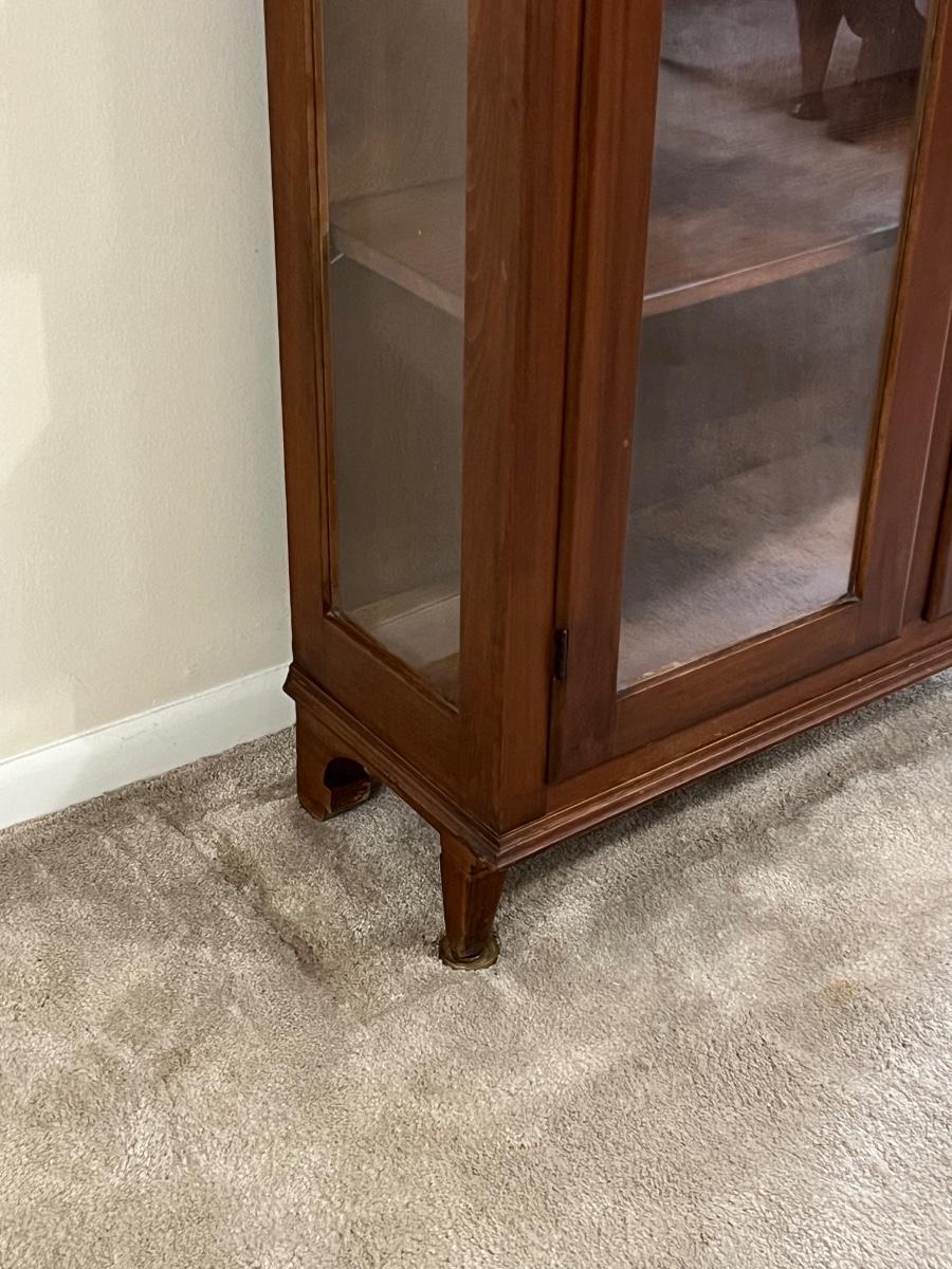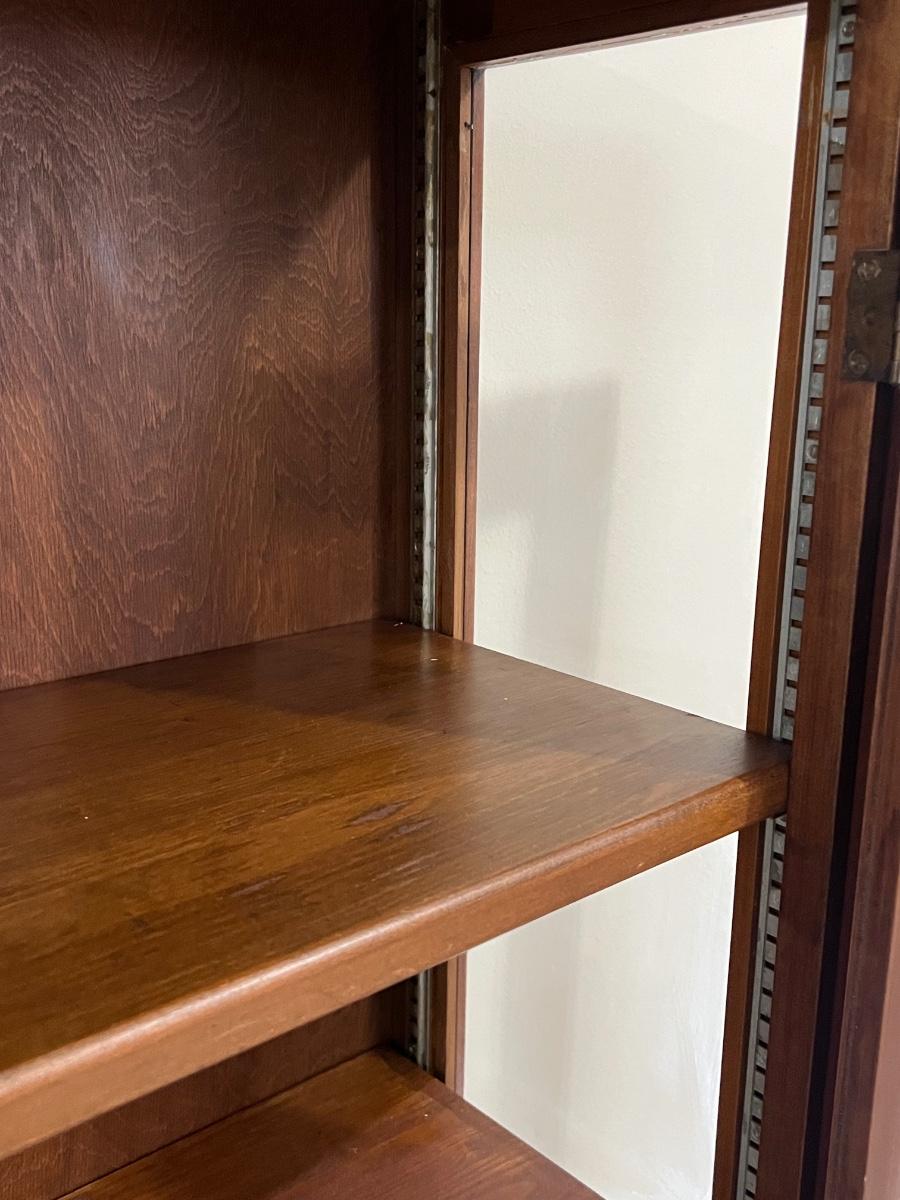 Shelving is adjustable ~ No brand ~ No key ~ It is top heavy, it does need to be leveled ~ 1 side glass panel is a bit loose, just needs minor repair ~ 59.5” H x 37” D x 12.5” D ~ Because there is no key, the doors open up, due to being unlevel ~ I would suggest purchasing some magnetic closures to keep the doors closed. ~ A little TLC and this charming piece would be great!