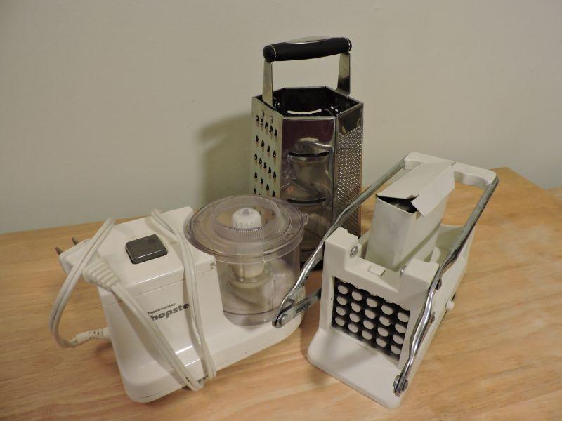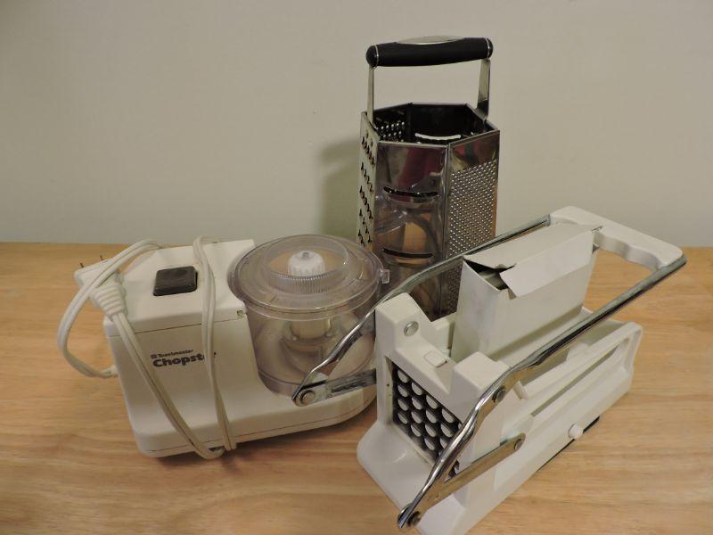 This set includes a mini chopper, a french fry press, and a six-sided grater. **Please read Terms and Conditions before placing a bid. Pick up is Thursday, August 15, 2019 from 4pm to 7pm or Sunday, August 18 from 11am-2pm in Mullica Hill. All sales are final. All sales are as is, where is. Please review all photos. Any props included in photos are not included in listing. All measurements are approximate.
