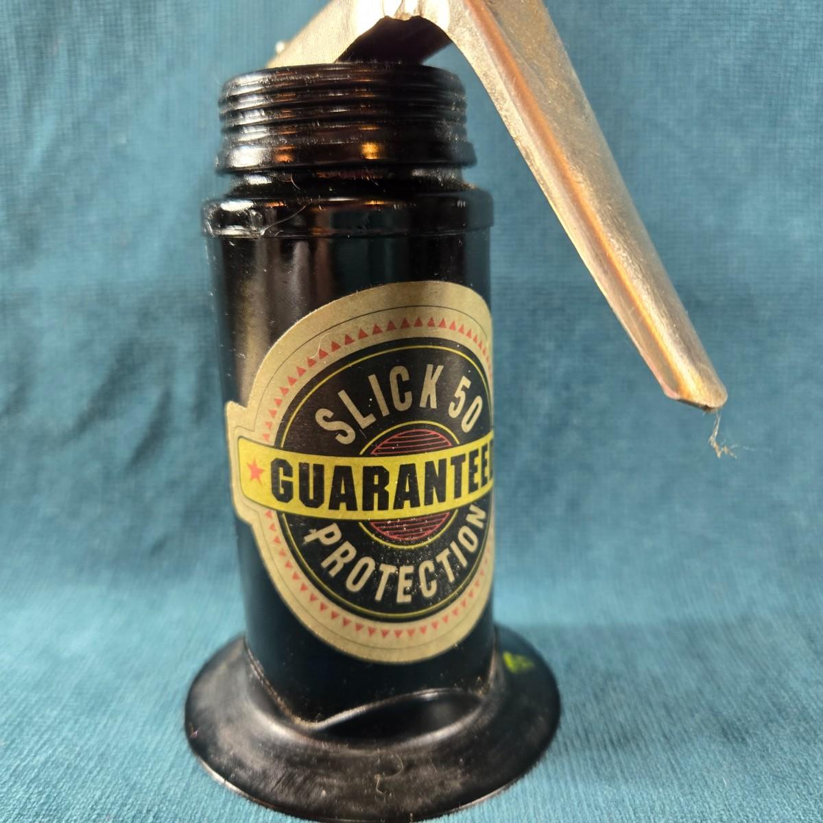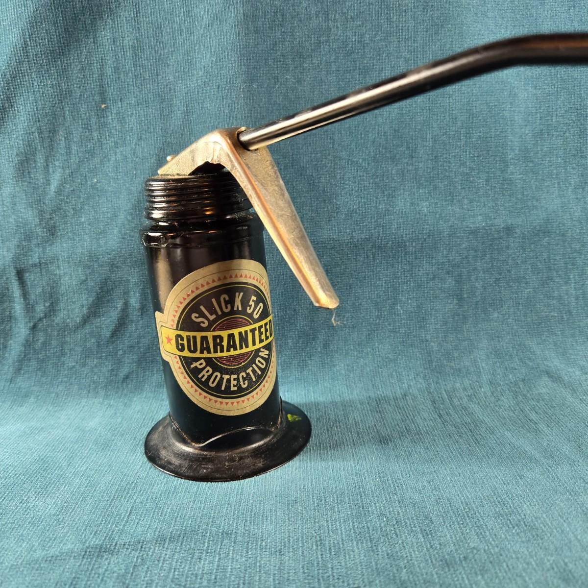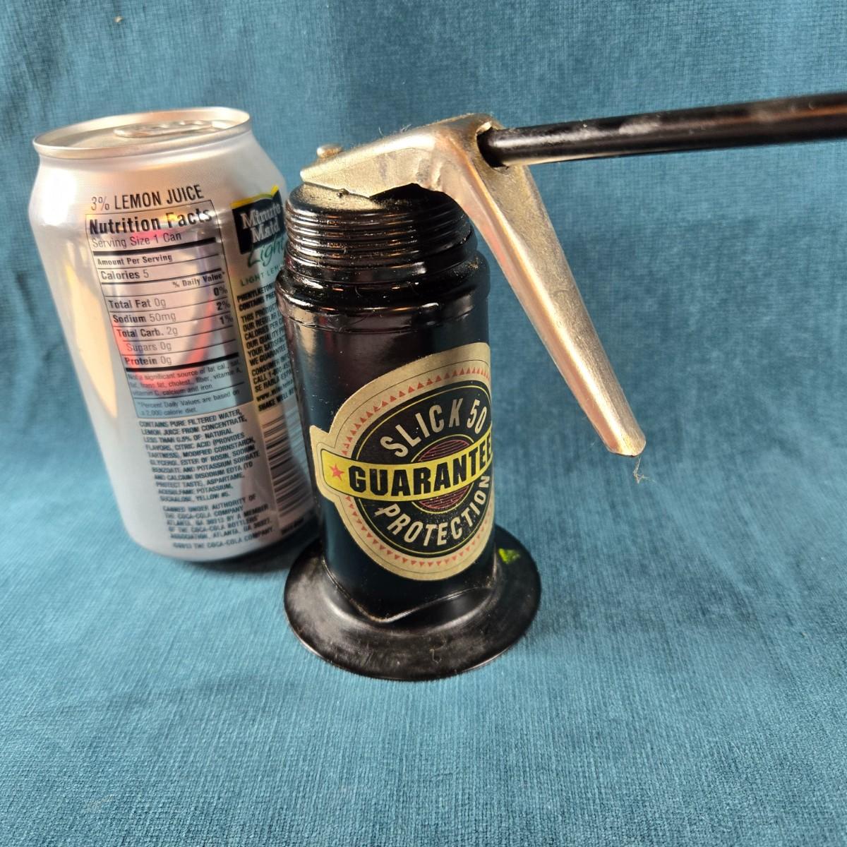 This auction lot is for a Slick 50 Protection Oil Can. This can is a prize amongst those who collect specialty cans and containers - has a clean slick look that mimics the original contents. It measures about 3-inches in diameter x 4-1/2-inches tall - piston grip oiler. No contents. It's in really good shape.