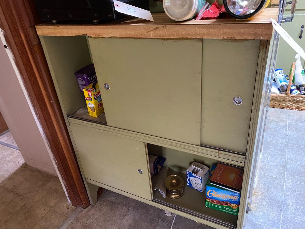 LOT 419 Sliding Door Kitchen Shelf w/ Contents As Pictured
