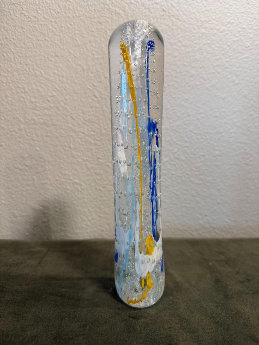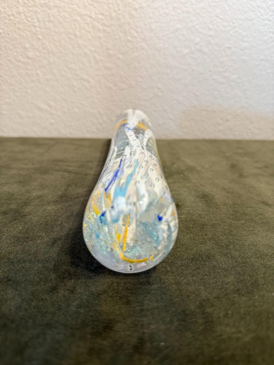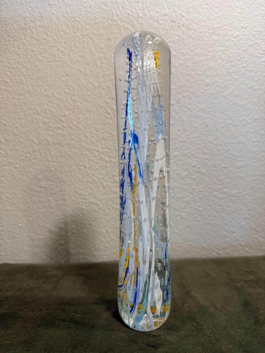 Pre-owned. 8.3/4in Tall Slim Column Style Paperweight with Streams of Color